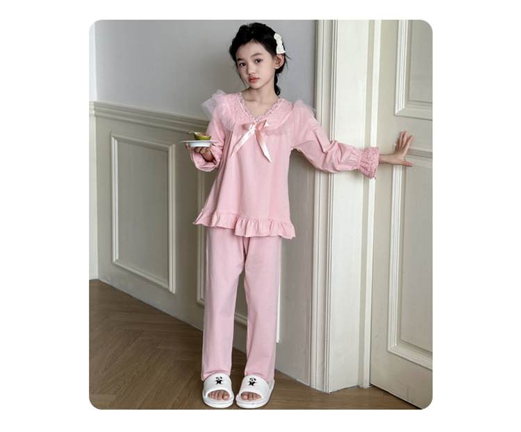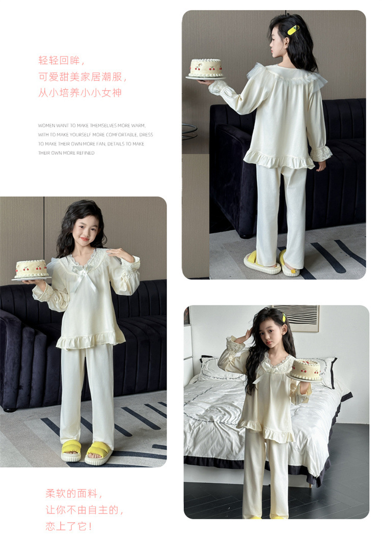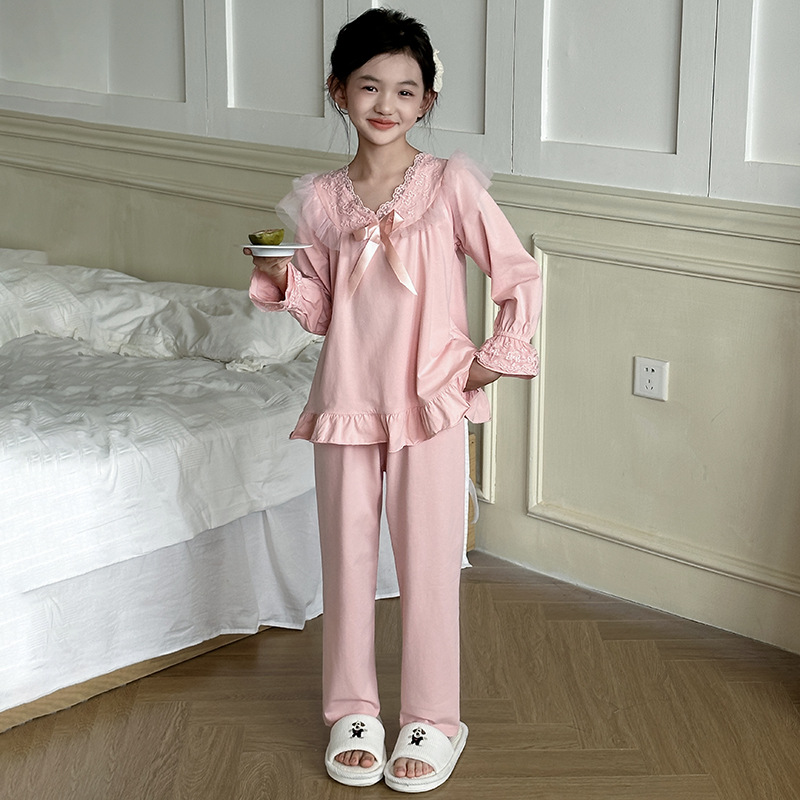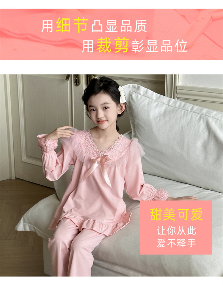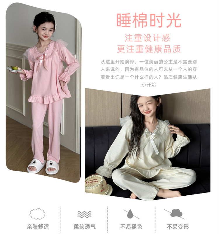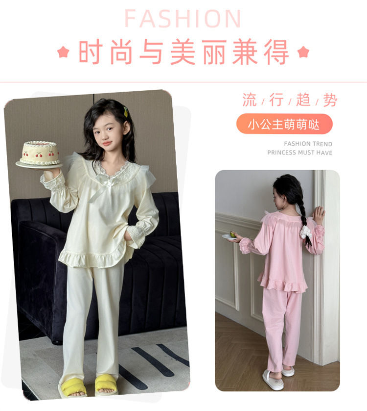 소녀 잠옷 봄과 가을 새로운 어린이 공주 레이스 스타일러스 캐주얼 소녀 홈 옷 세트 후 저우 질리