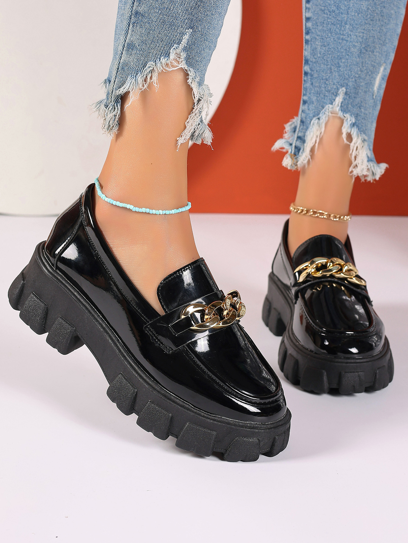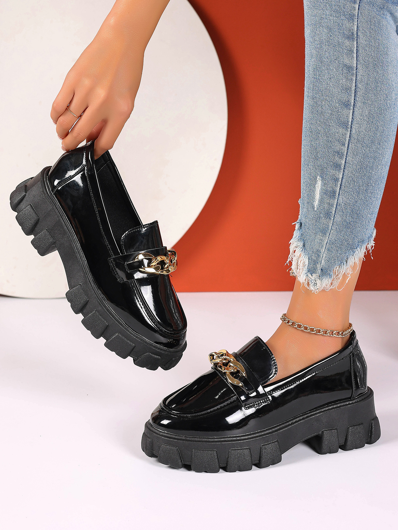 厚底粗跟英伦风百搭小皮鞋女2024新款冬季复古金属扣一脚蹬乐福鞋