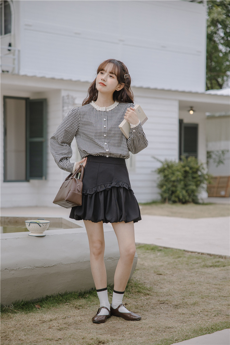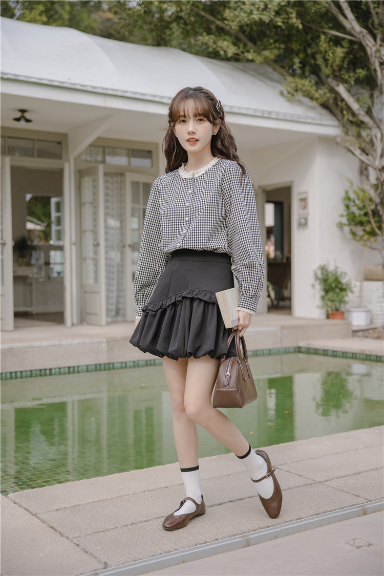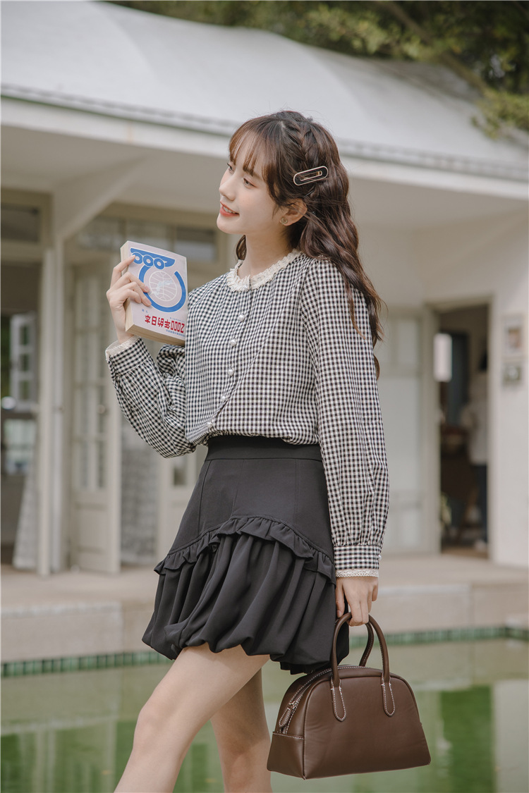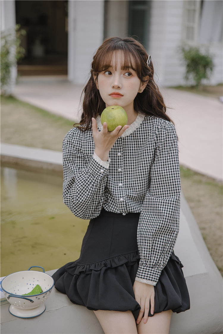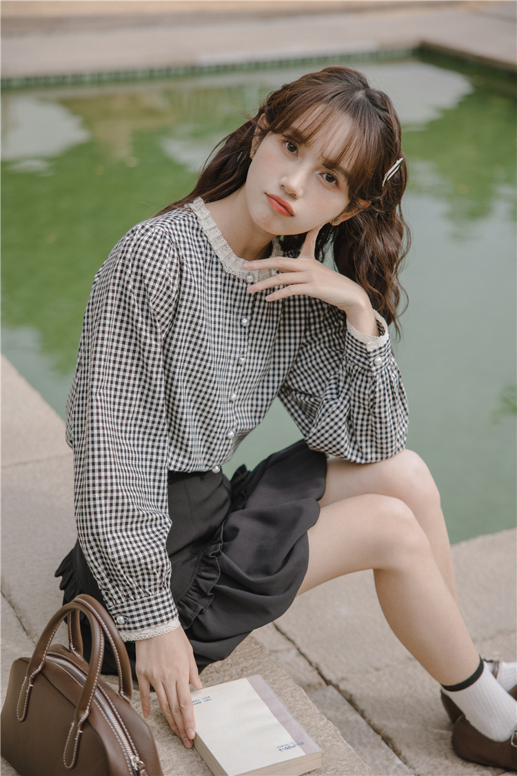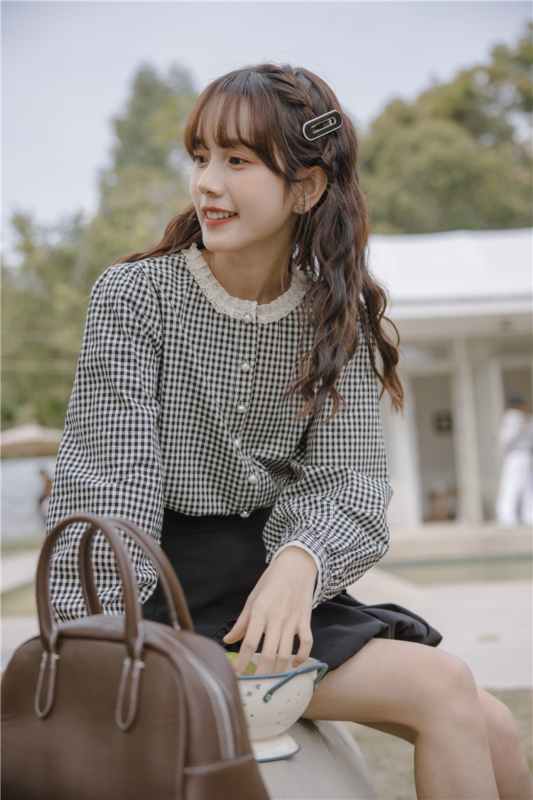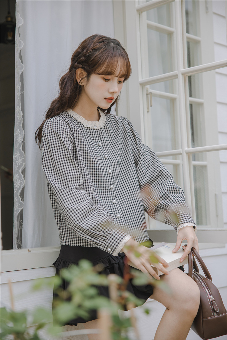 2025 봄 새로운 프랑스 스타일 세련된 레이스 크루 넥 스티칭 디자인 복고풍 격자 무늬 셔츠 긴 소매 탑스토어 가기