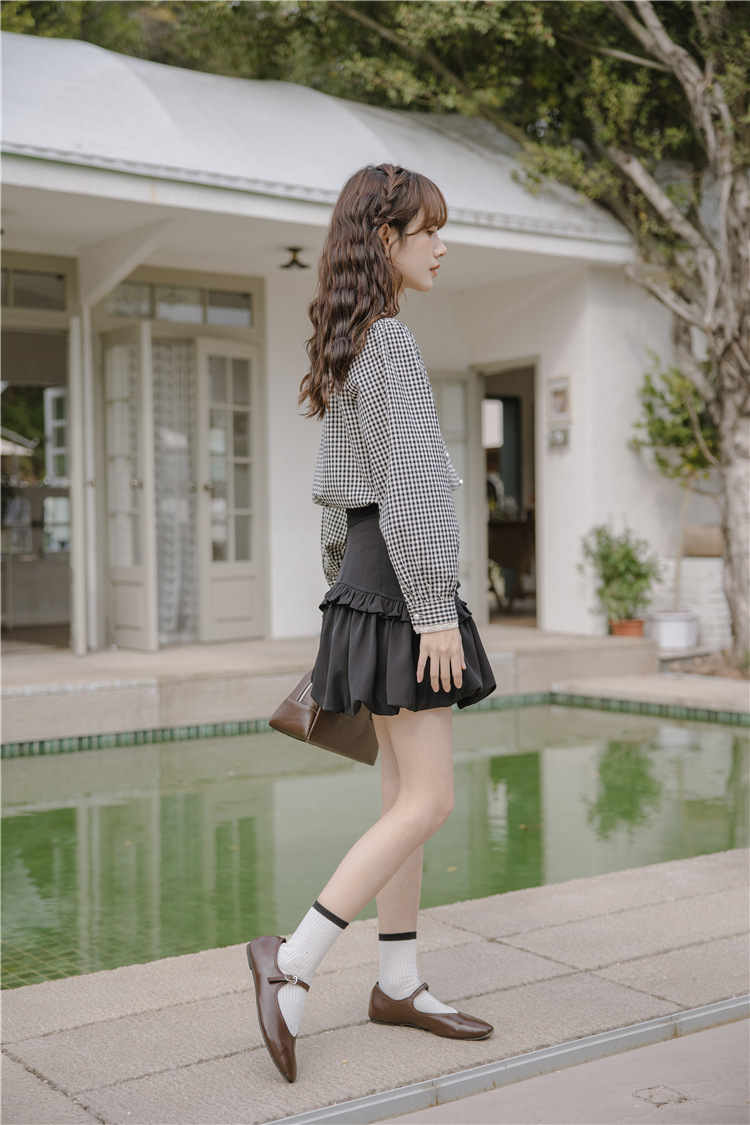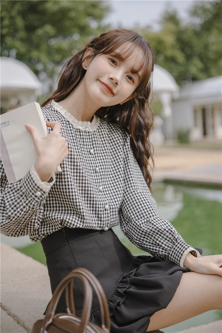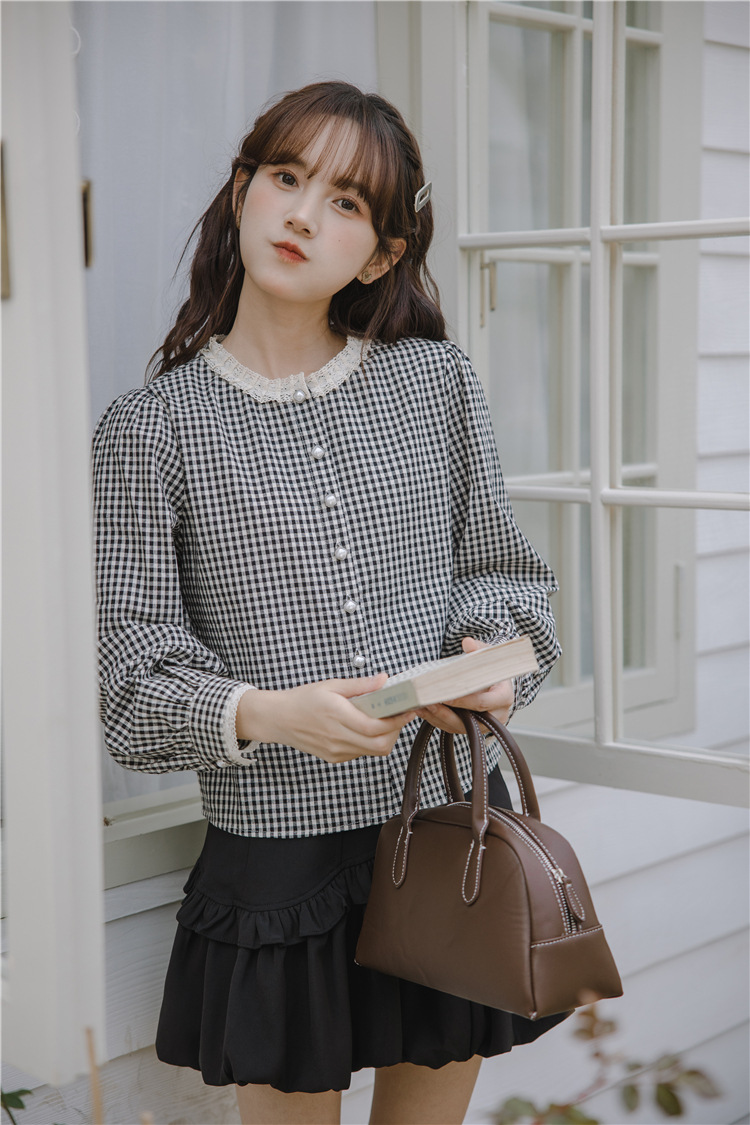 2025 봄 새로운 프랑스 스타일 세련된 레이스 크루 넥 스티칭 디자인 복고풍 격자 무늬 셔츠 긴 소매 탑