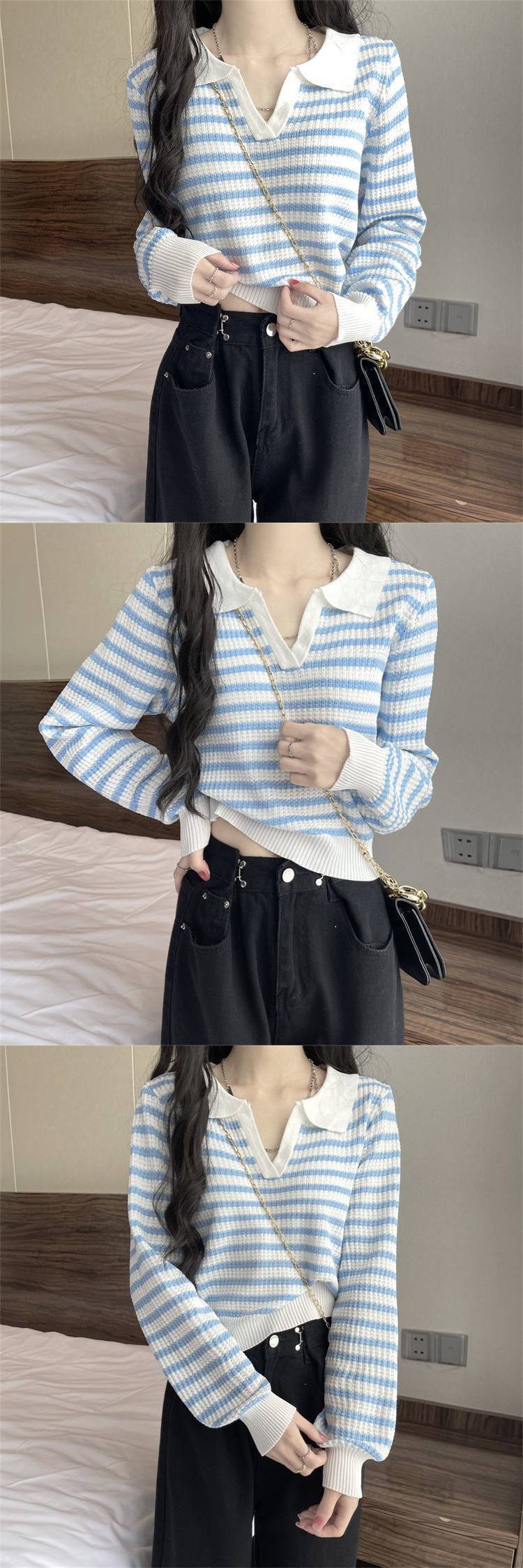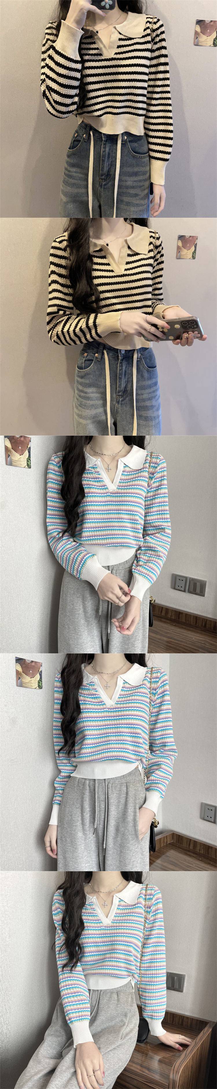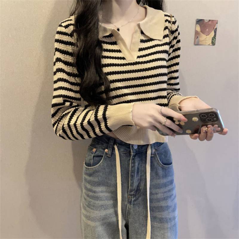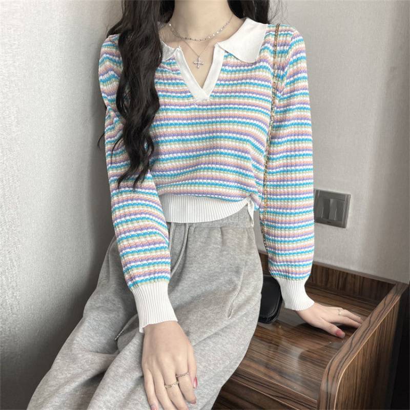 봄 봄 스웨터 여성의 2025 새로운 컬러 스트라이프 칼라 긴 소매 부드러운 착용 슬리밍 탑