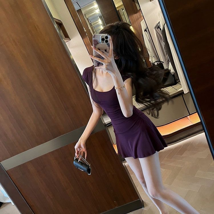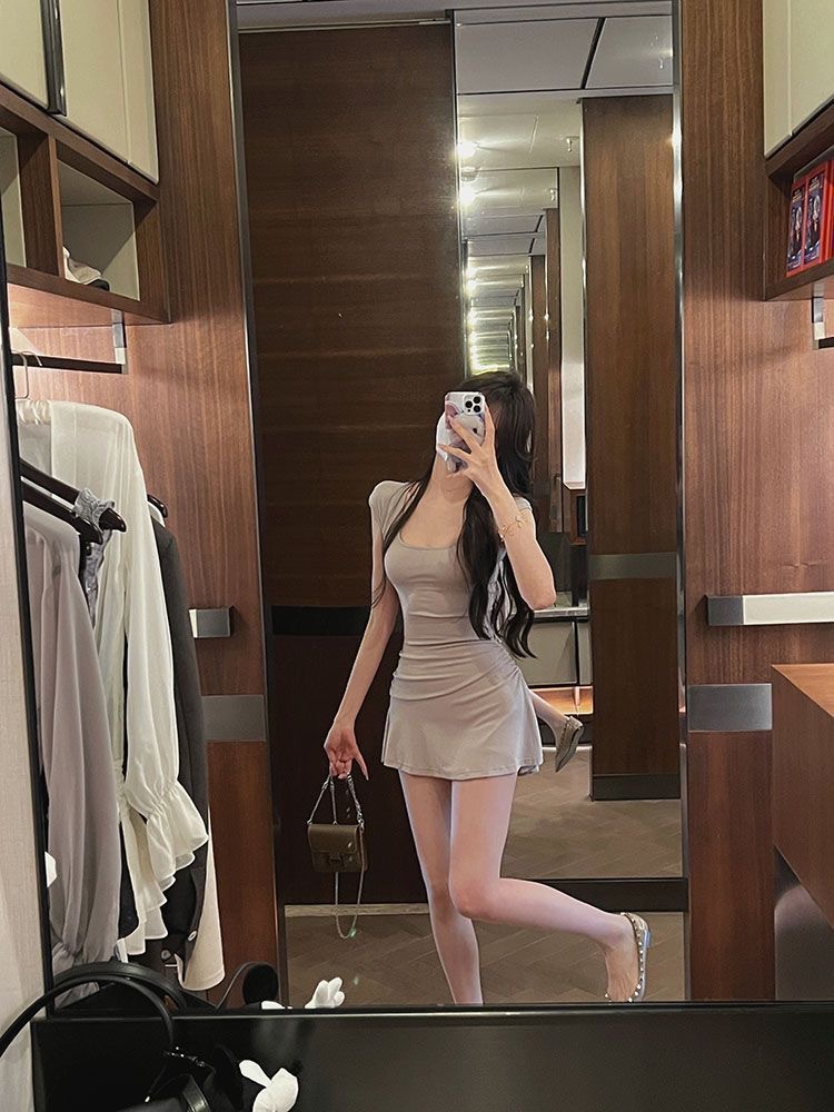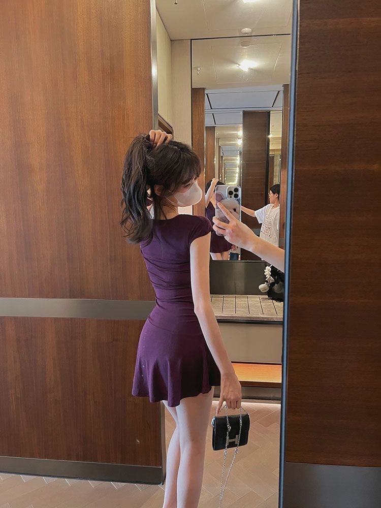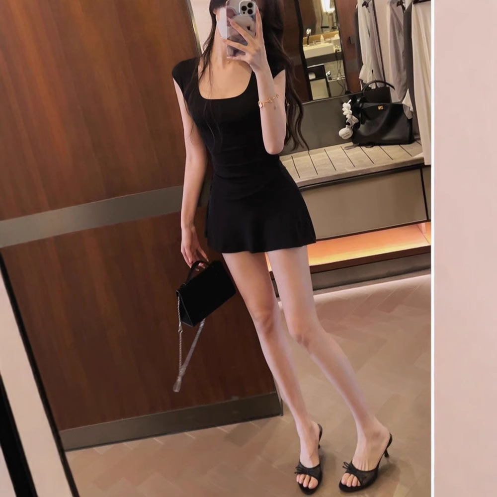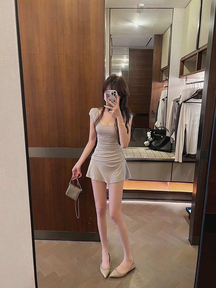 U-넥 반소매 원피스 여성 2025 년 여름 새로운 온라인 인기있는 순수한 욕망 A-목 짧은 외주 치마를 입고스토어 가기