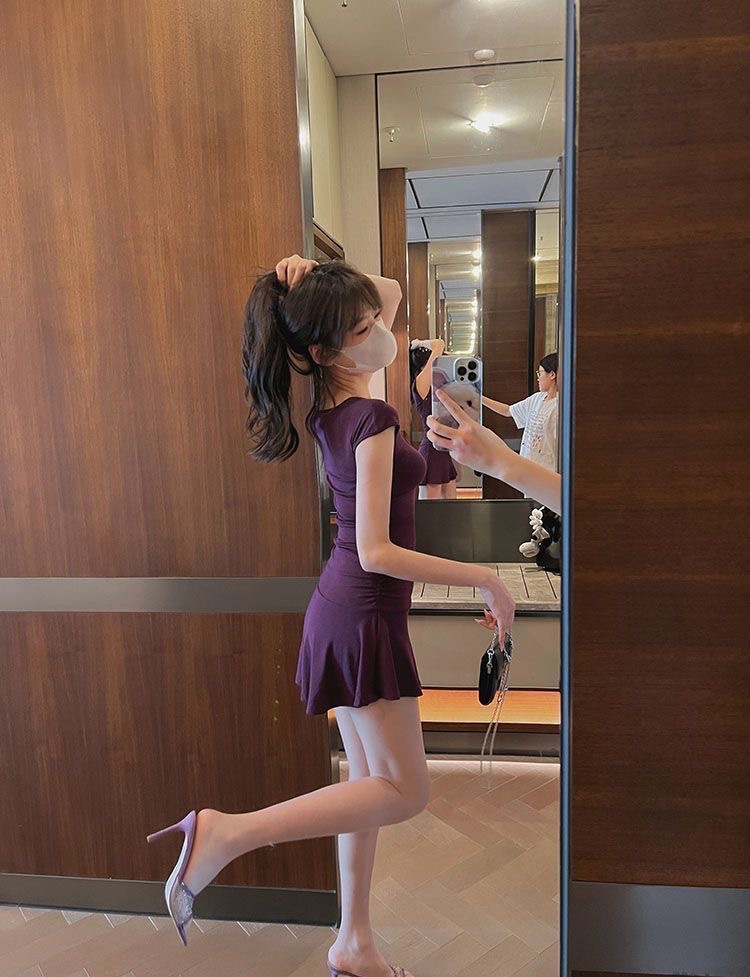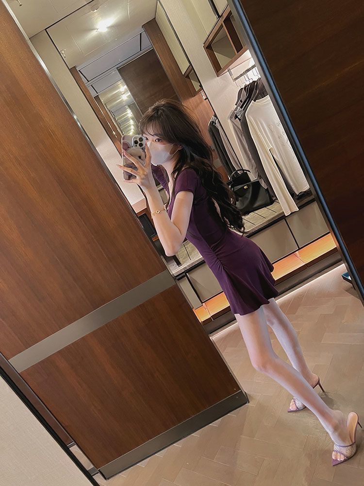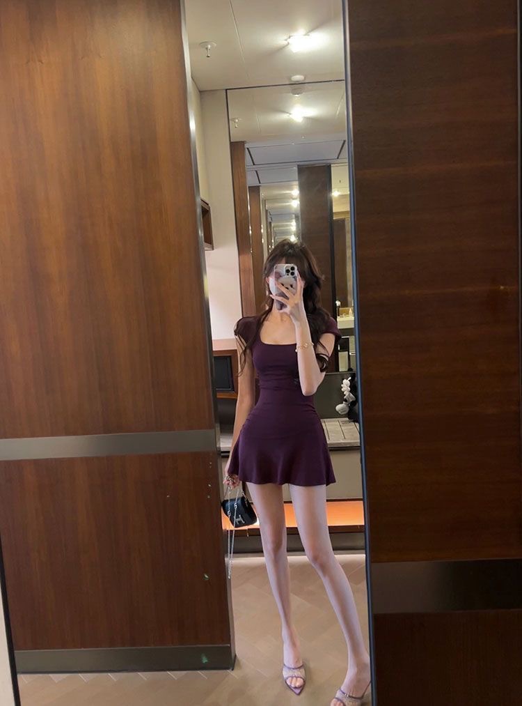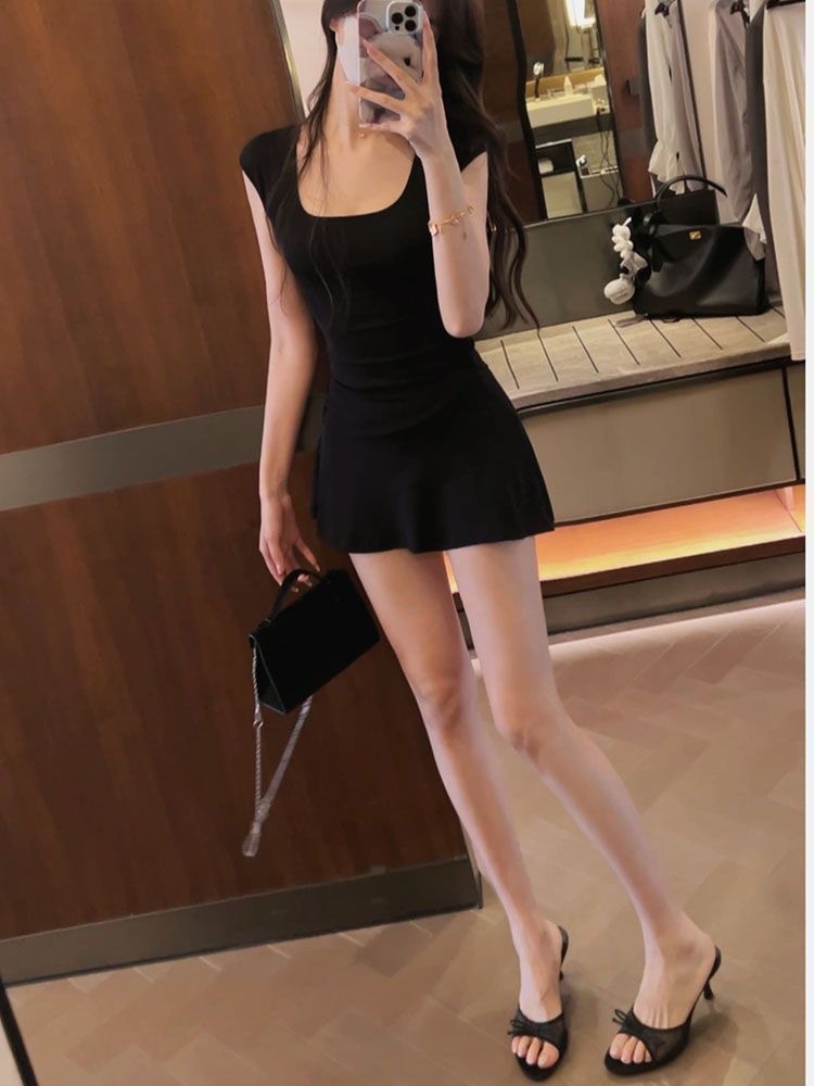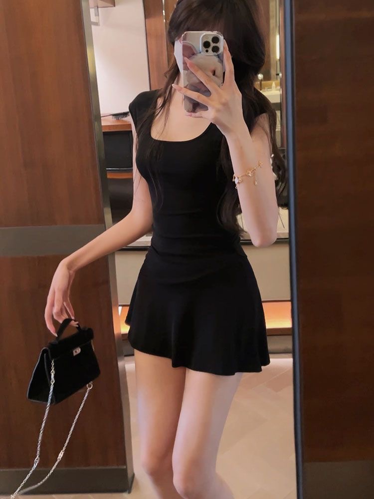 U-넥 반소매 원피스 여성 2025 년 여름 새로운 온라인 인기있는 순수한 욕망 A-목 짧은 외주 치마를 입고스토어 가기