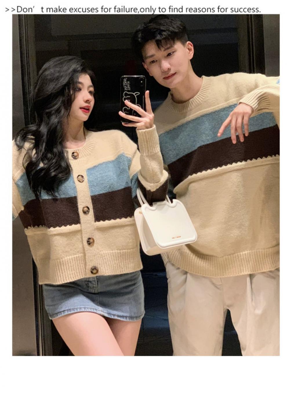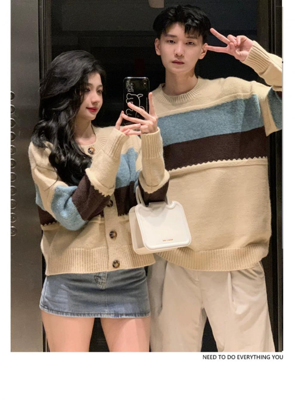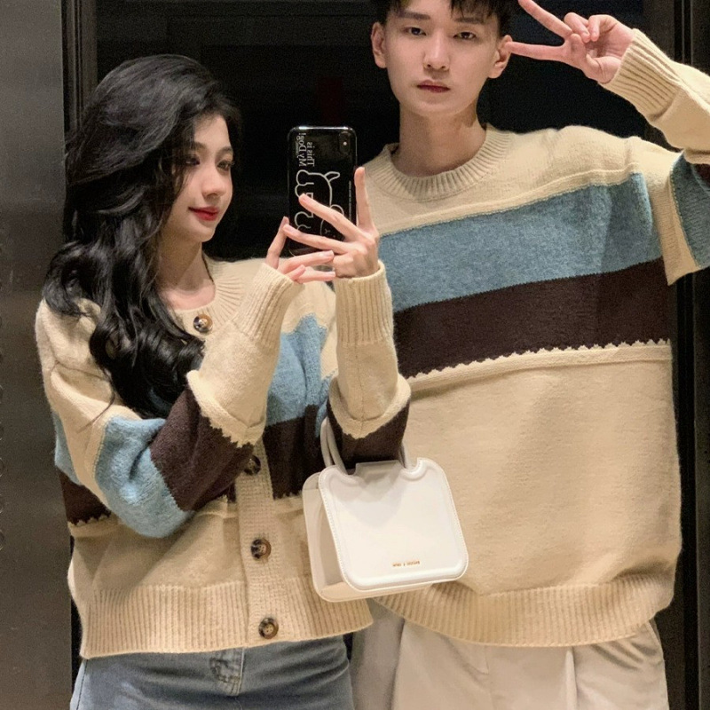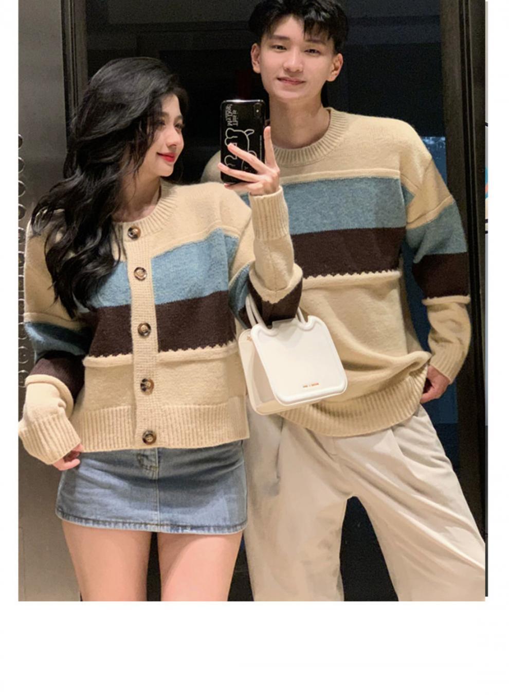 커플의 가을과 겨울 게으른 스타일 Ins 슈퍼 핫 스웨터 프렌치 루즈 스트라이프 디자인 트렌디 니트 카디건