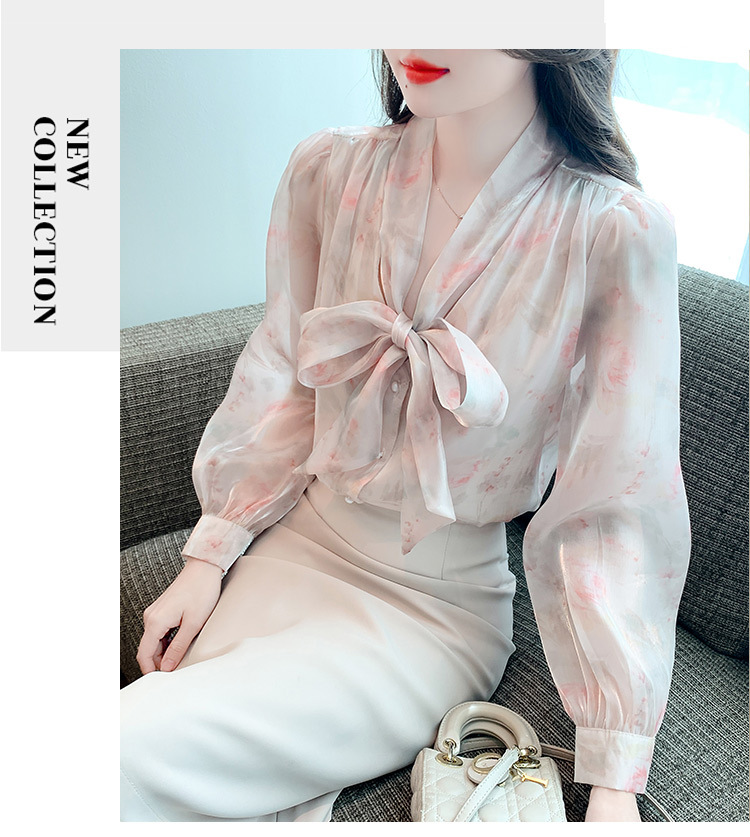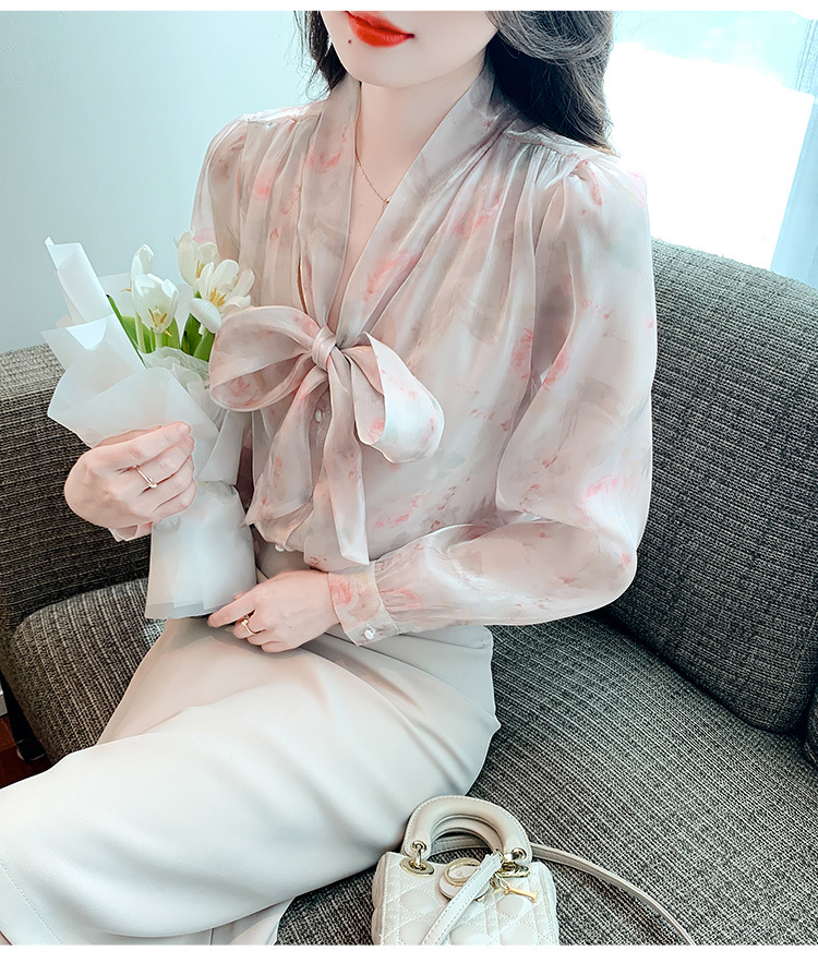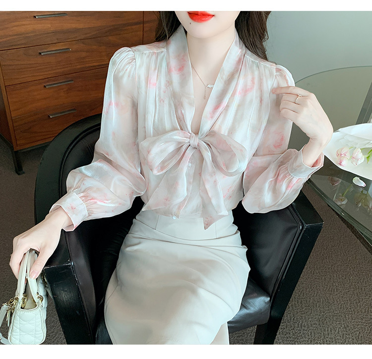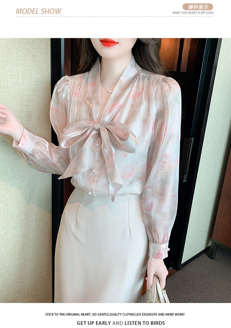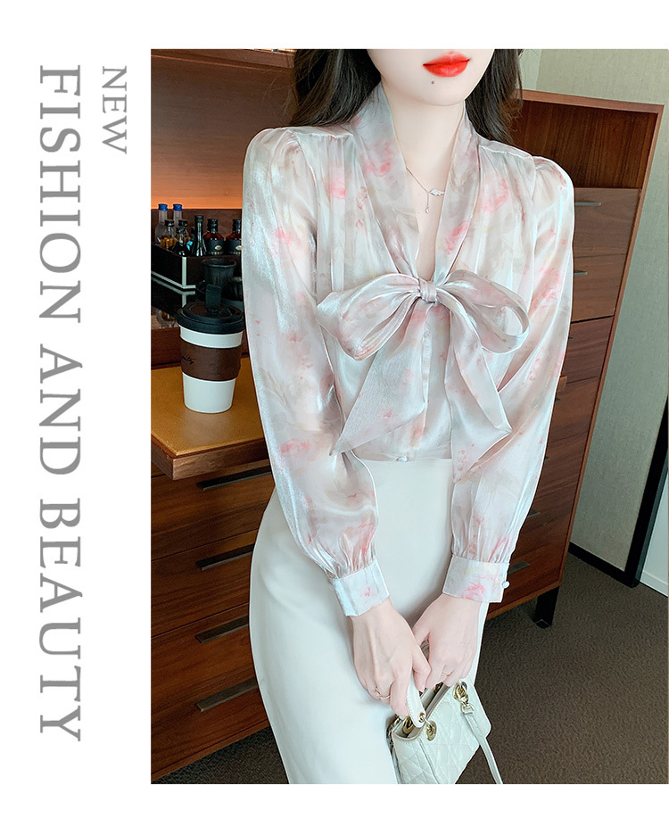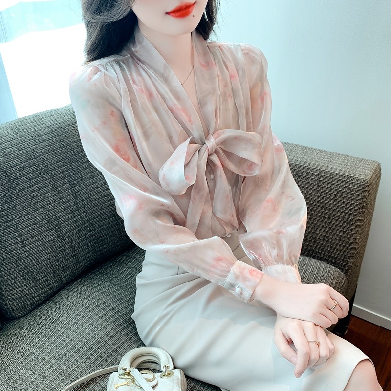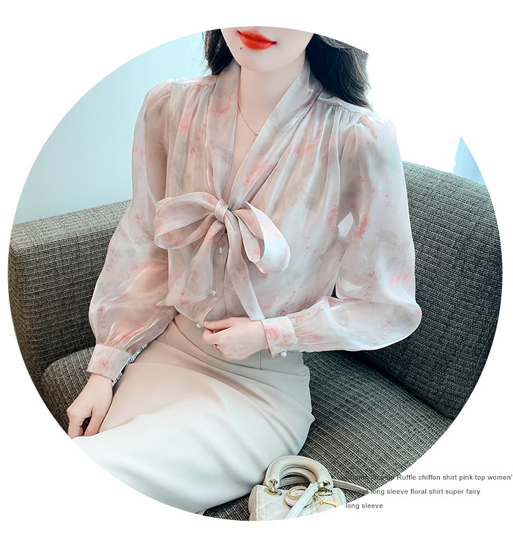 2025 년 이른 봄 프랑스 스타일 가볍게 성숙한 긴팔 레이스 업 보우 꽃 셔츠 여성의 여름 디자인 틈새 쉬폰 탑스토어 가기