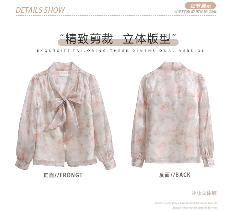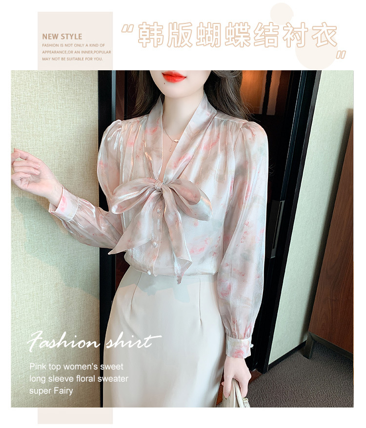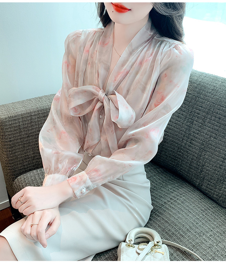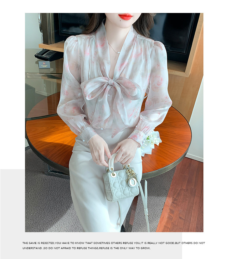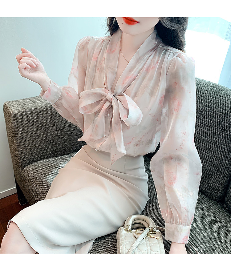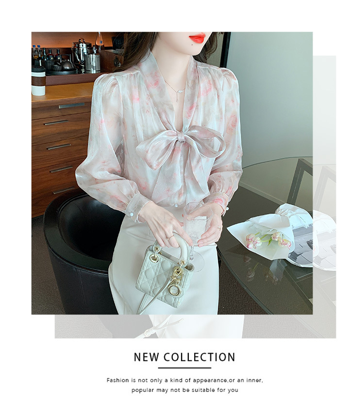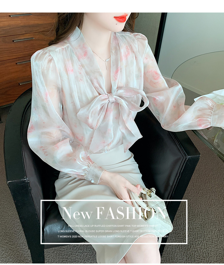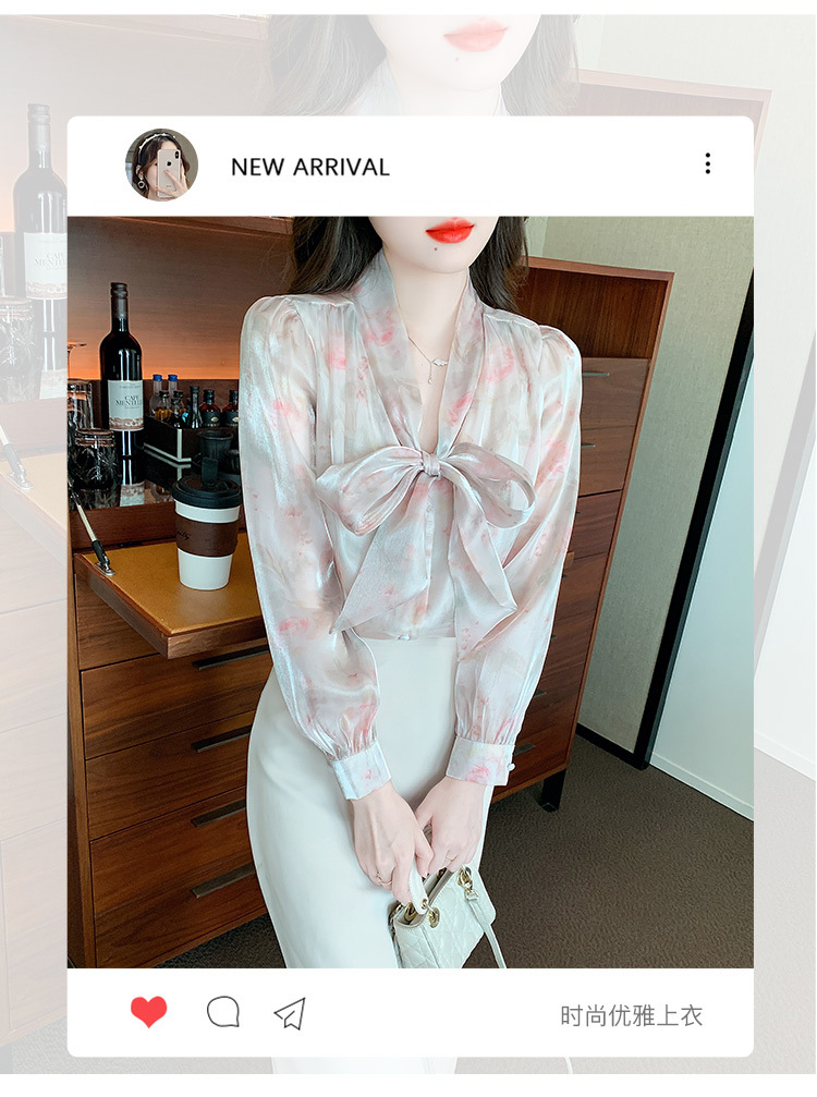 2025 년 이른 봄 프랑스 스타일 가볍게 성숙한 긴팔 레이스 업 보우 꽃 셔츠 여성의 여름 디자인 틈새 쉬폰 탑스토어 가기
