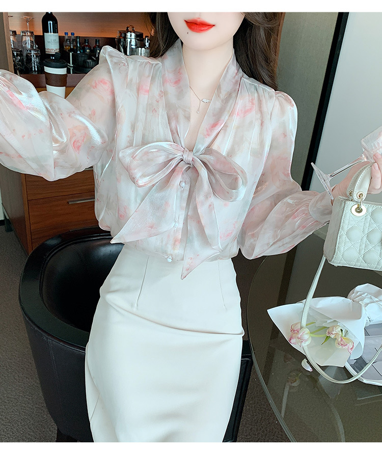 2025 년 이른 봄 프랑스 스타일 가볍게 성숙한 긴팔 레이스 업 보우 꽃 셔츠 여성의 여름 디자인 틈새 쉬폰 탑