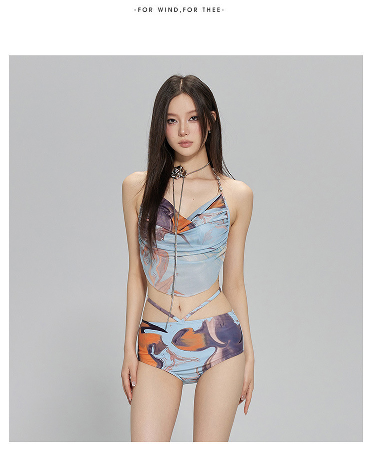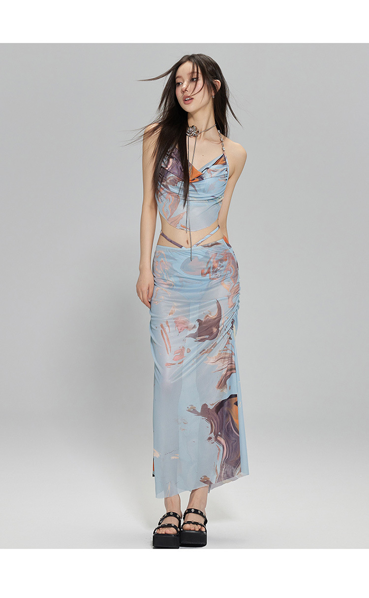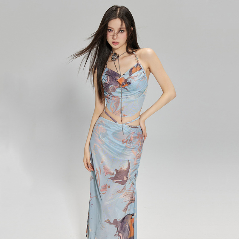 纯欲辣妹泳衣女复古印花吊带性感沙滩长裙三件套海边度假拍照泳装