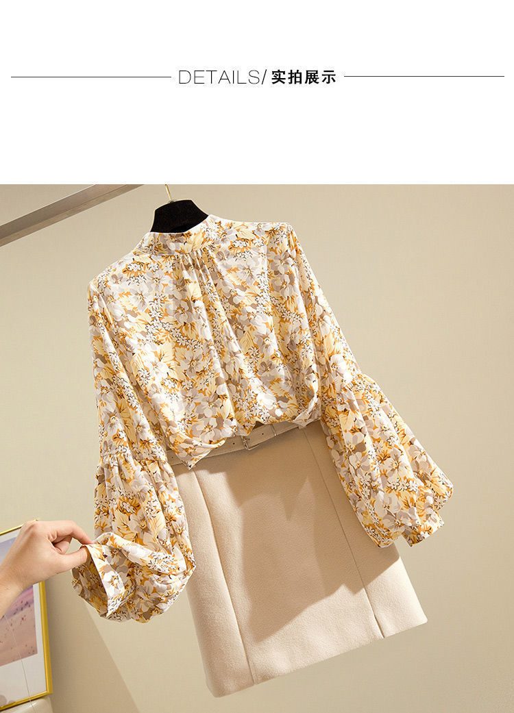 A6C2025 봄과 가을 여자 올매치 우아한 쉬폰 셔츠 느슨한 칼라 작은 꽃 랜턴 슬리브 탑 웨스턴 스타일 라이닝스토어 가기