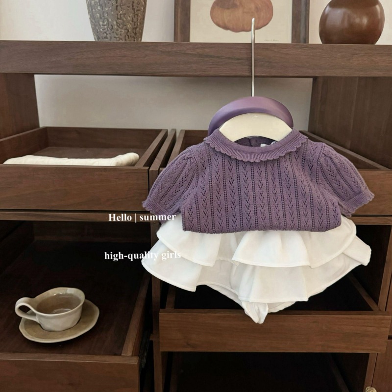2025 여름 아동복 소녀 보라색 발레 아기 소녀 중공 레이스 니트 탑 공주 케이크 치마 세트