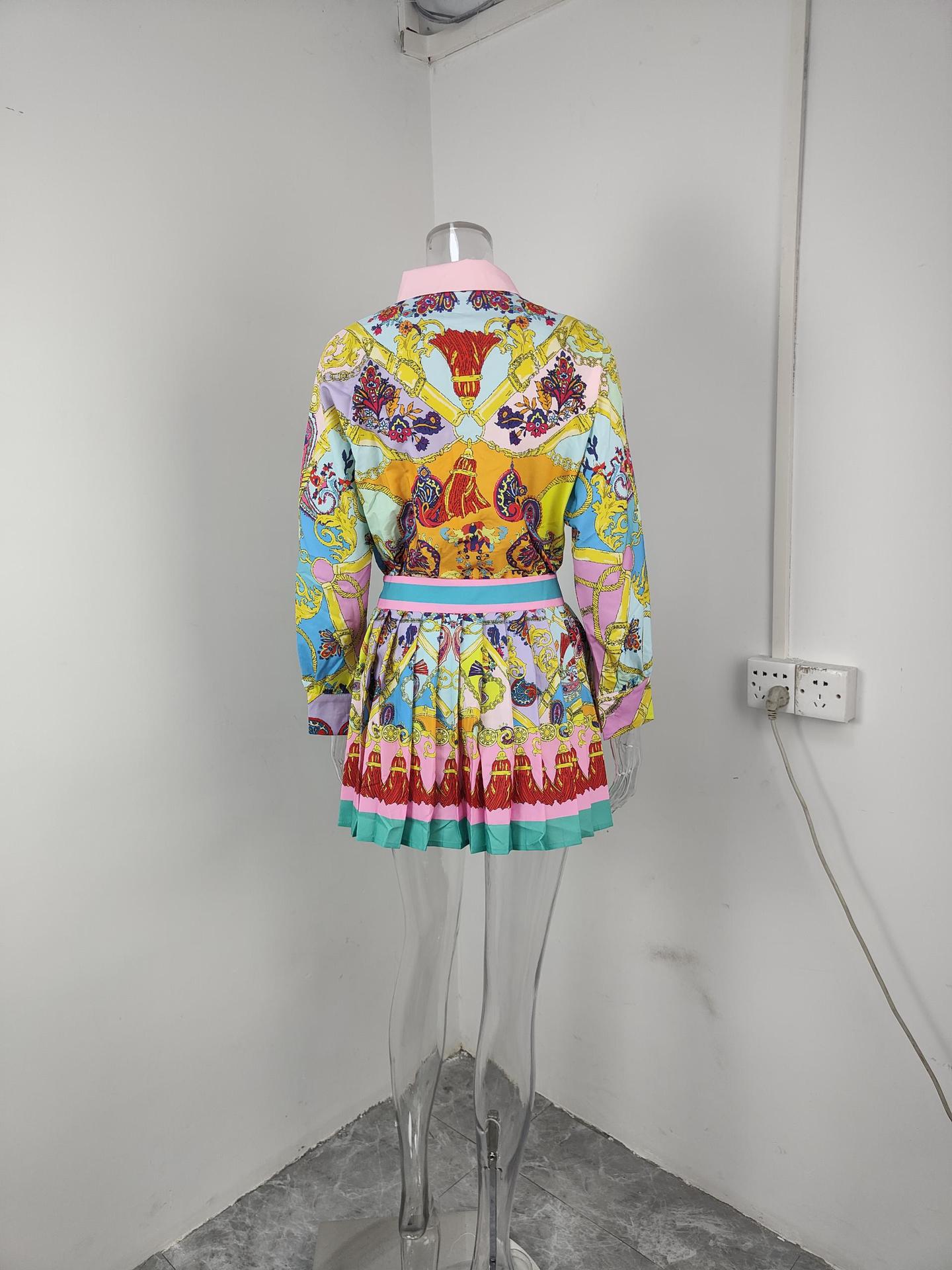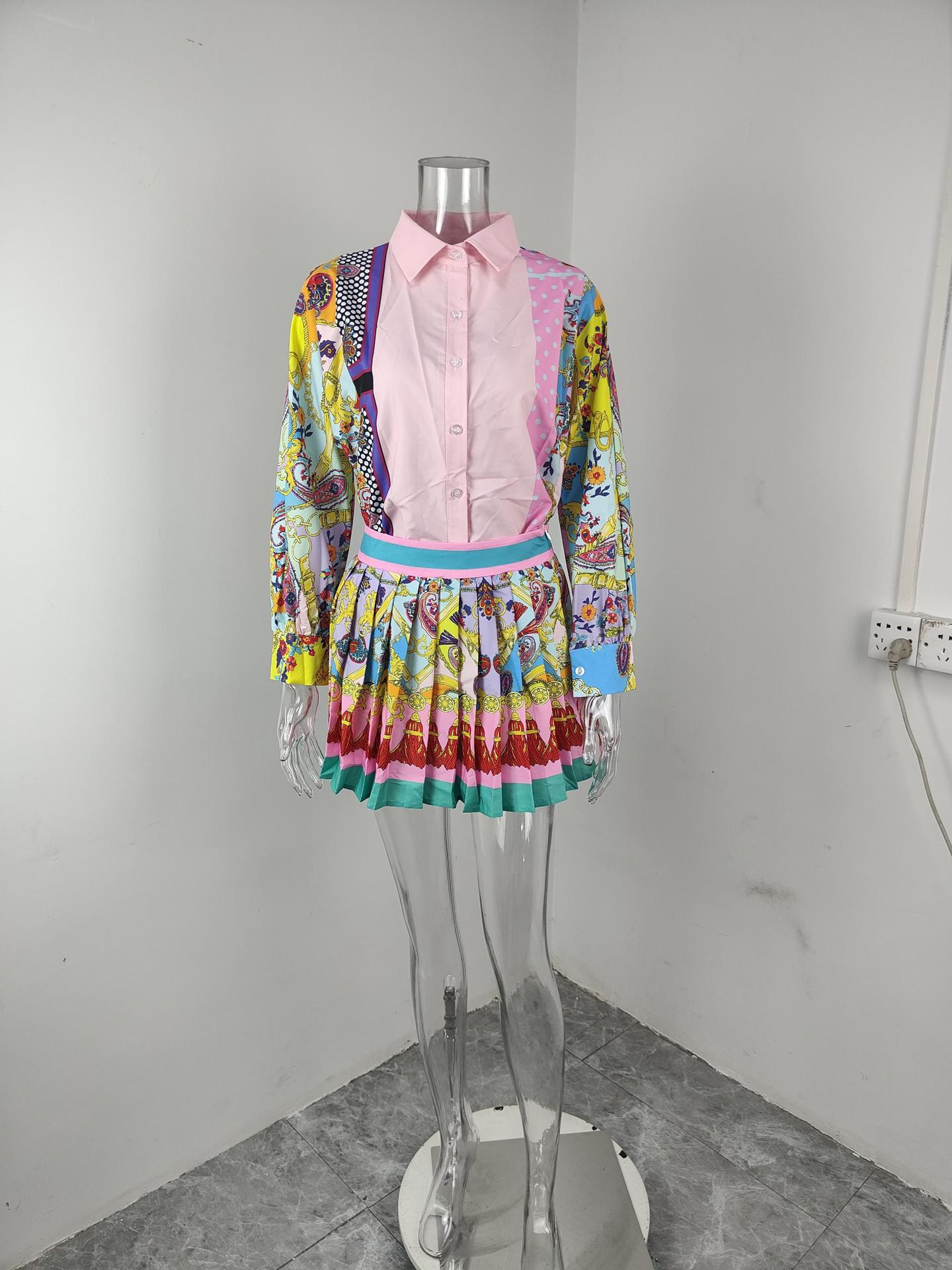 봄 2025 새로운 유럽과 미국의 국경 여성 인쇄 긴 소매 셔츠 탑 주름 치마 세트 여성 투피스 세트