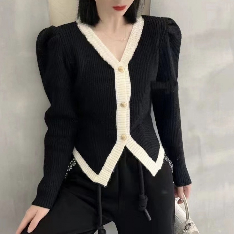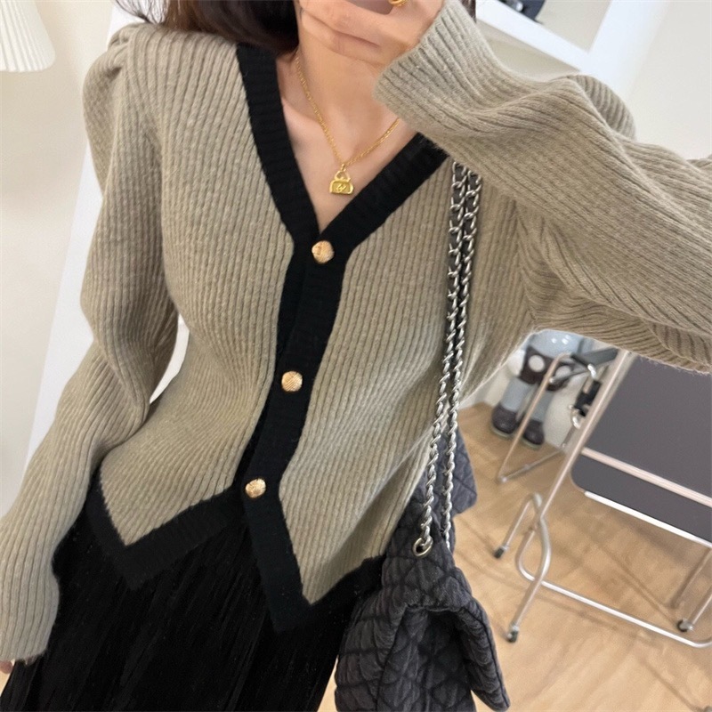샤넬 스타일 코트 여성의 우아한 버블 슬리브 니트 카디건 2024 가을 새로운 디자인 감각 대비 컬러 루즈 탑스토어 가기