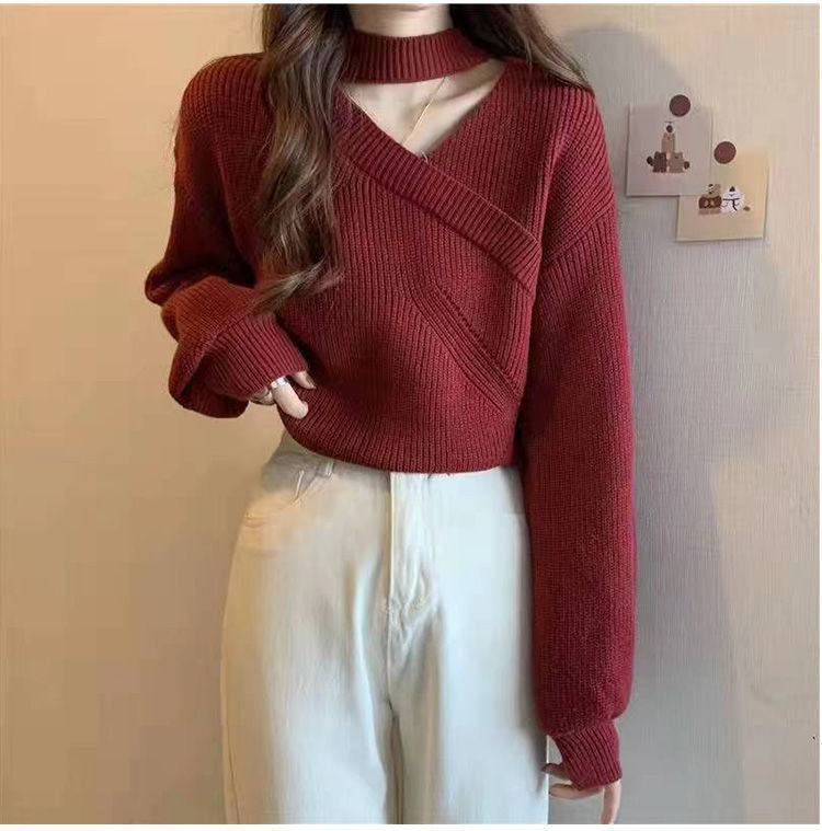 2024 봄과 가을 V-넥 긴팔 걸이 목 할로우 스웨터 여성 한국식 패션 올매치 아우터 입술 넉넉한 니트 스웨터