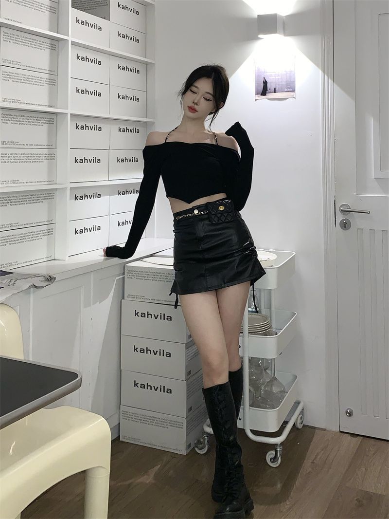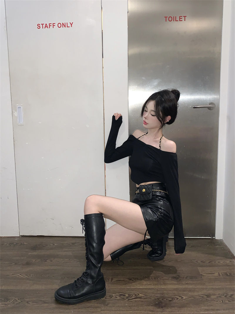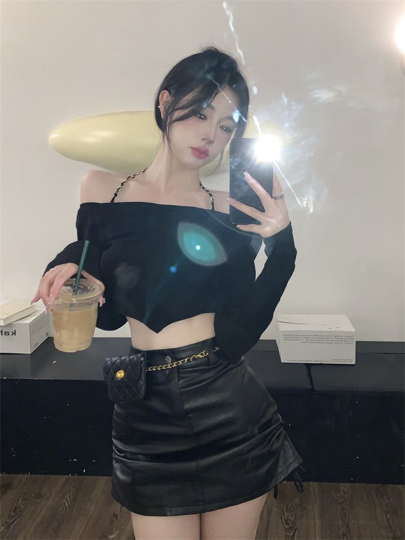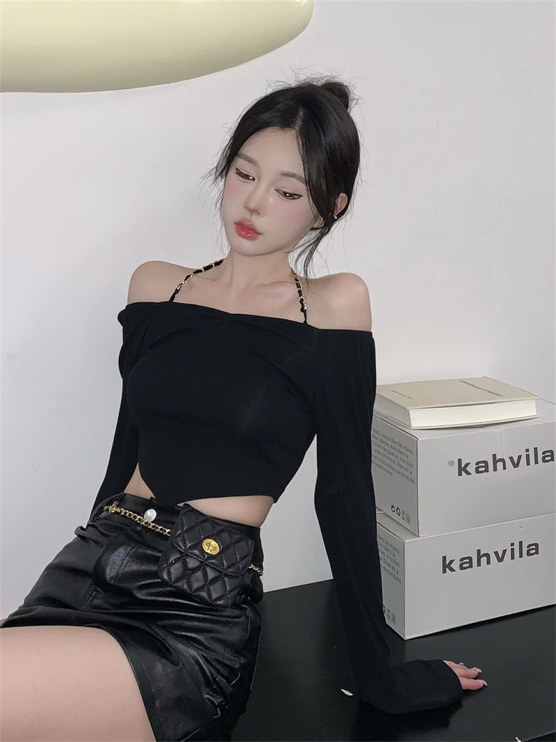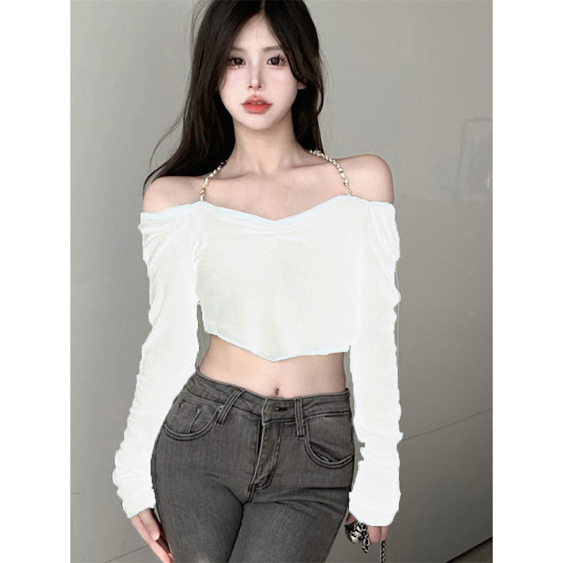 체인 매달린 목 오프-어깨 긴팔베이스 셔츠 티셔츠 여성용 봄 핫 걸스 백리스 짧은 슬림 올 매치 탑 옷