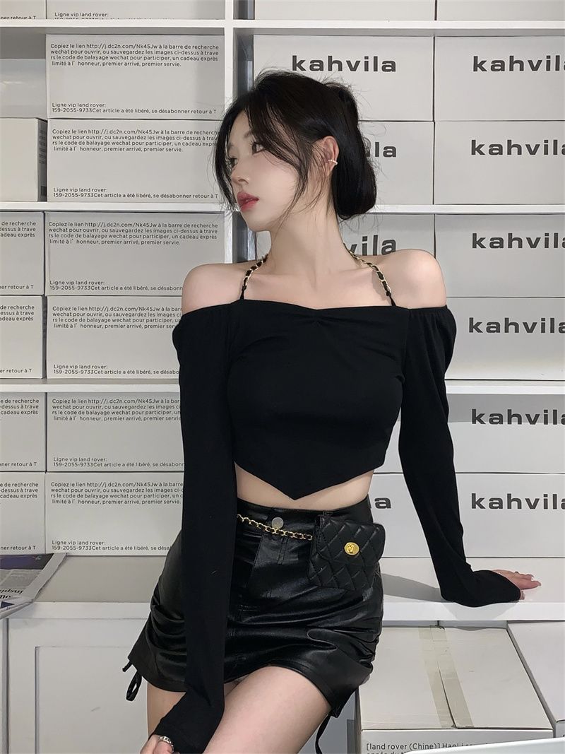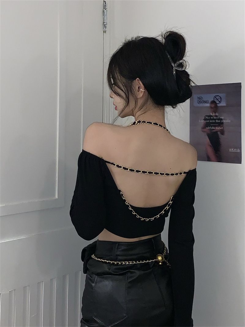 체인 매달린 목 오프-어깨 긴팔베이스 셔츠 티셔츠 여성용 봄 핫 걸스 백리스 짧은 슬림 올 매치 탑 옷스토어 가기