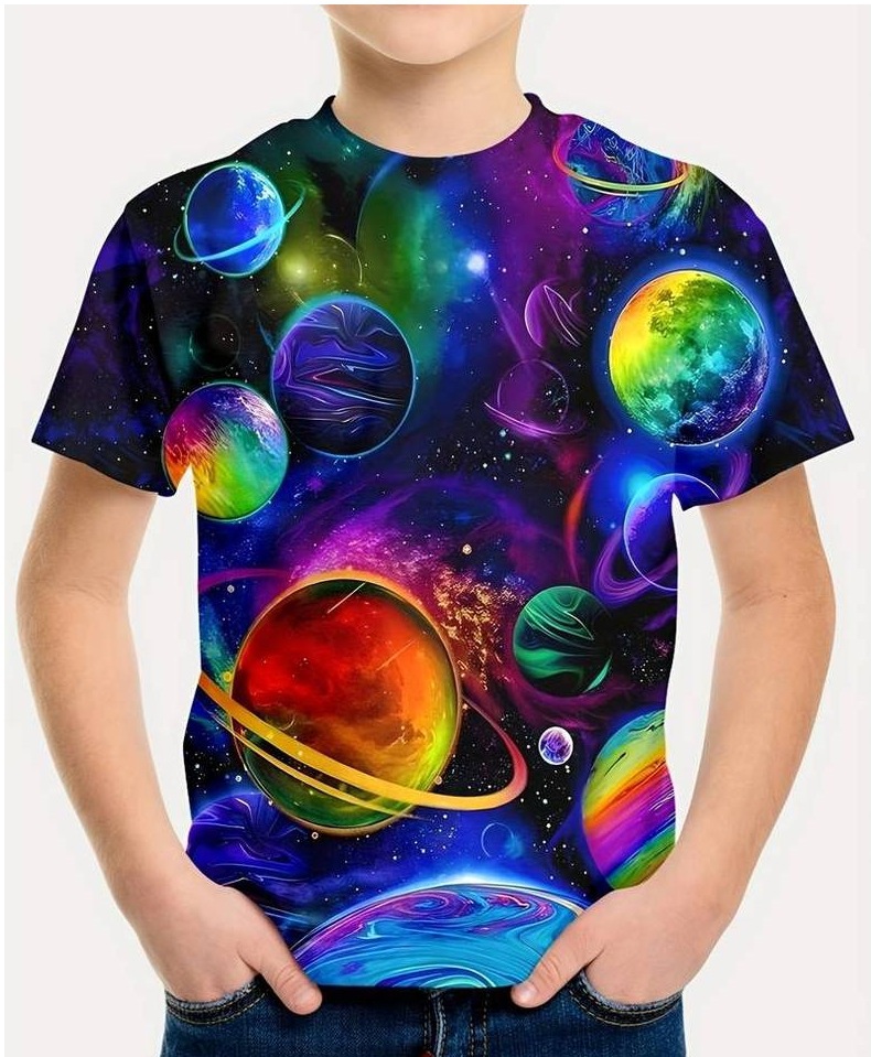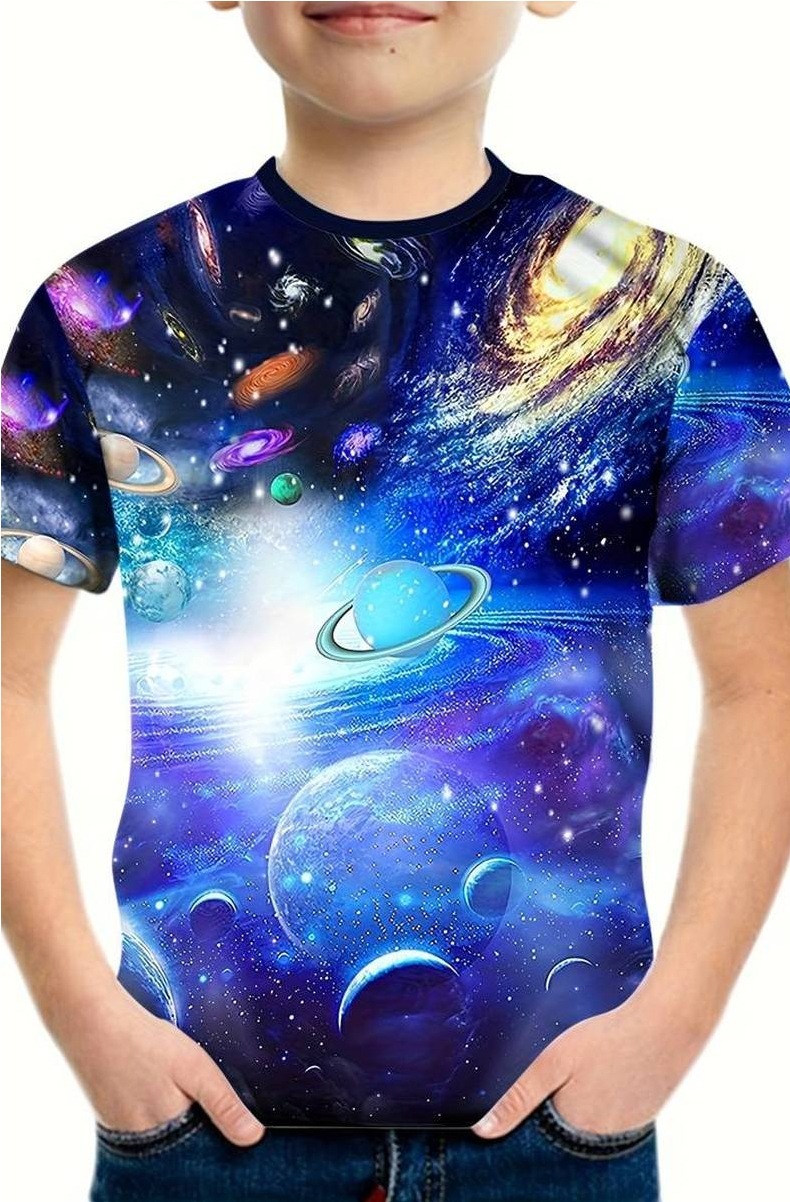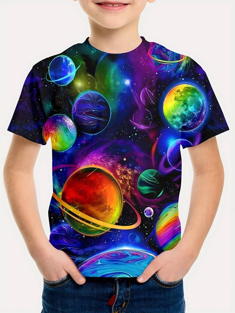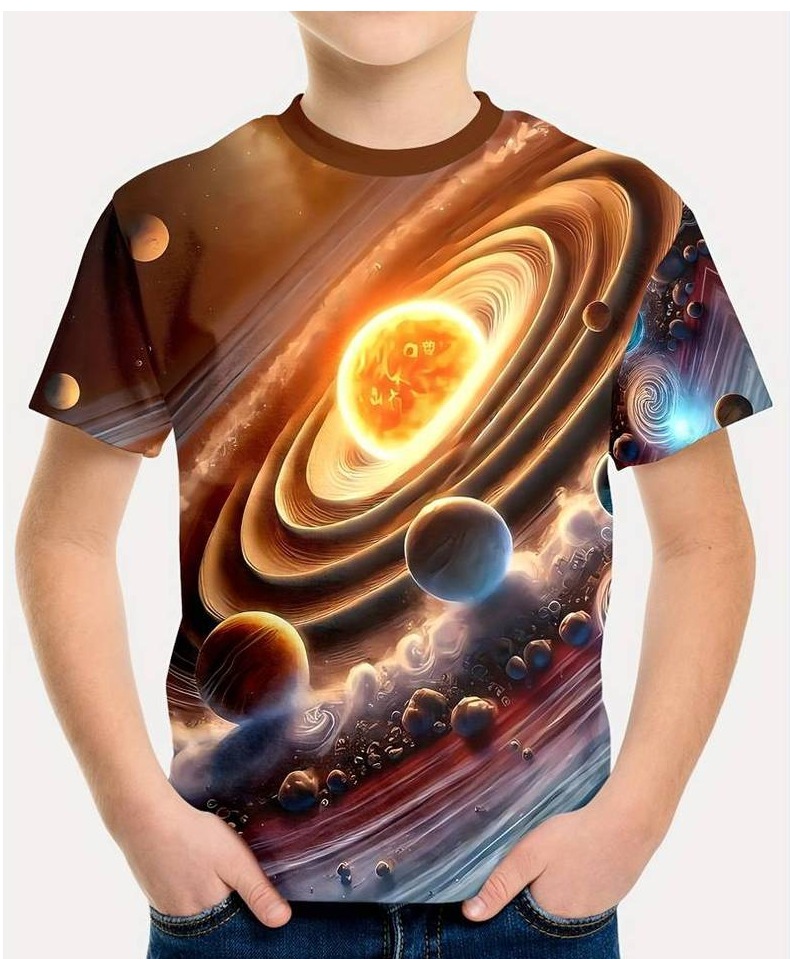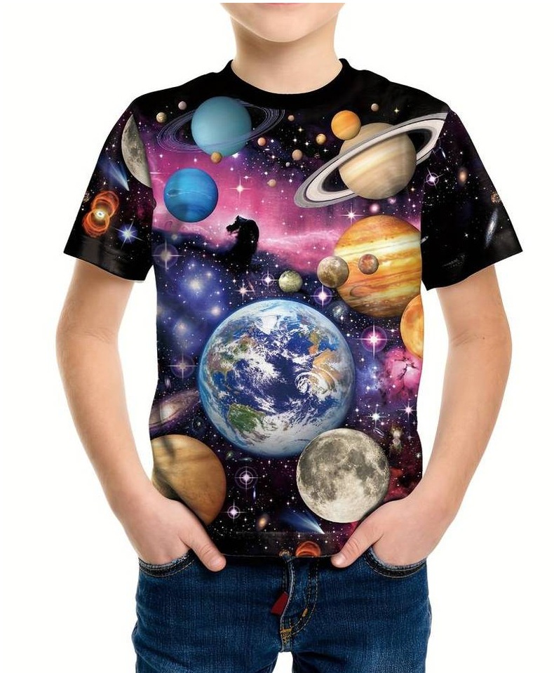 2025 플래닛 시리즈 프린트 3D 디지털 프린팅 티셔츠 반팔 해외 무역 여름 아동용 라운드넥 상의