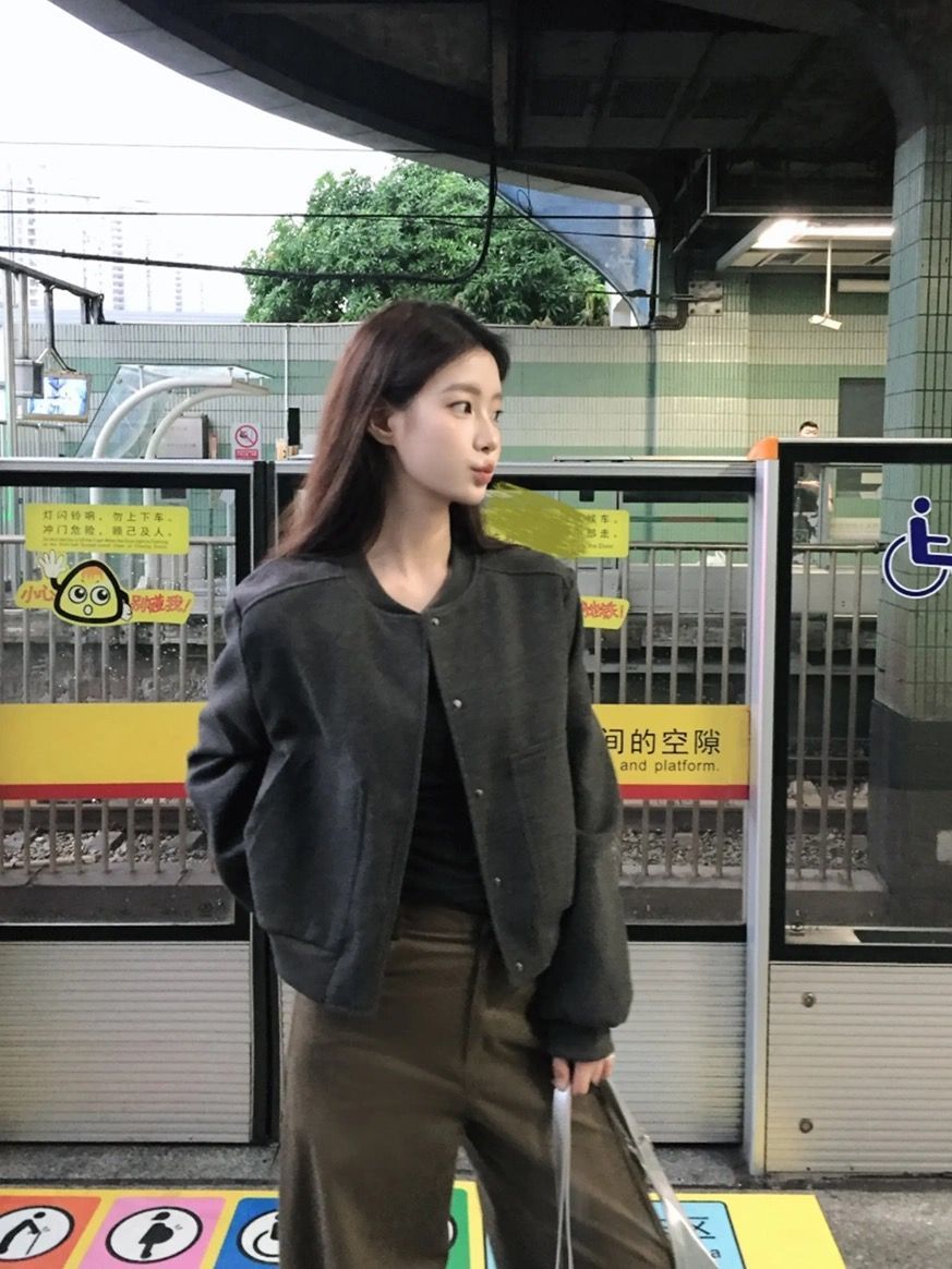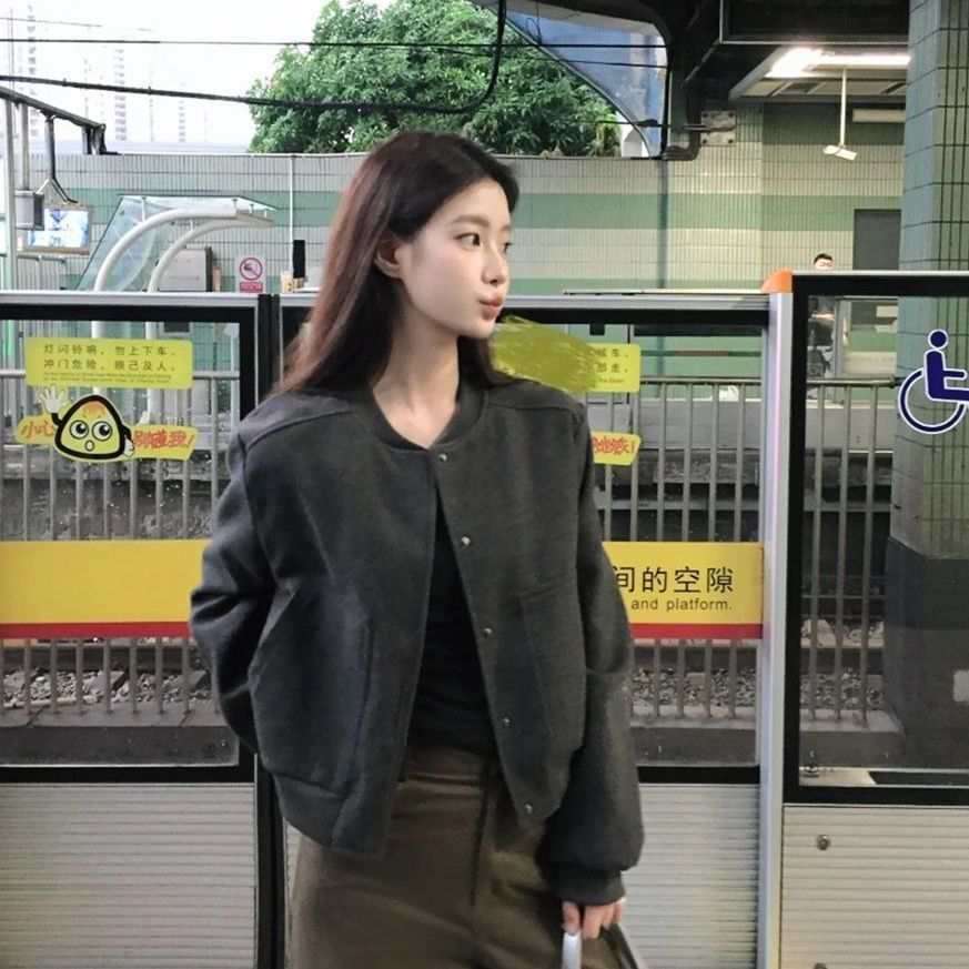 아메리칸 스타일 레트로 그레이 짧은 야구 세트 코트 여성의 봄과 가을 디자인 틈새 느슨한 캐주얼 재킷 탑스토어 가기