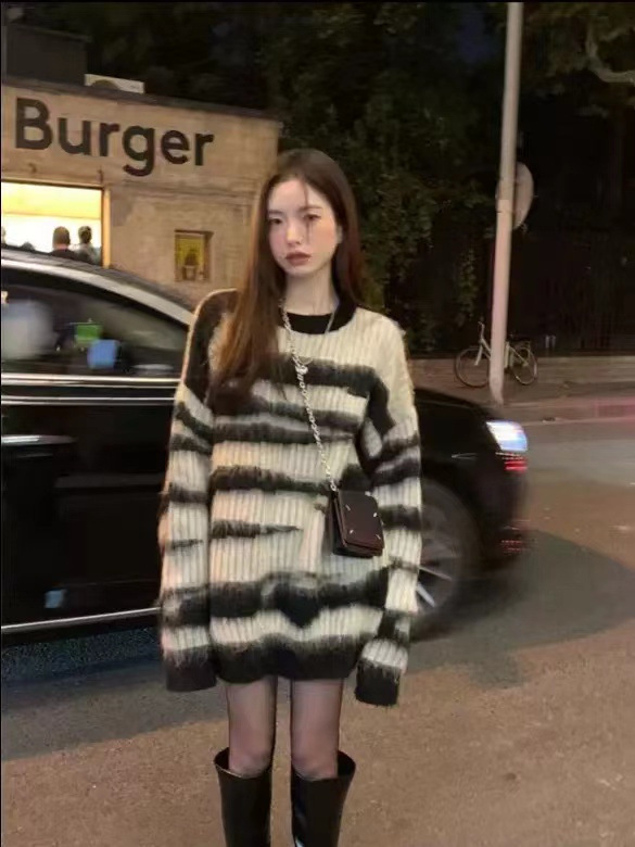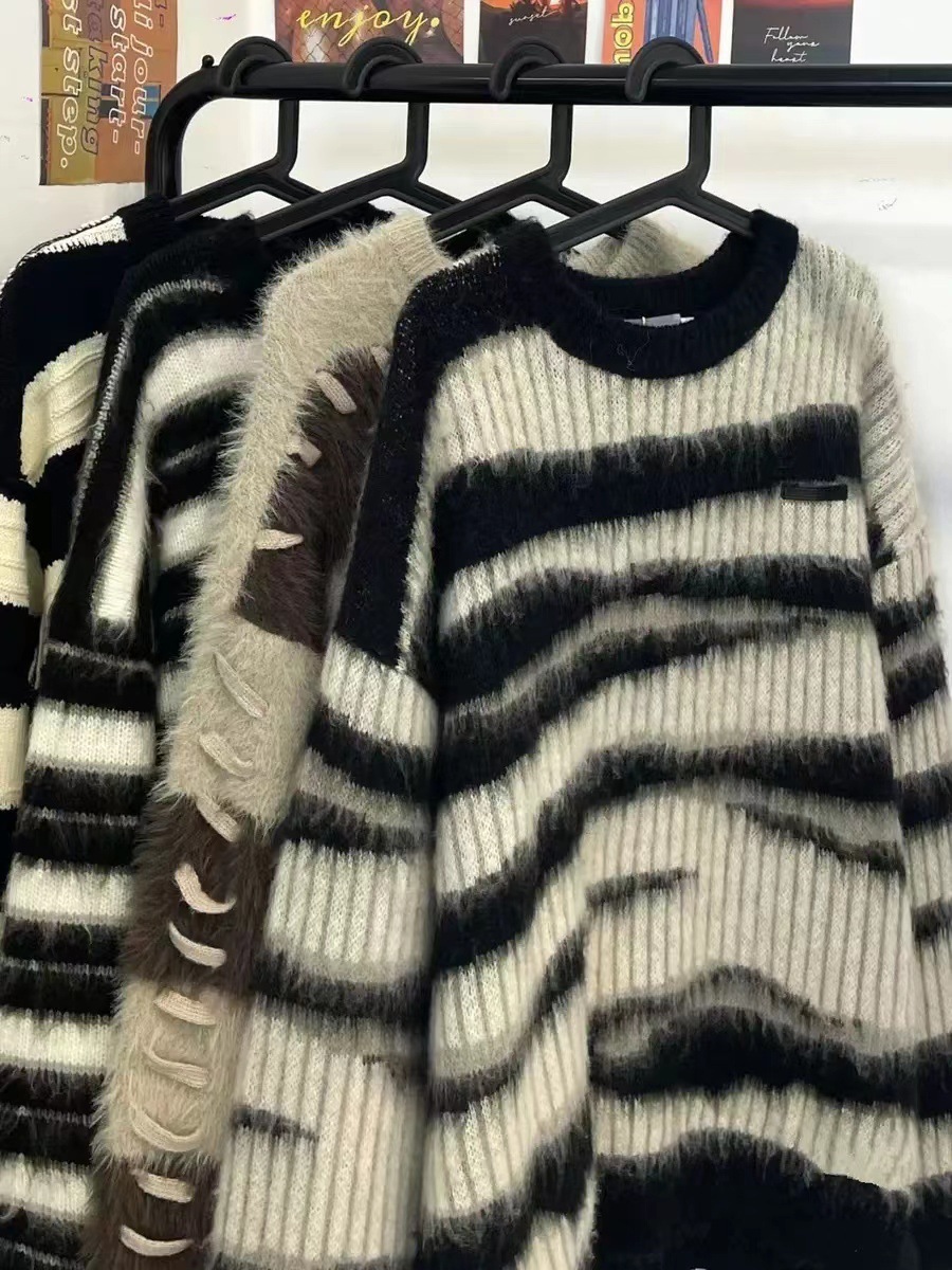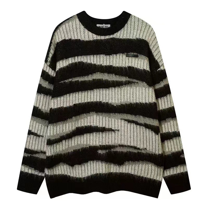 Puyuan 스웨터 공장 라운드 넥 스웨터 남자와 여자의 2024 가을과 겨울 새로운 유럽과 미국의 명암 줄무늬 미국 니트 셔츠스토어 가기
