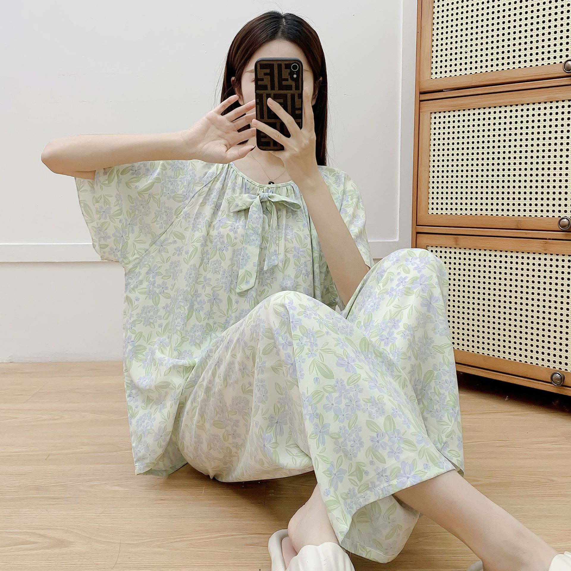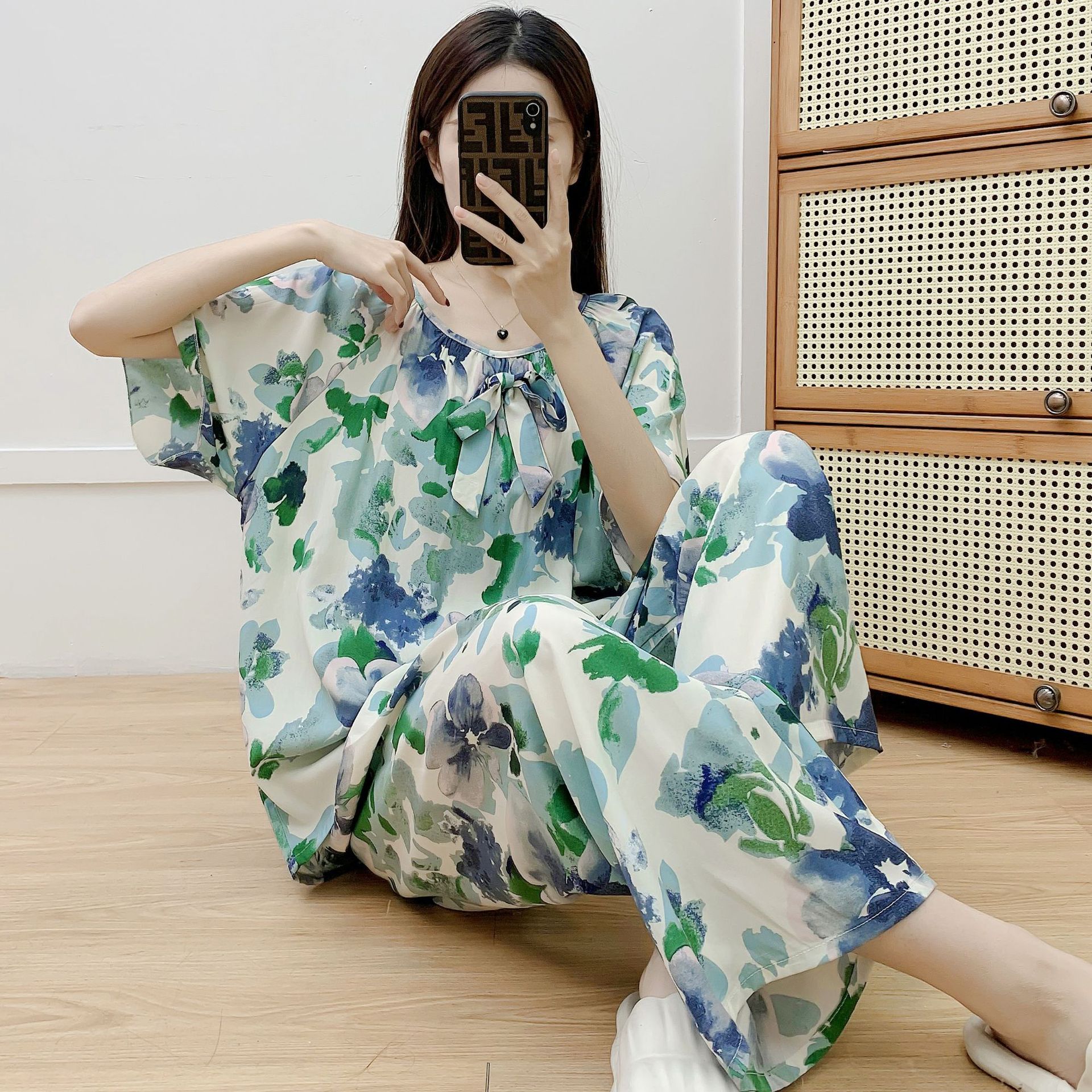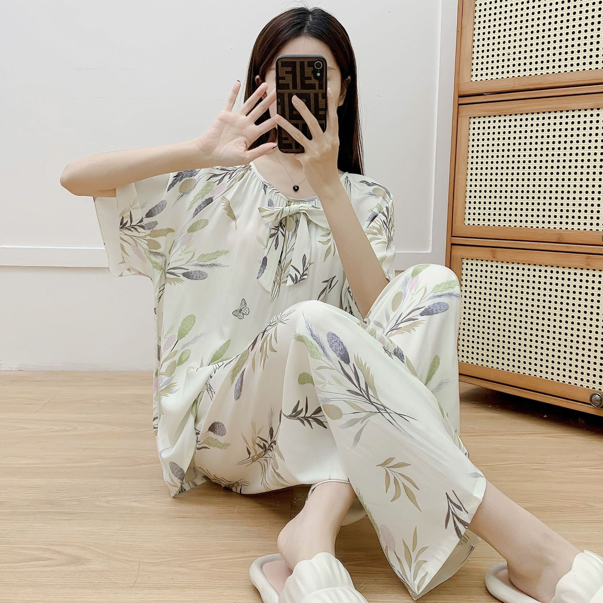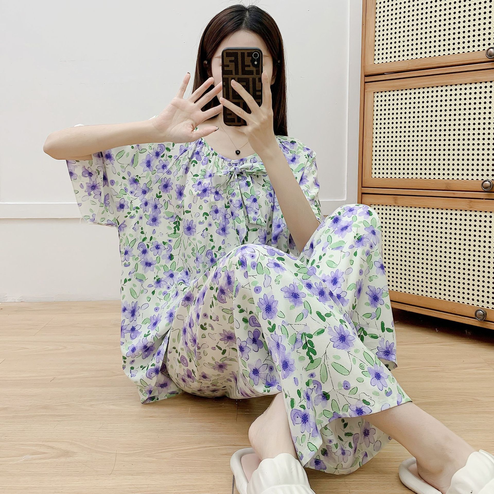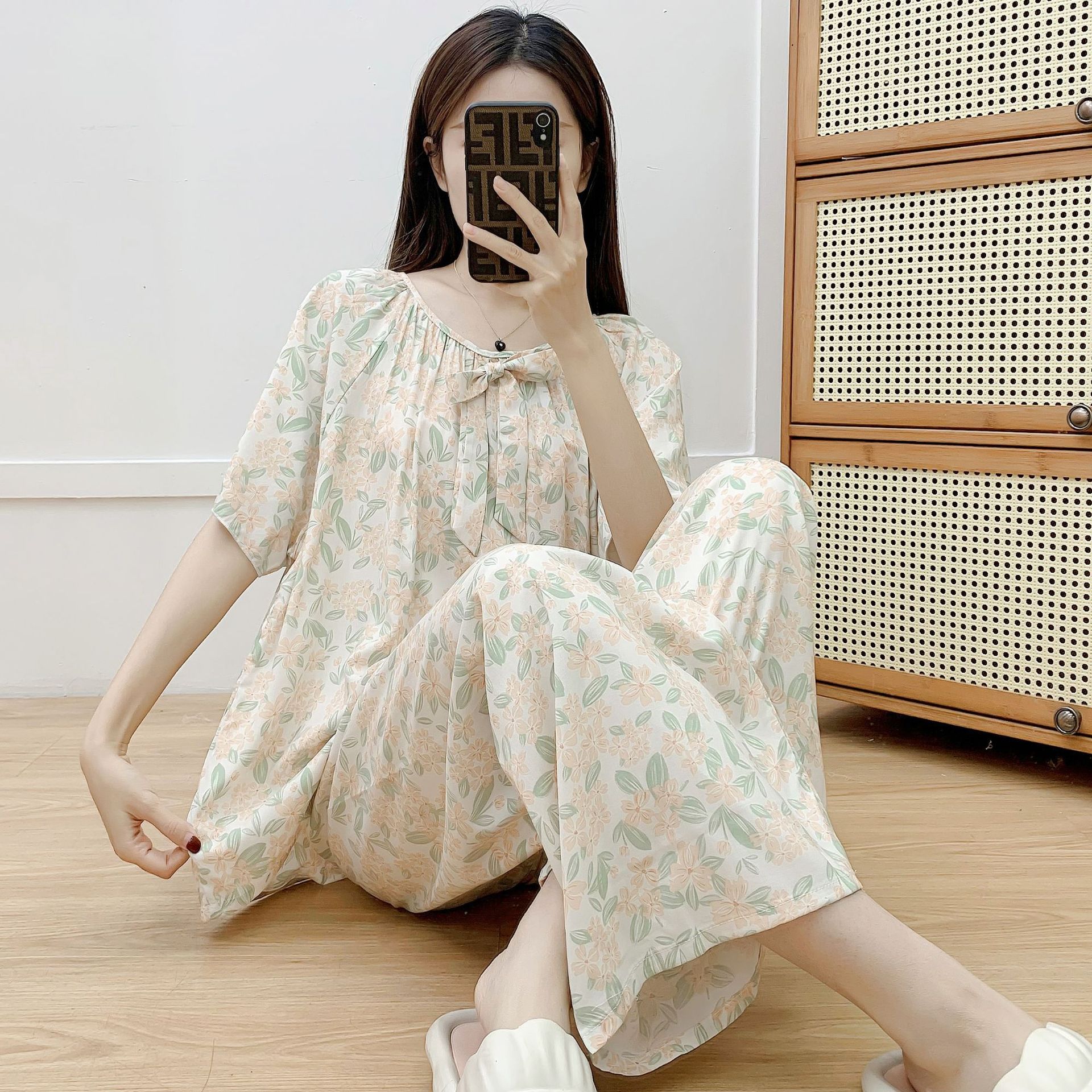 코튼 실크 파자마 여성 여름 새로운 반팔 바지 투피스 세트 한국식 루즈 홈 옷 꽃 인공 면화 세트스토어 가기