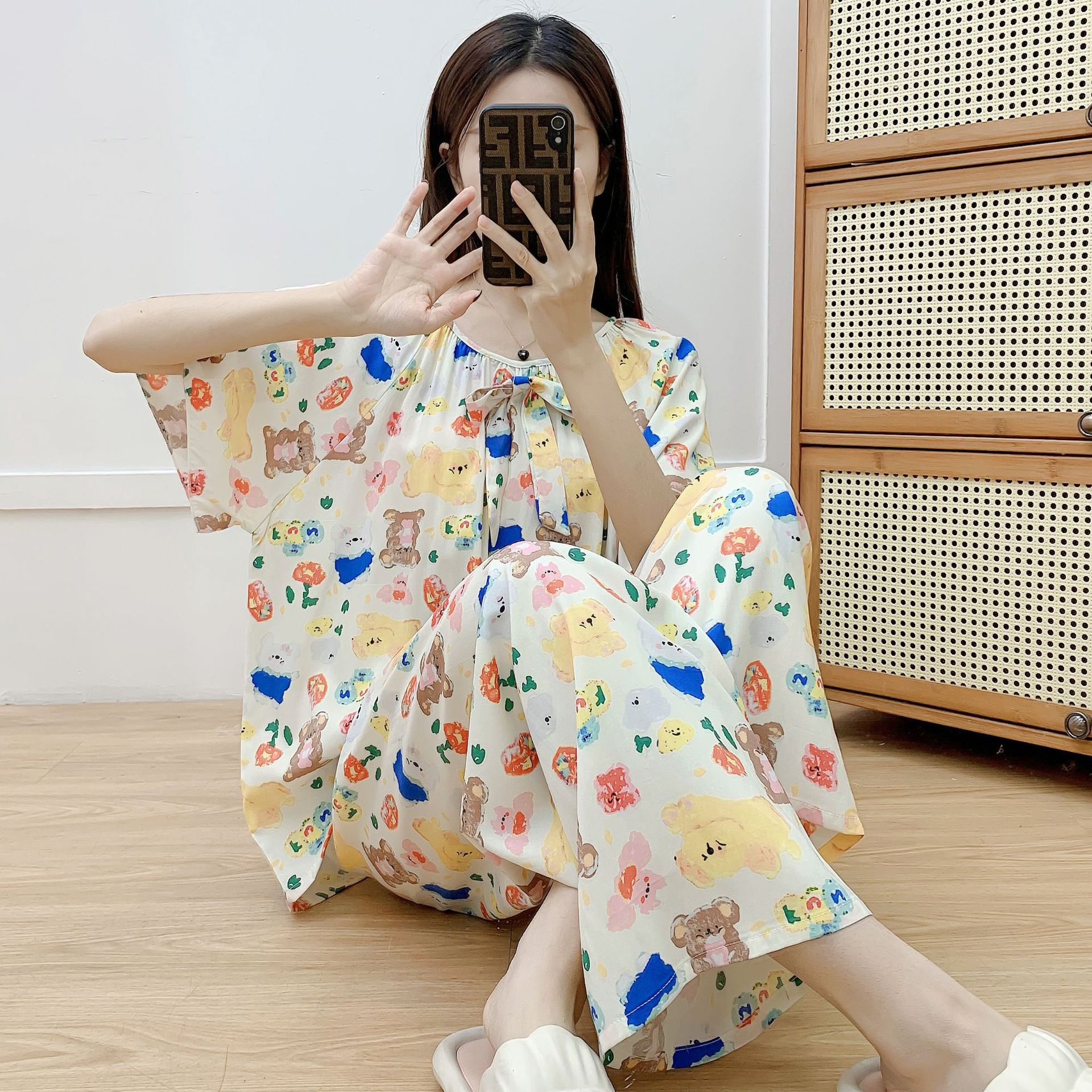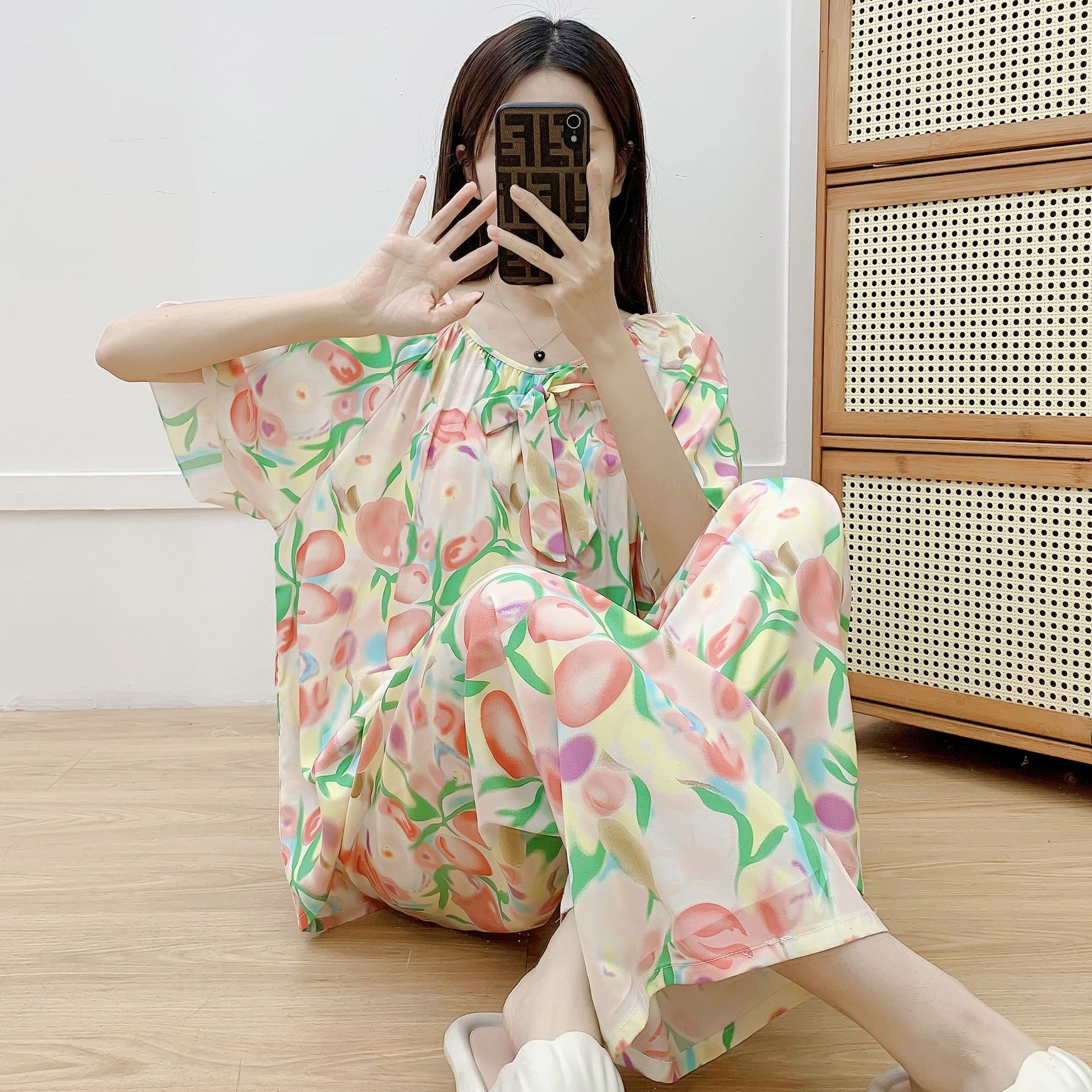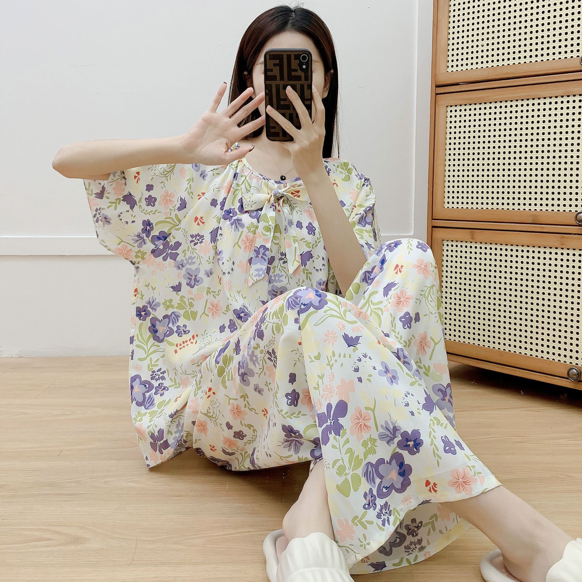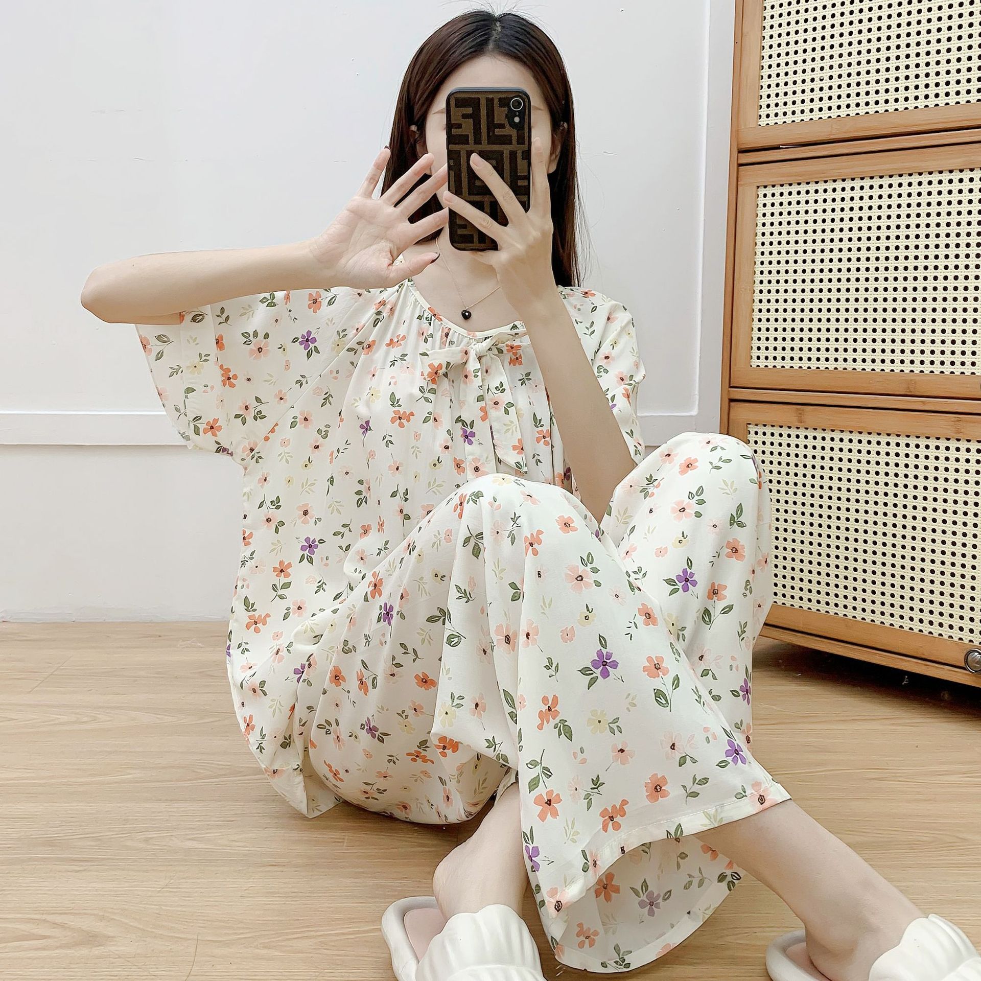 코튼 실크 파자마 여성 여름 새로운 반팔 바지 투피스 세트 한국식 루즈 홈 옷 꽃 인공 면화 세트스토어 가기
