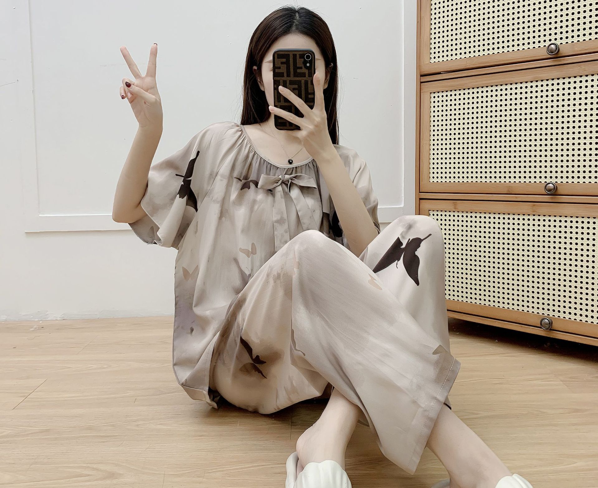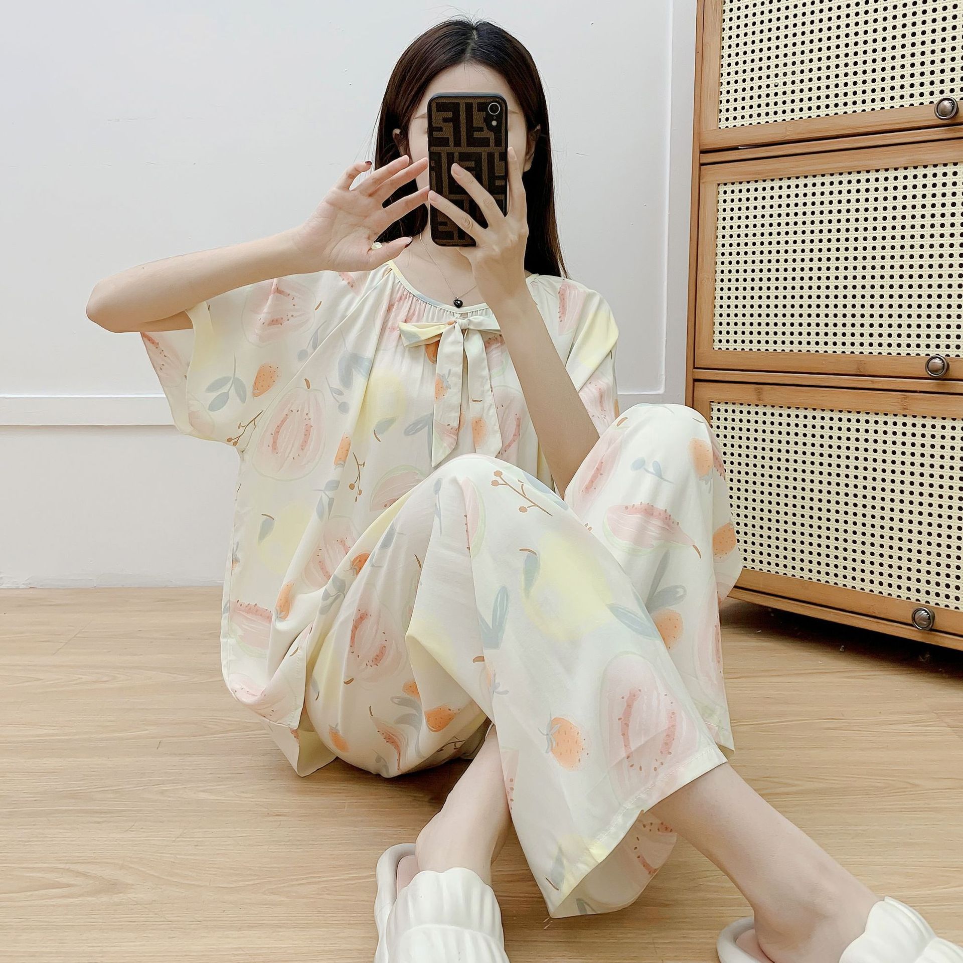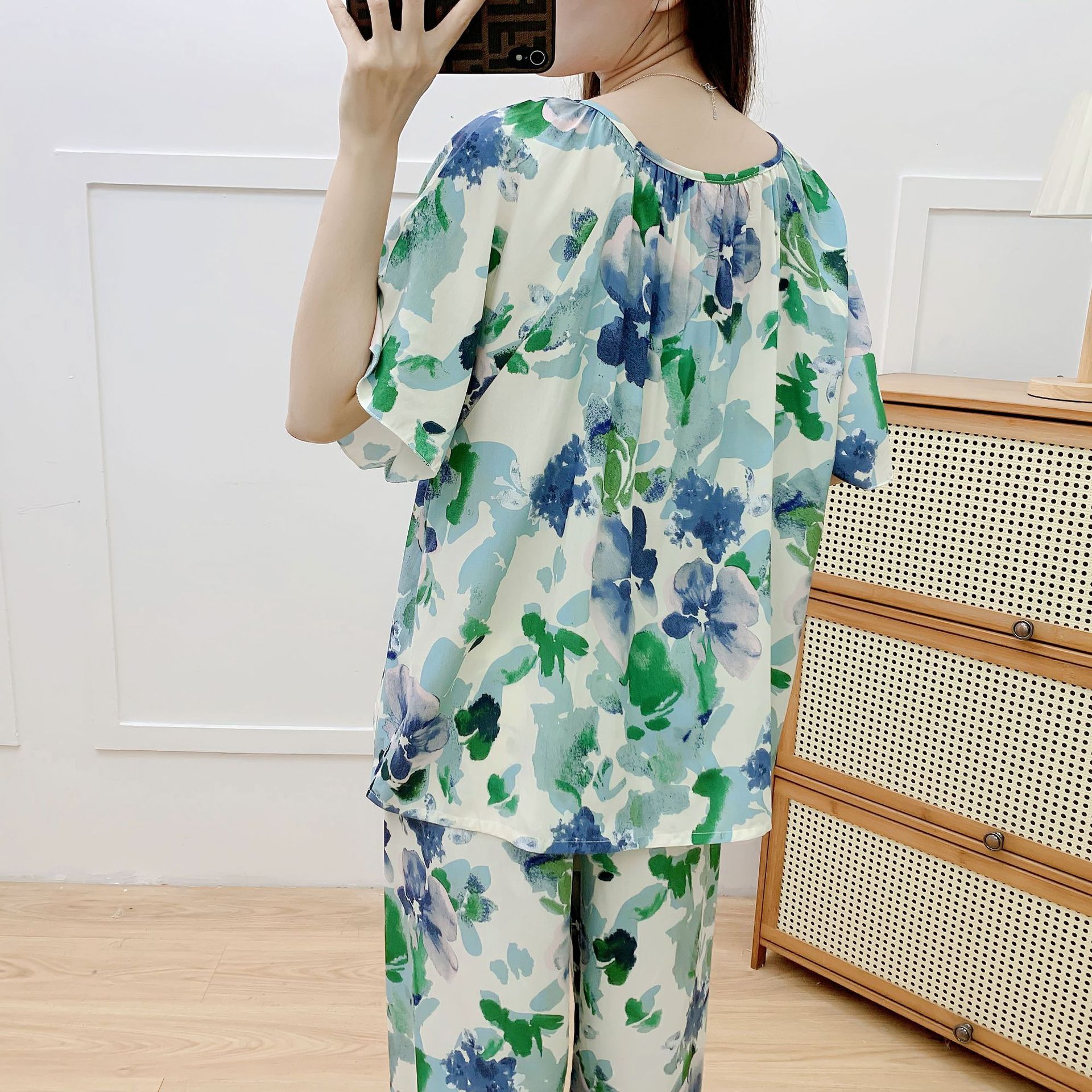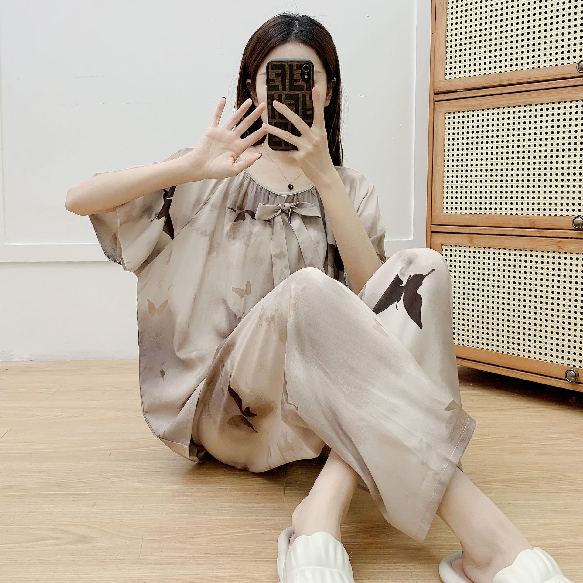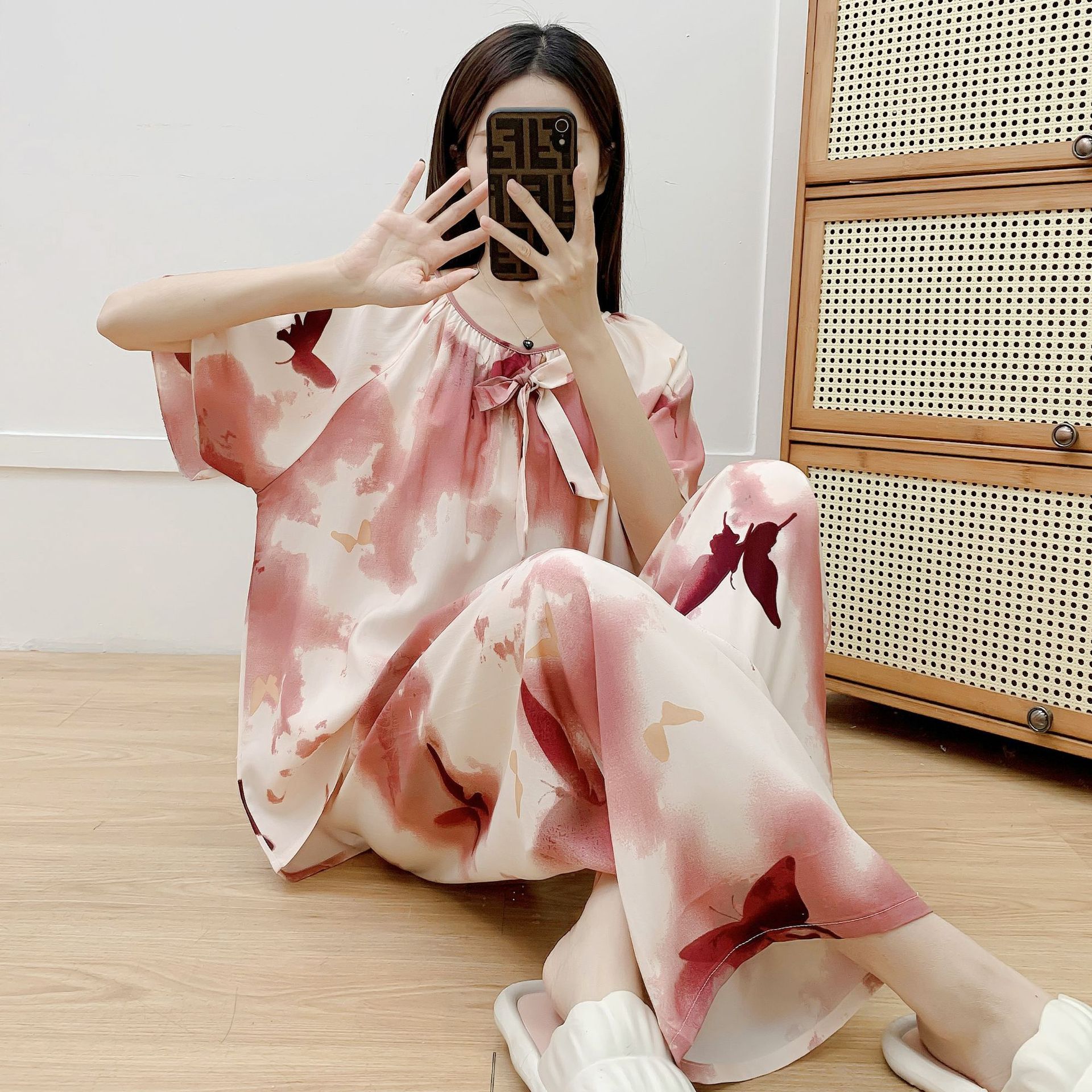 코튼 실크 파자마 여성 여름 새로운 반팔 바지 투피스 세트 한국식 루즈 홈 옷 꽃 인공 면화 세트스토어 가기