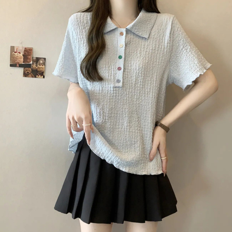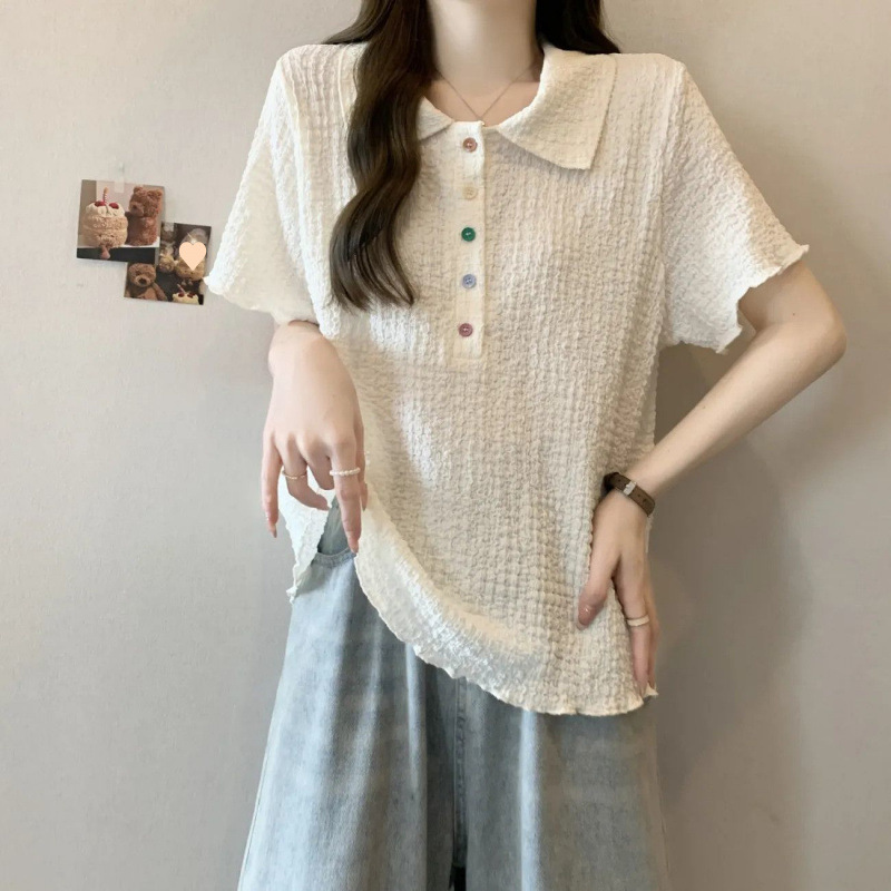 대학 스타일 칼라 어깨 반팔 셔츠 여성의 여름 지방 질감 배꼽 덮인 연령 감소 셔츠 300kg 코트스토어 가기