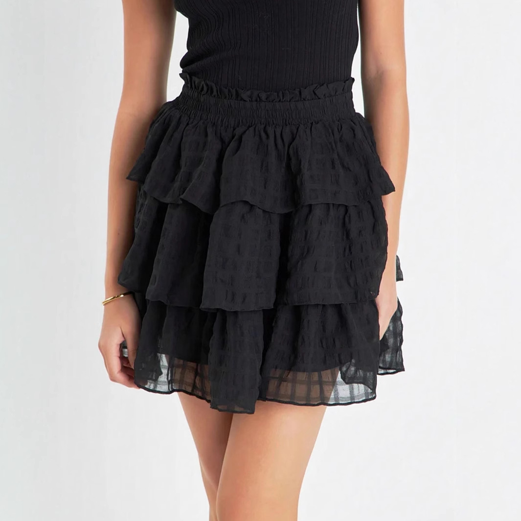 2025 년 여름 아마존 국경 새로운 인기 패션 우아한 체크 쉬폰 적층 미니 케이크 스커트 여성 의류스토어 가기