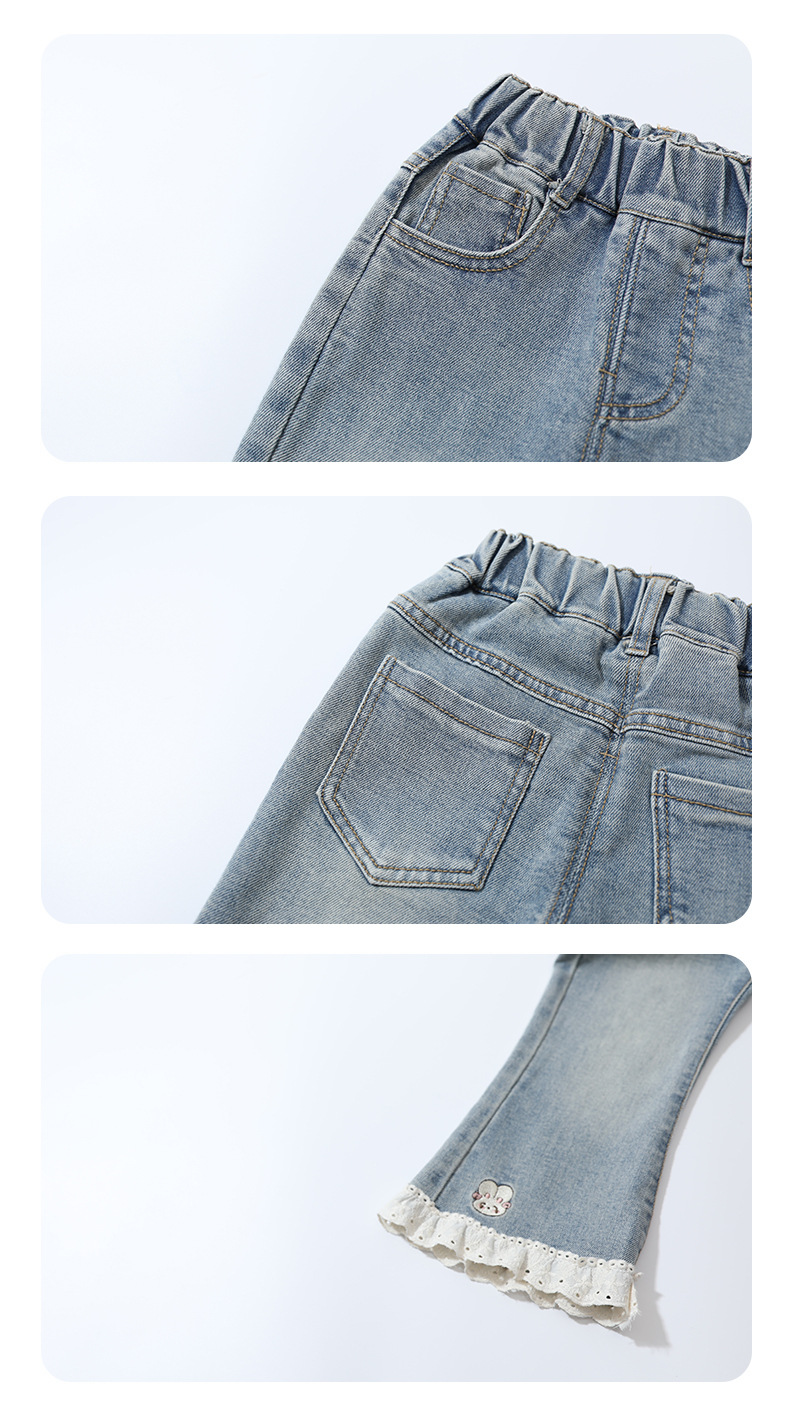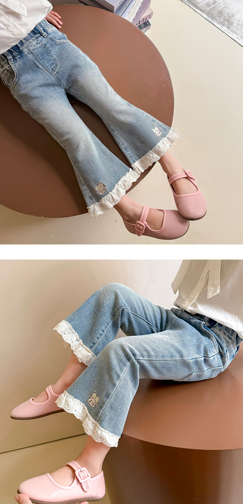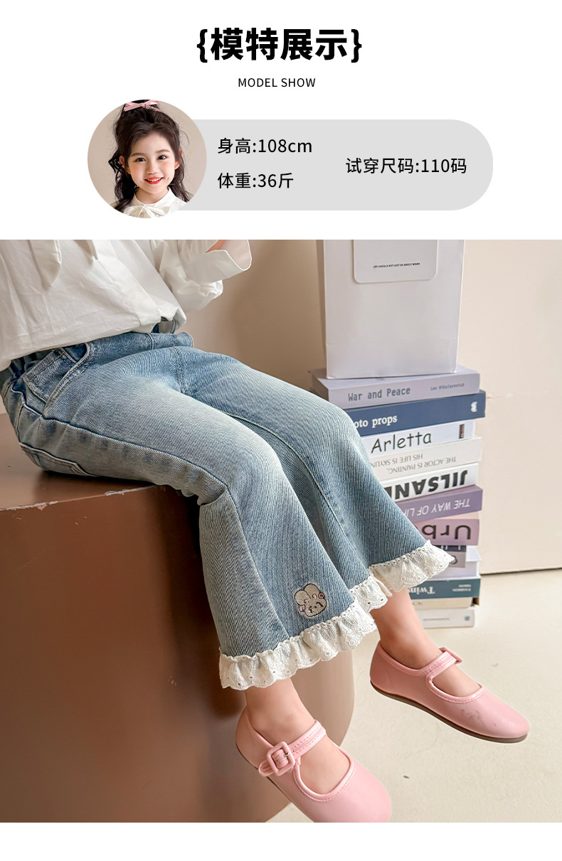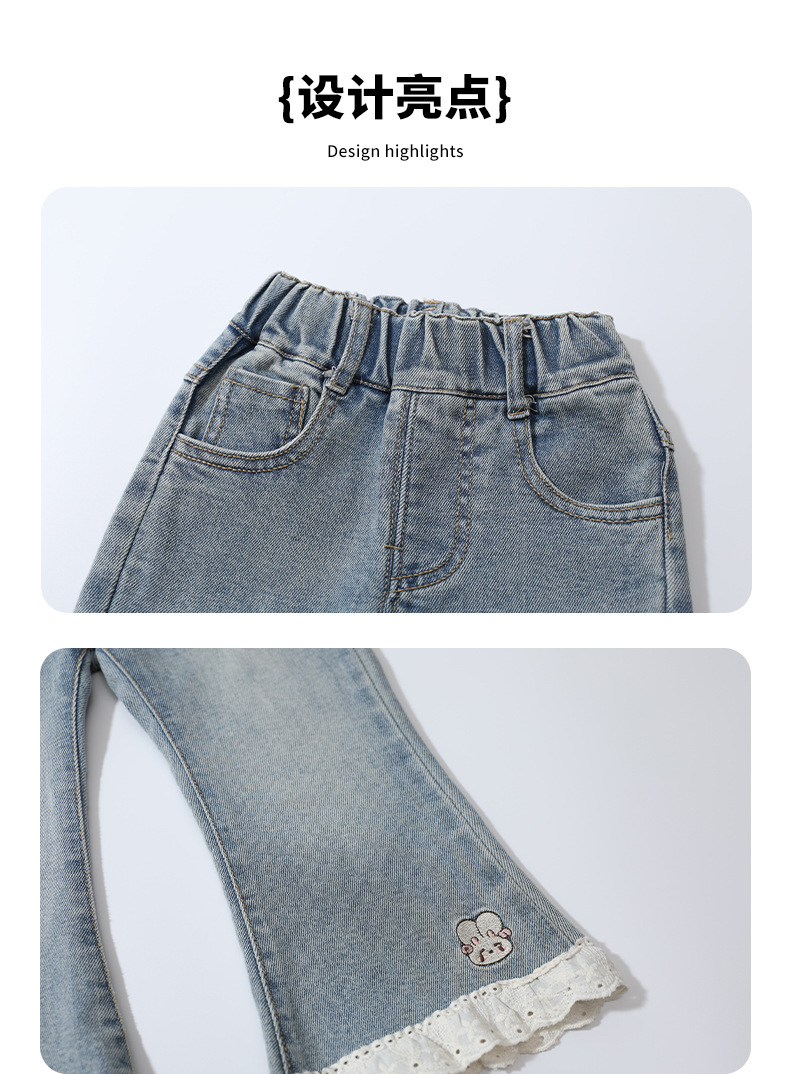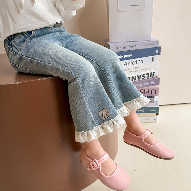 2025 봄과 가을 새로운 소녀 만화 자수 청바지 중소 어린이 7 레이스 9 유행 트럼펫 긴 바지스토어 가기