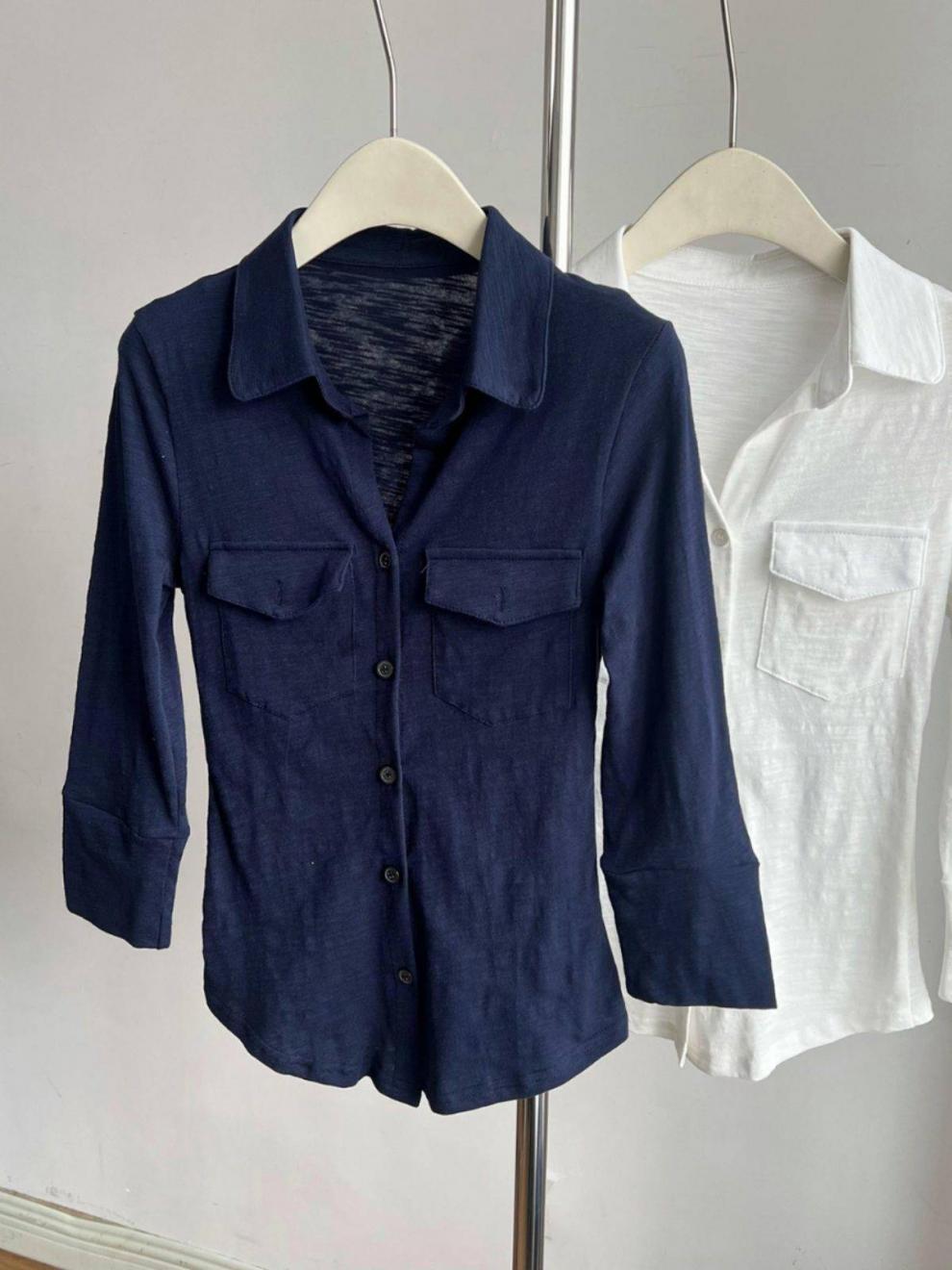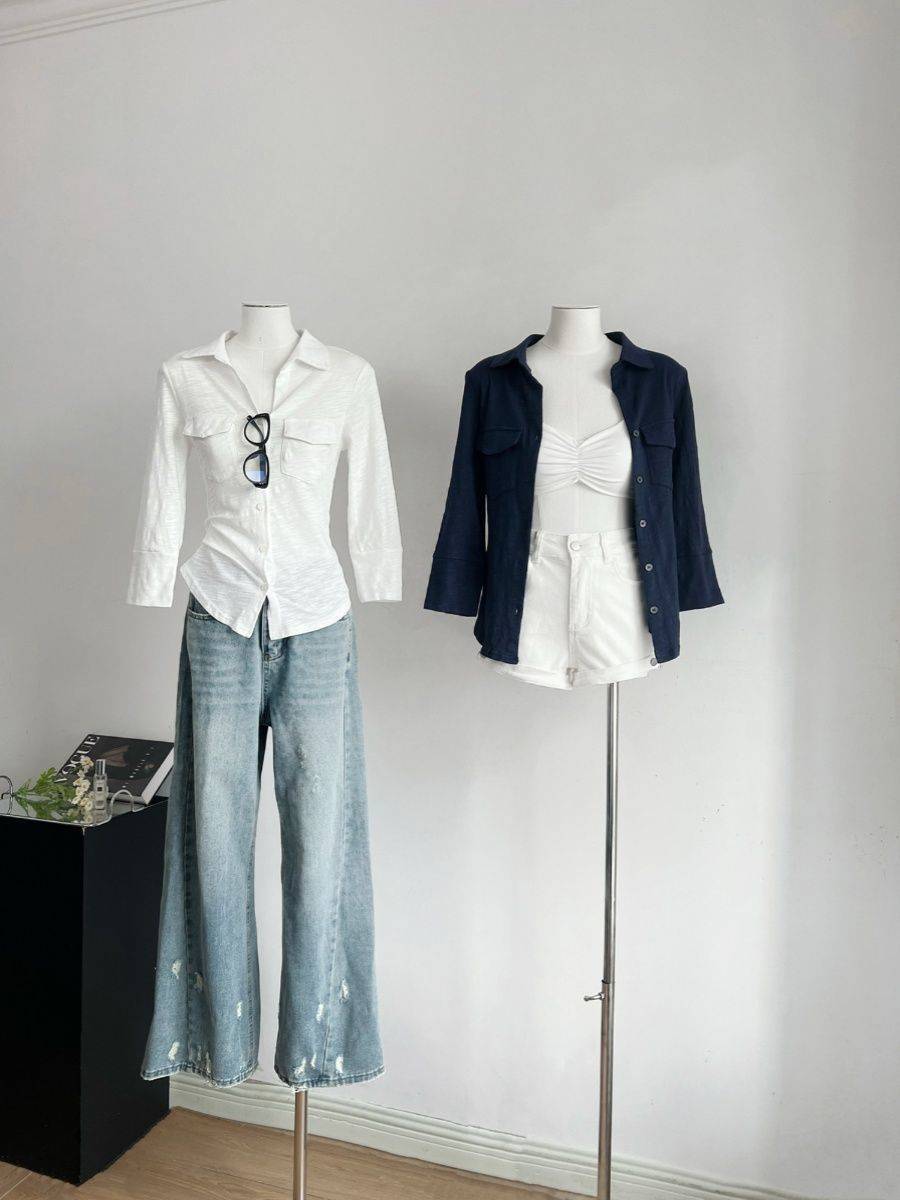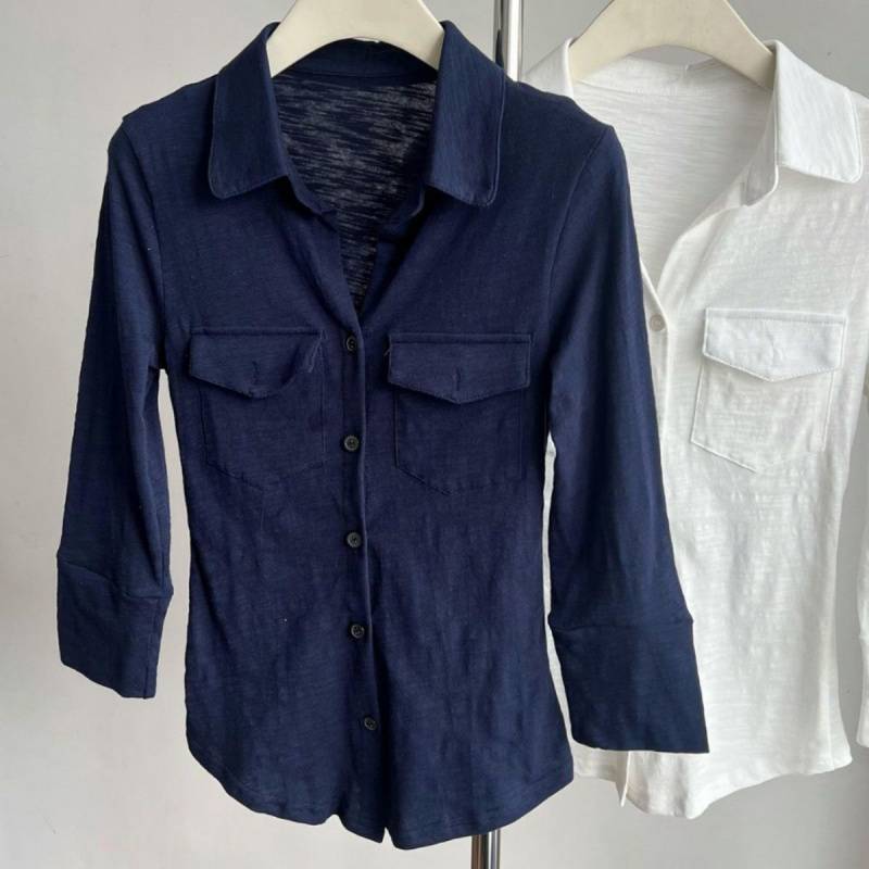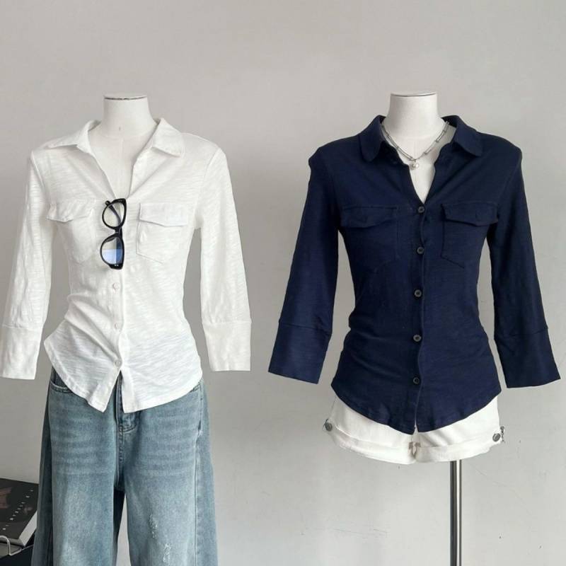 타이트한 허리 일곱 소매 단색 칼라 셔츠 여성의 순수한 욕망 스타일 우아한 디자인 감각 캐주얼 불규칙한 짧은 셔츠스토어 가기