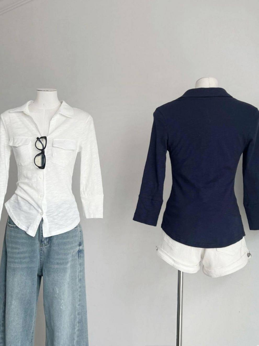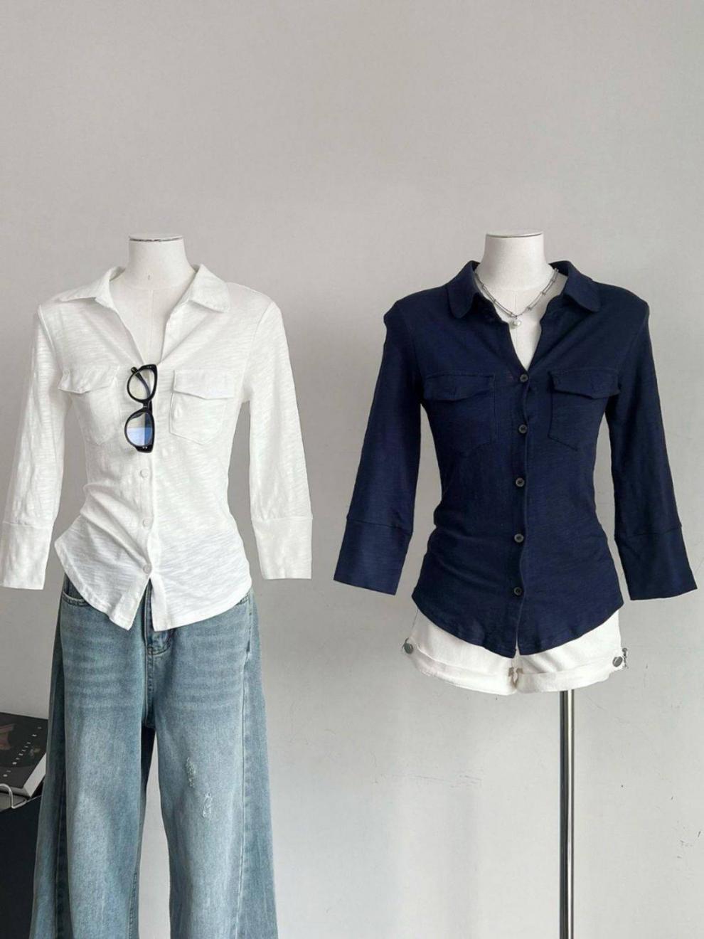 타이트한 허리 일곱 소매 단색 칼라 셔츠 여성의 순수한 욕망 스타일 우아한 디자인 감각 캐주얼 불규칙한 짧은 셔츠