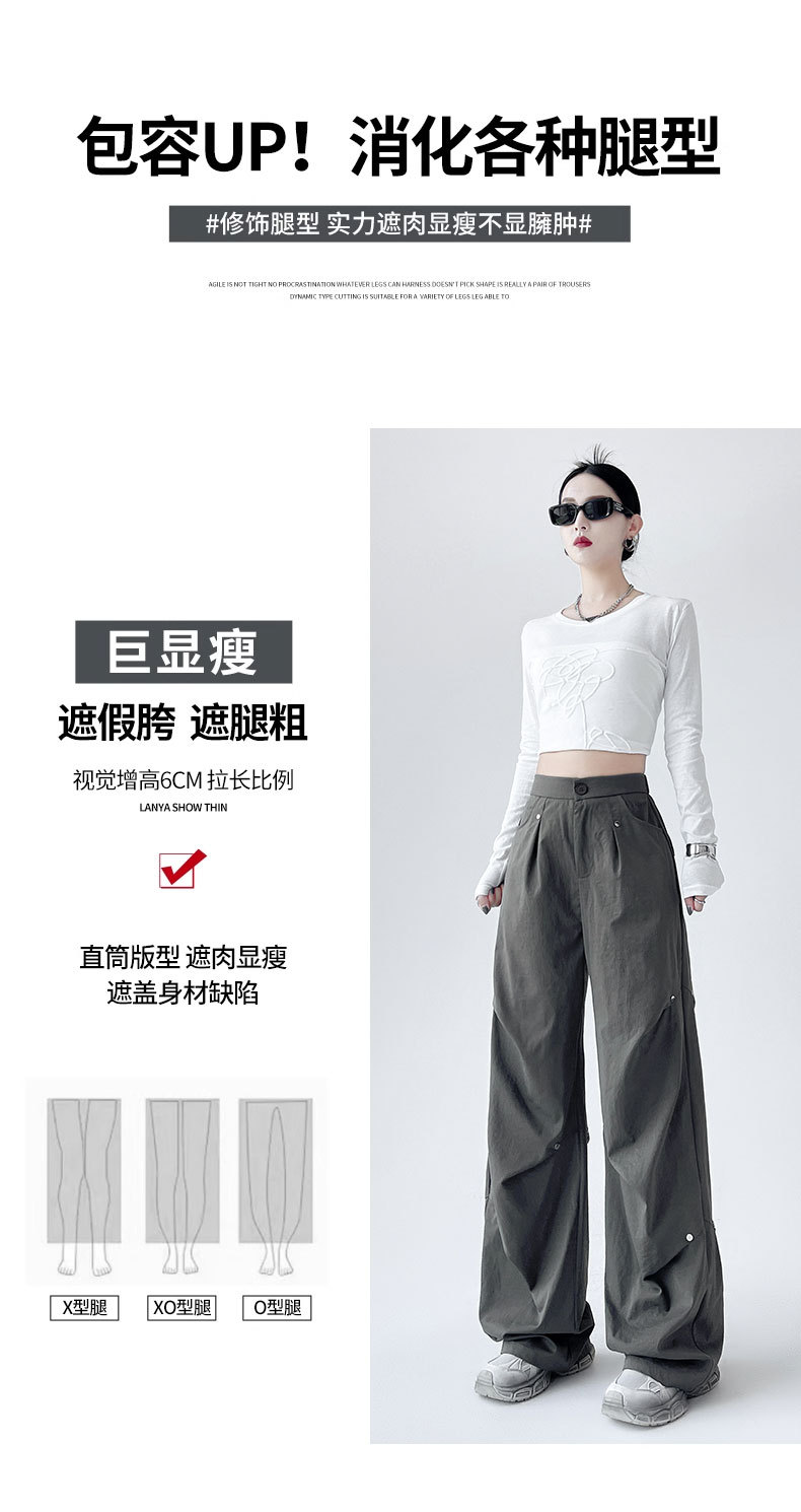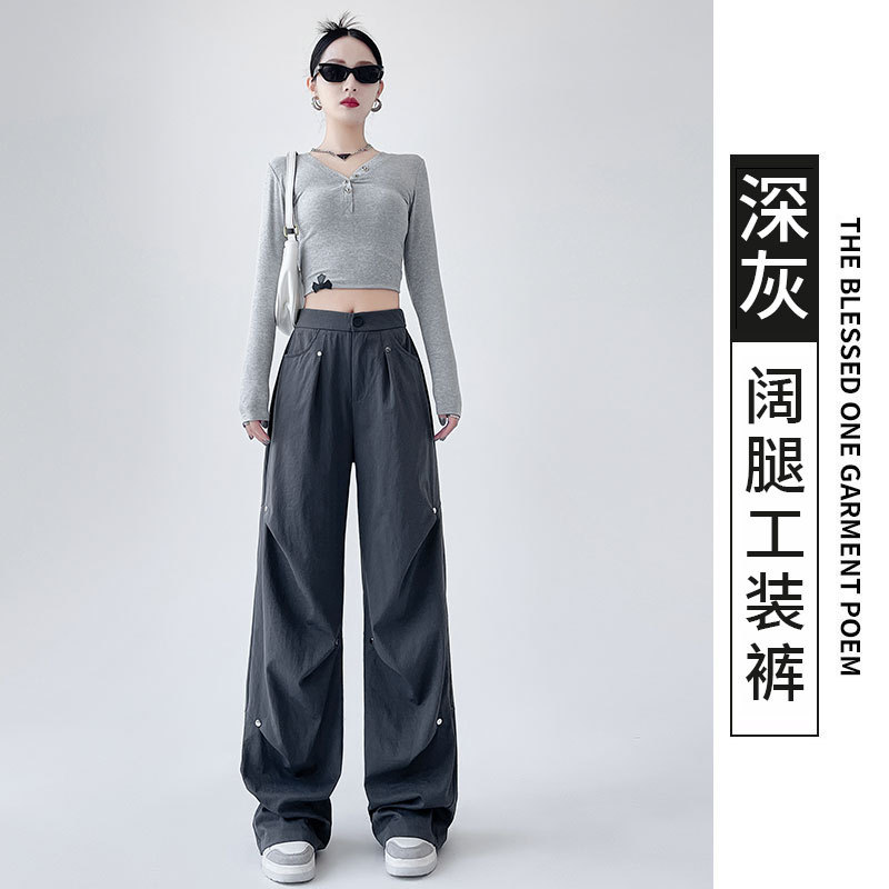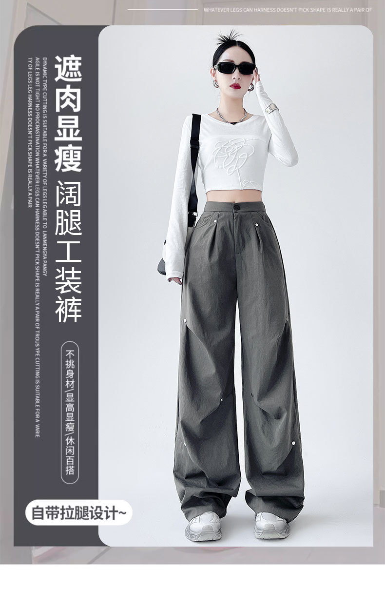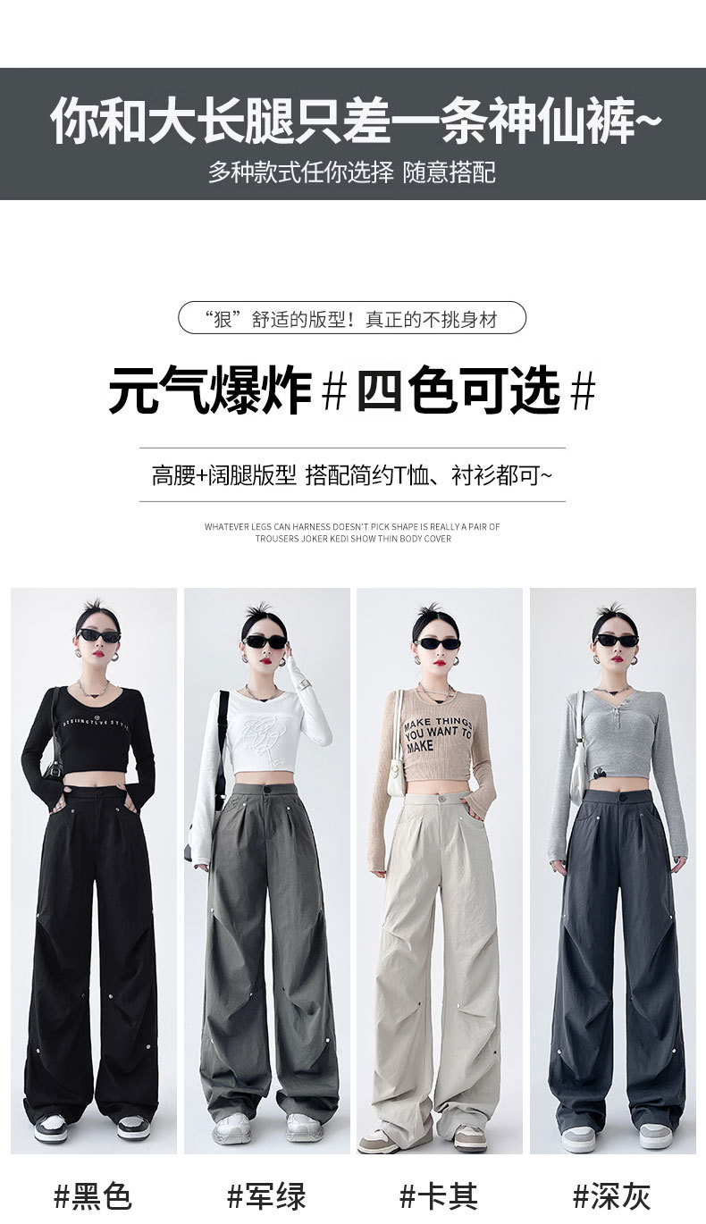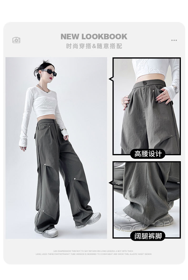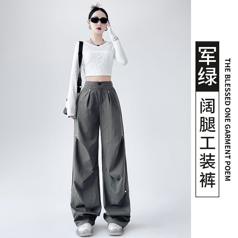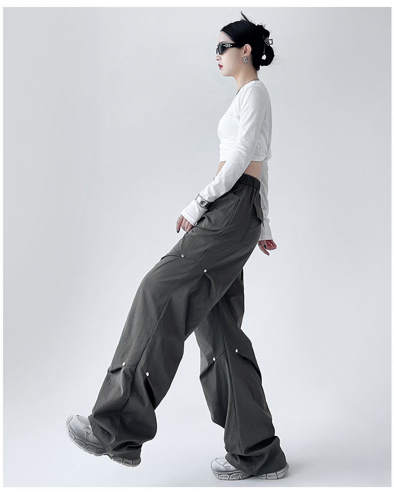 American Rivet Overalls 여성 봄과 여름 2025 새로운 높은 허리 느슨한 넓은 다리 스트레이트 등산 스포츠 바지