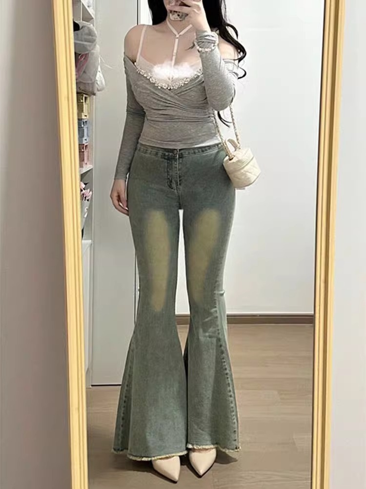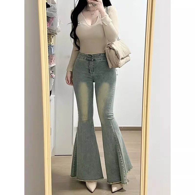 200kg 플러스 사이즈 여성 마이크로 청바지 여성 봄과 여름 새로운 통통녀 높은 허리 슬림 피쉬 테일 트럼펫 바지 조수스토어 가기