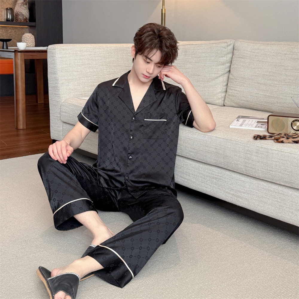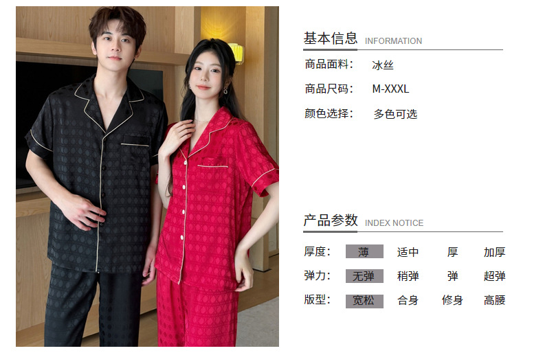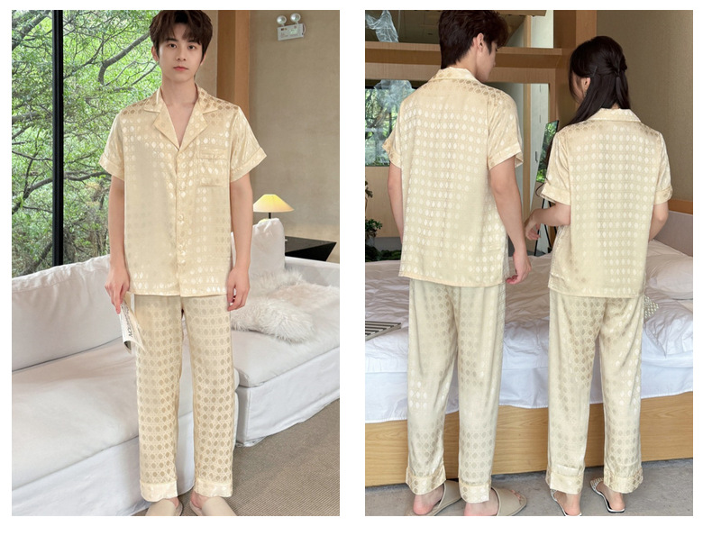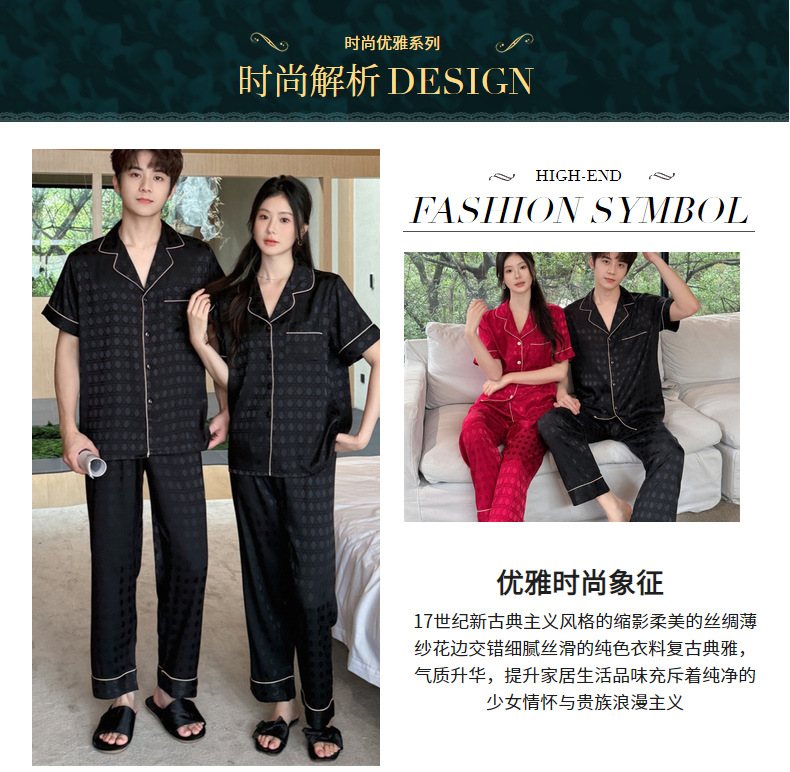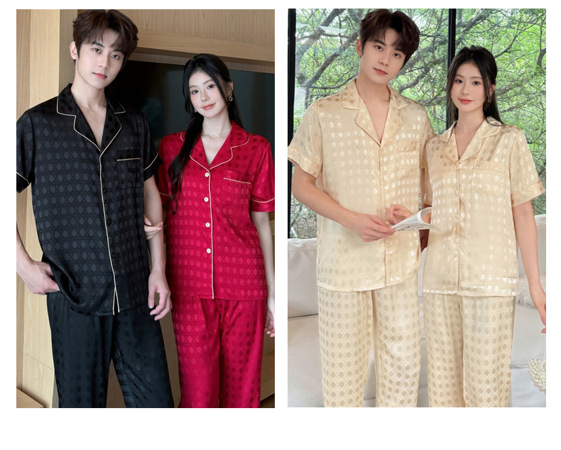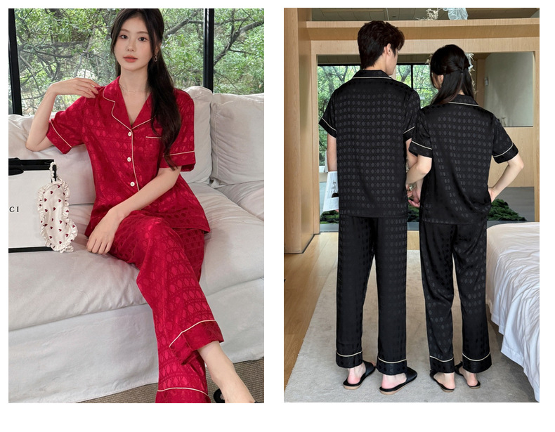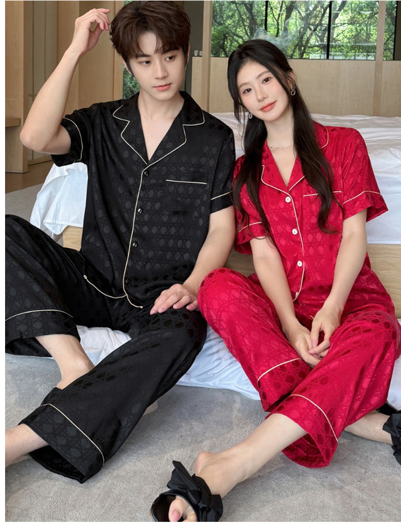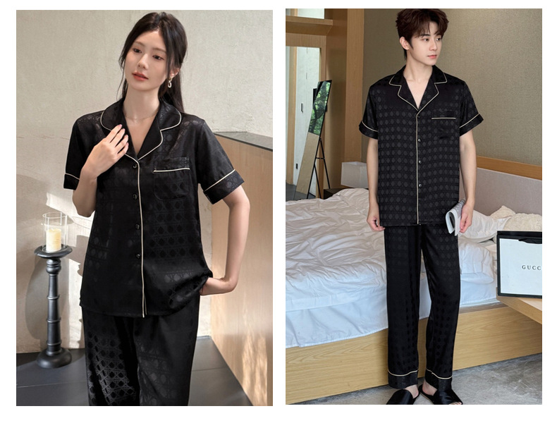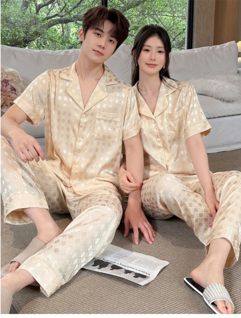 커플 잠옷 2025 봄과 여름 남자의 새로운 아이스 실크 짧은 소매 바지 세트 얇은 여성 홈 웨어 도매