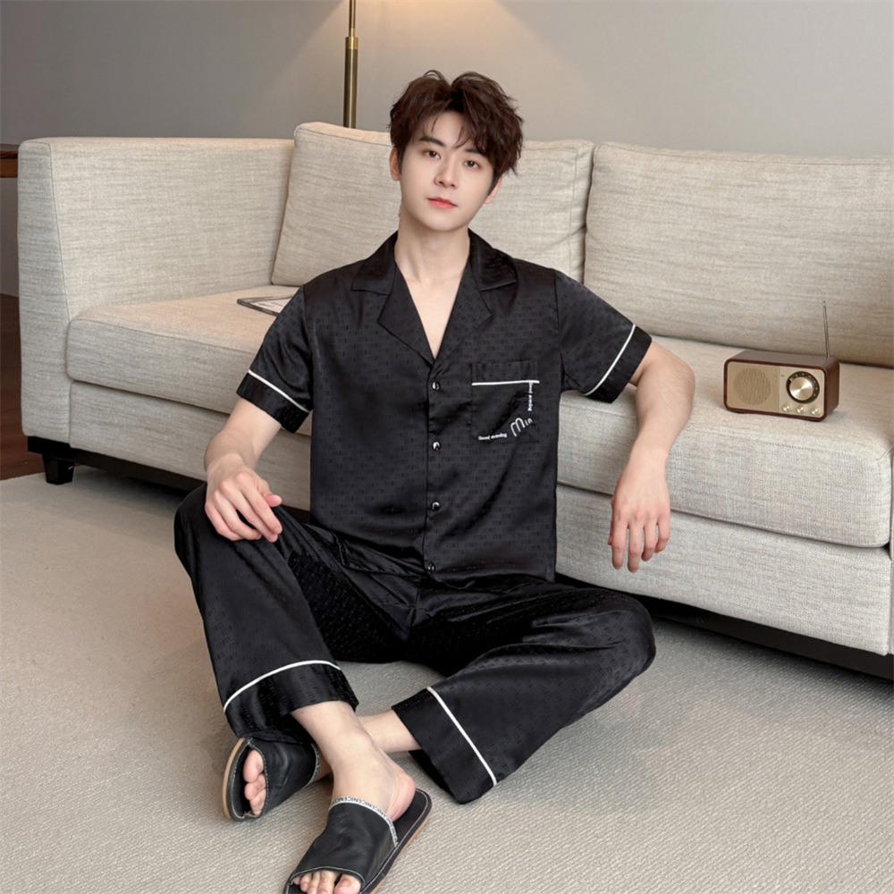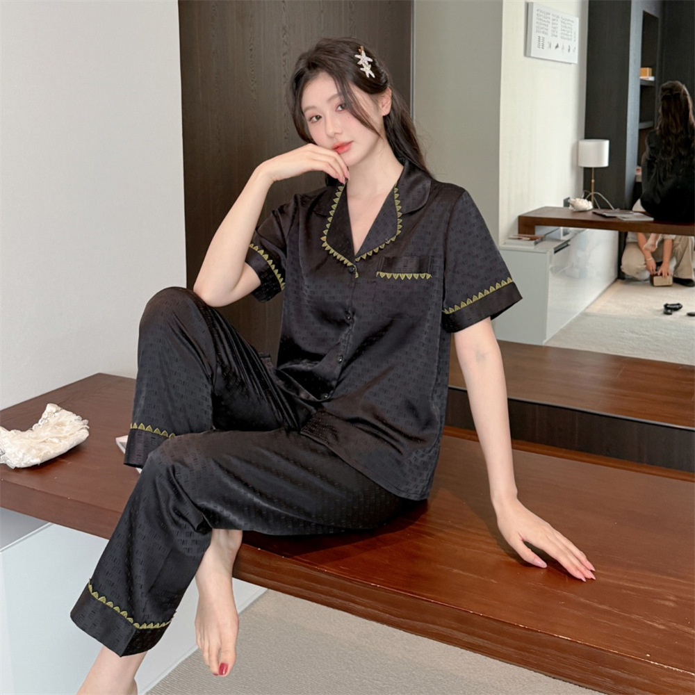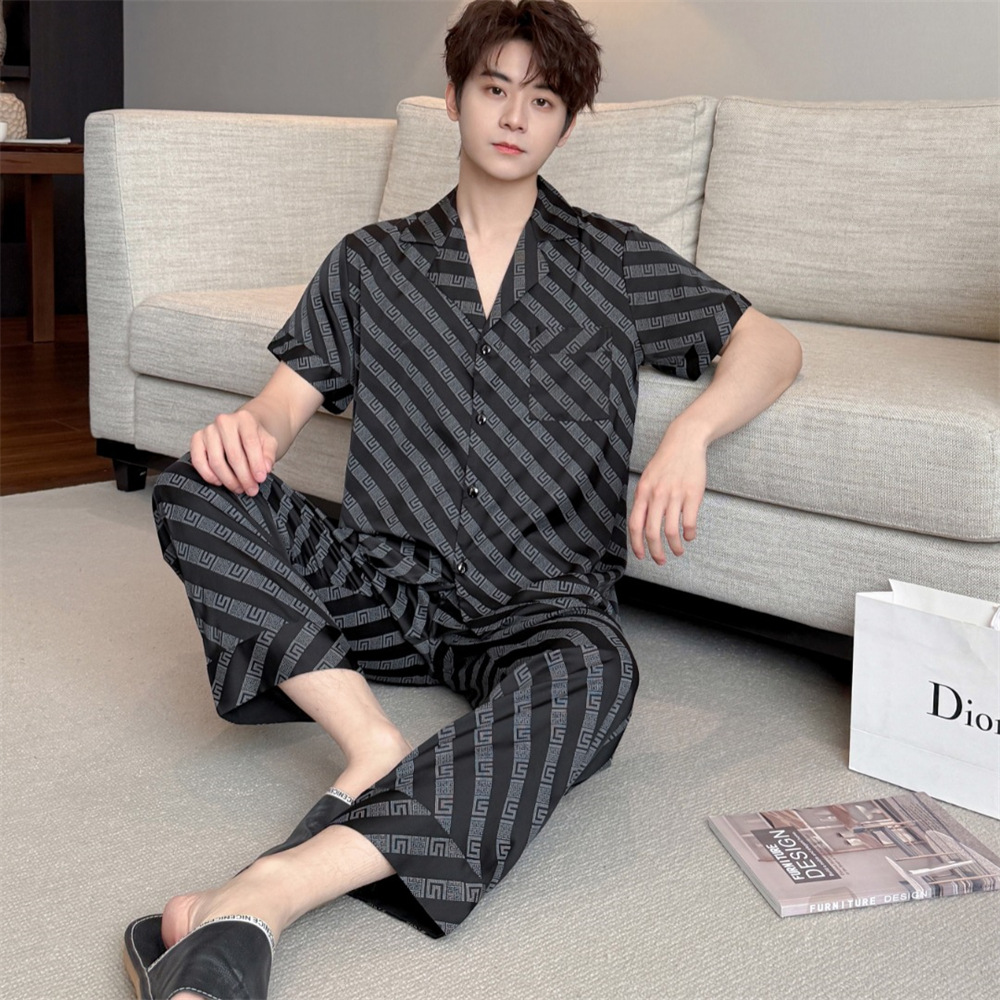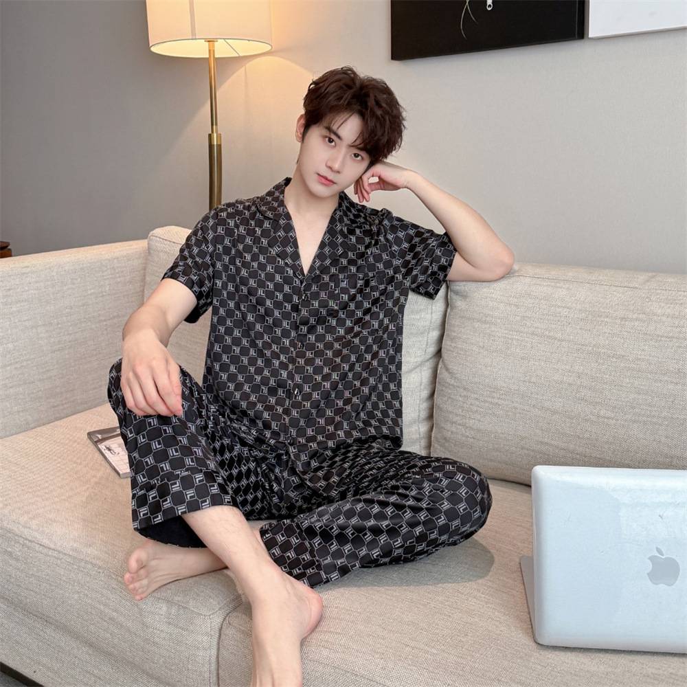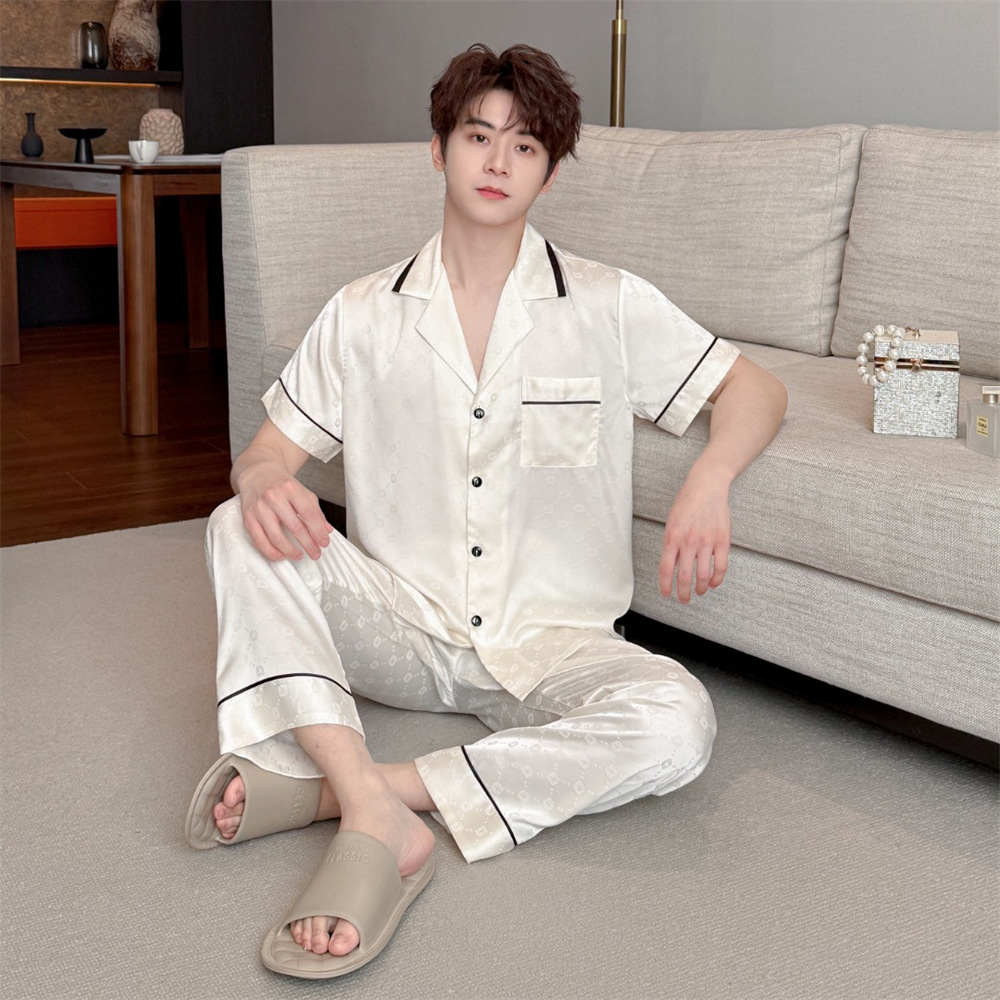 커플 잠옷 2025 봄과 여름 남자의 새로운 아이스 실크 짧은 소매 바지 세트 얇은 여성 홈 웨어 도매
