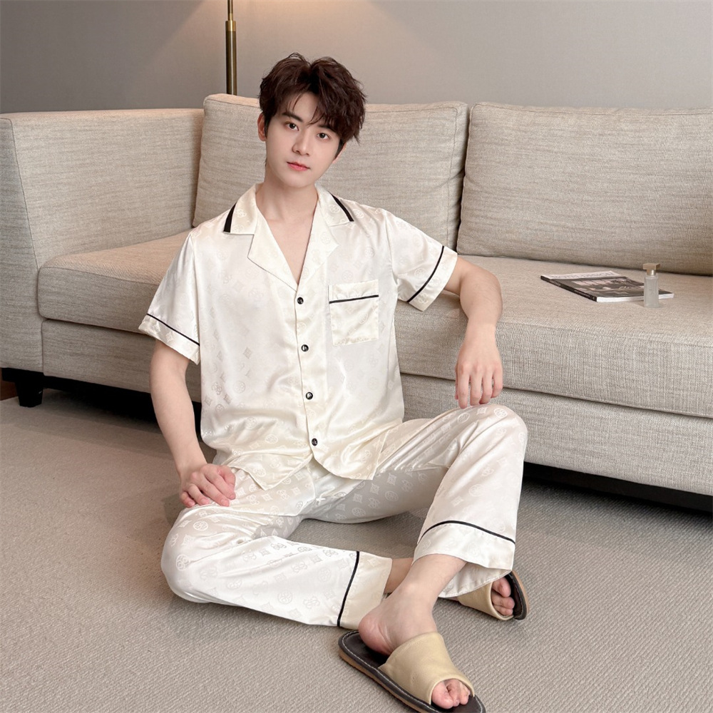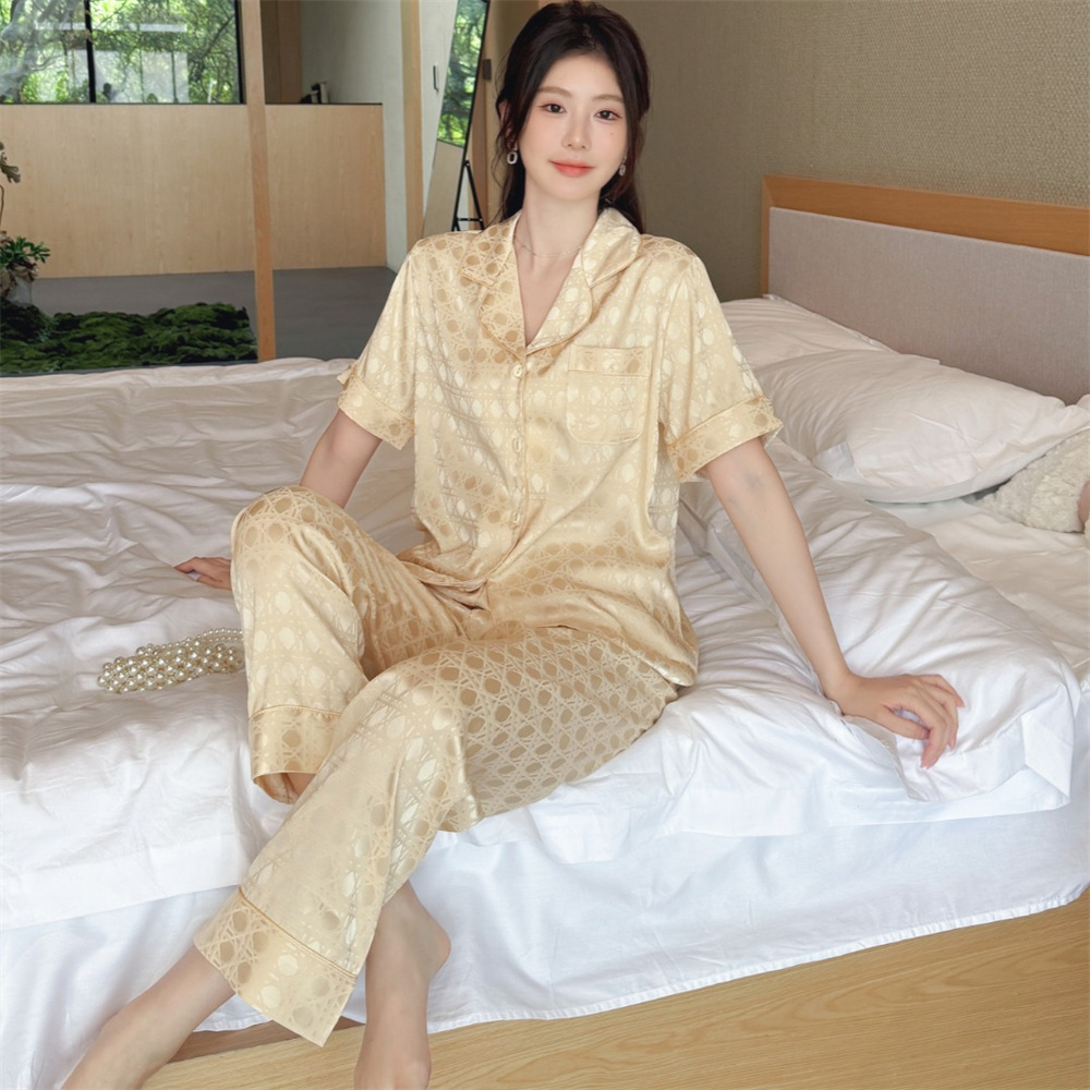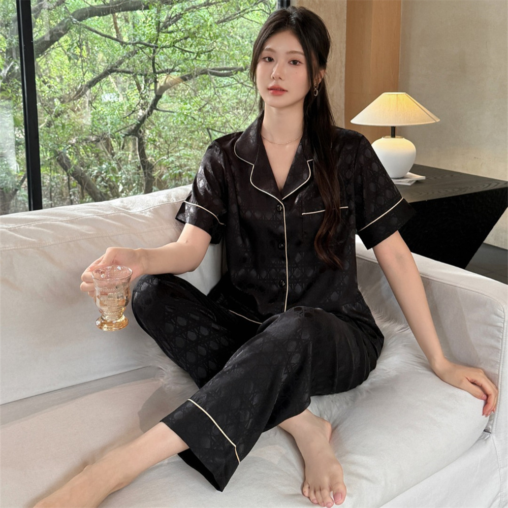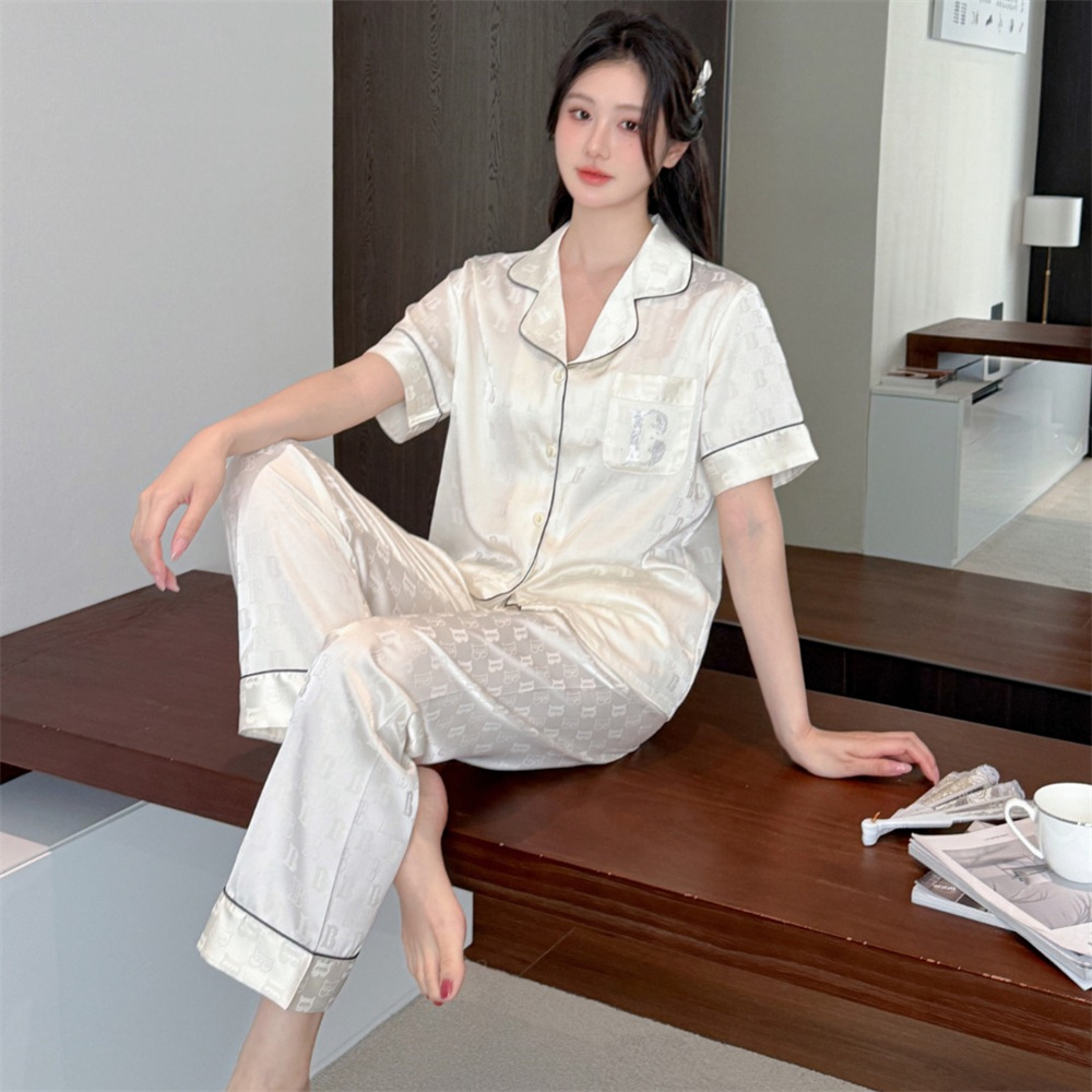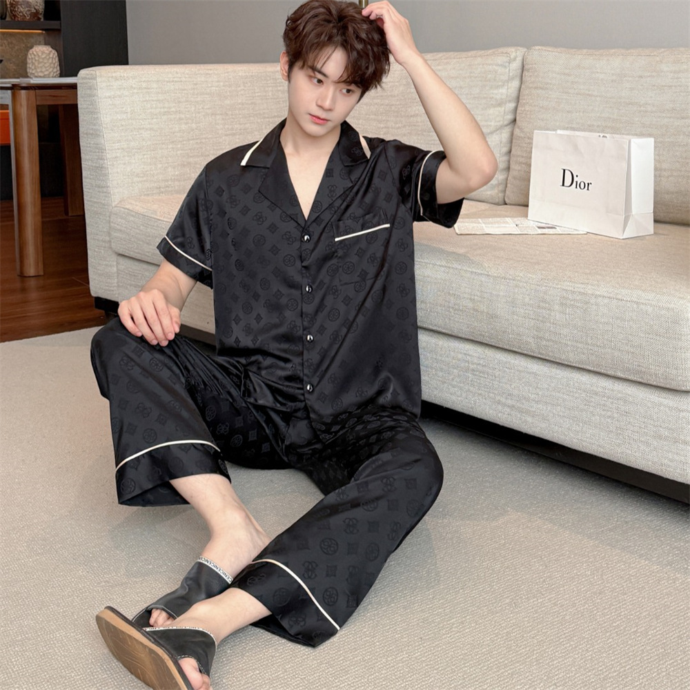 커플 잠옷 2025 봄과 여름 남자의 새로운 아이스 실크 짧은 소매 바지 세트 얇은 여성 홈 웨어 도매