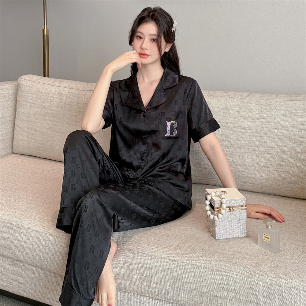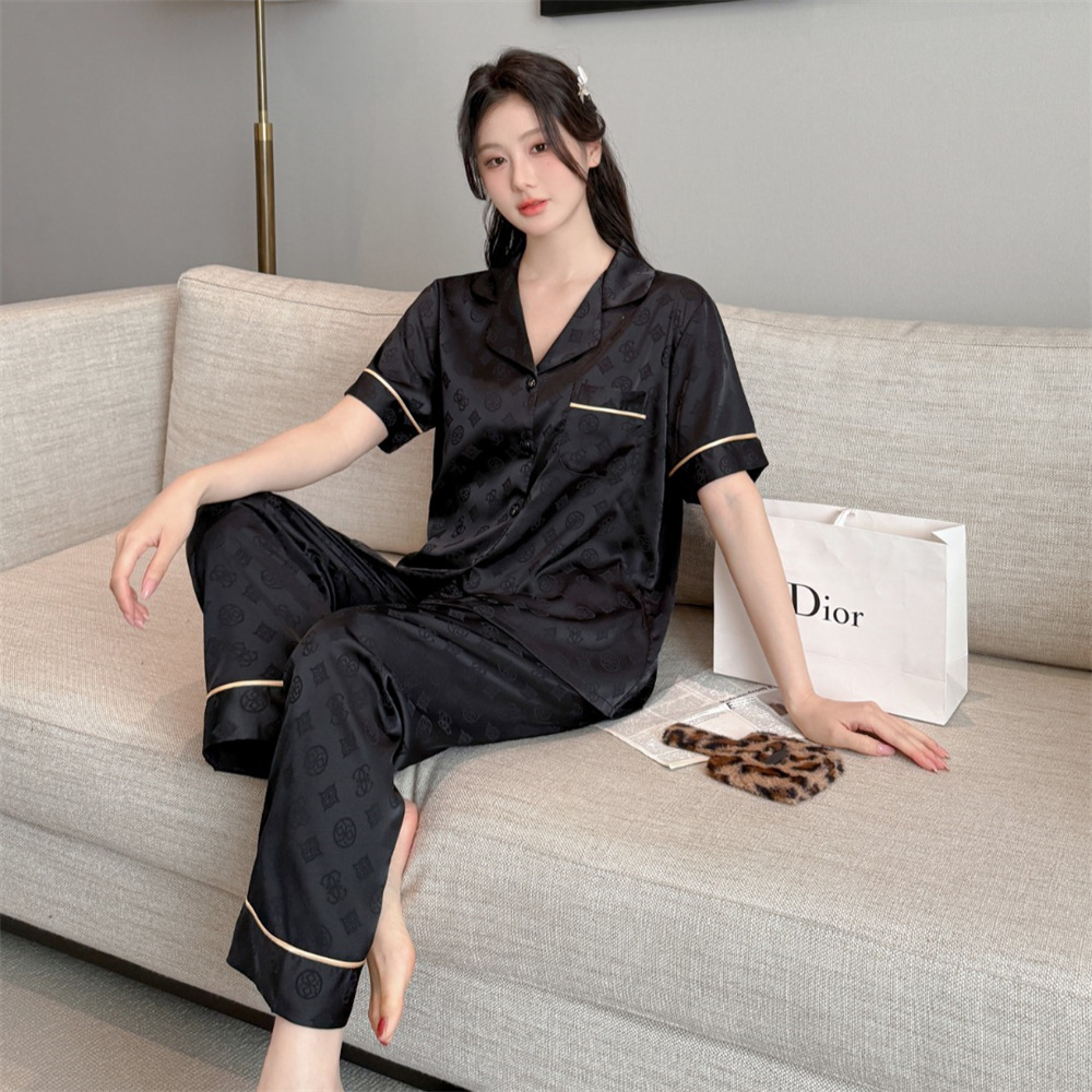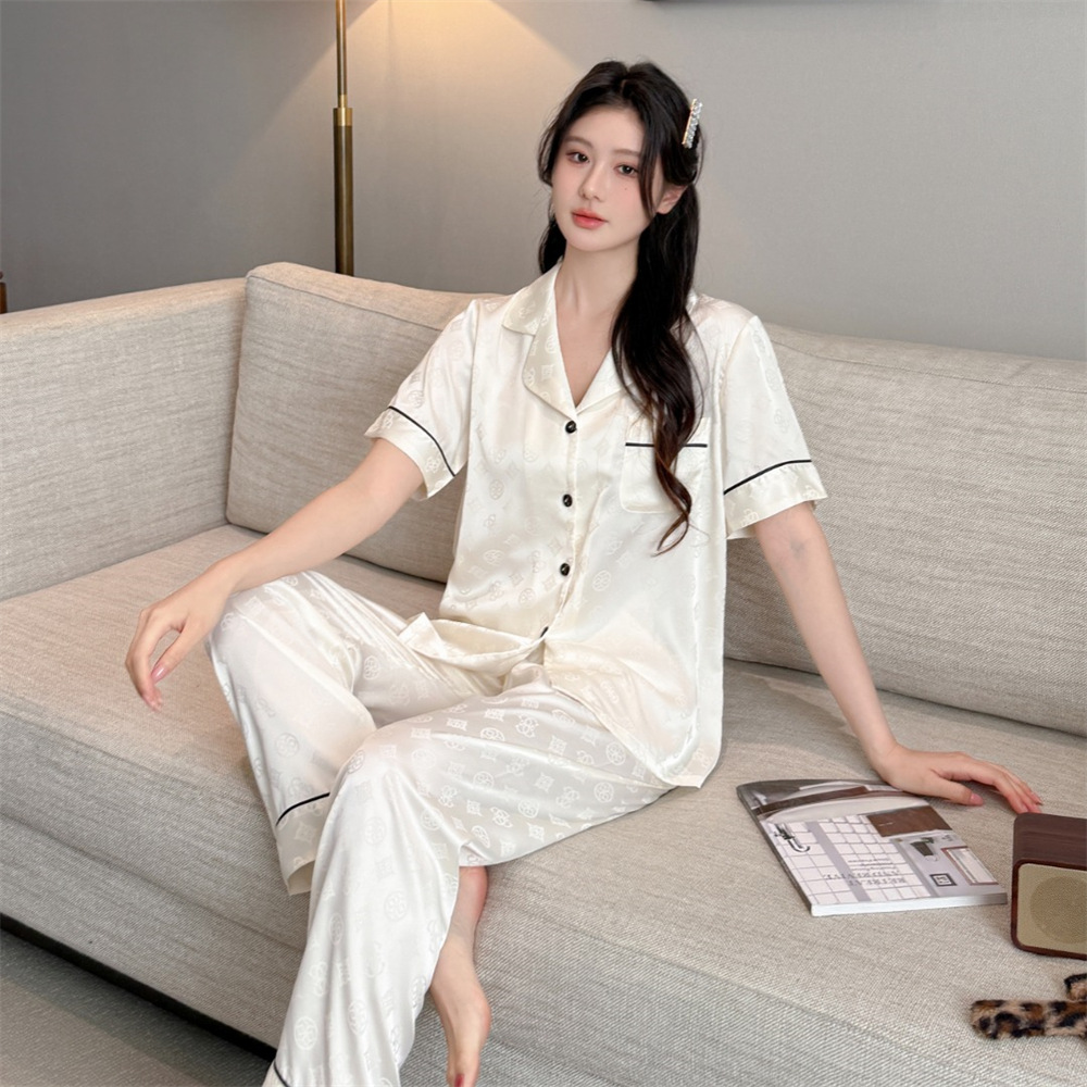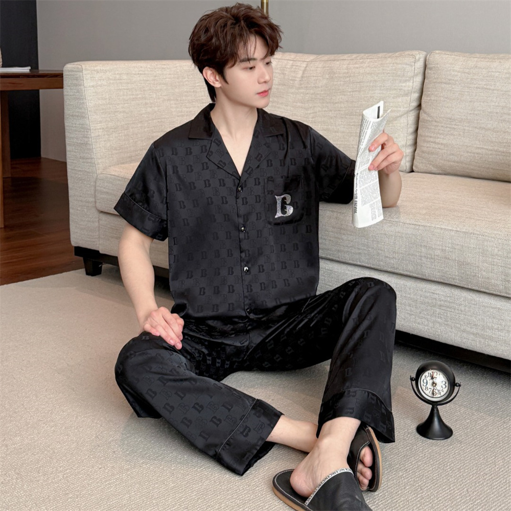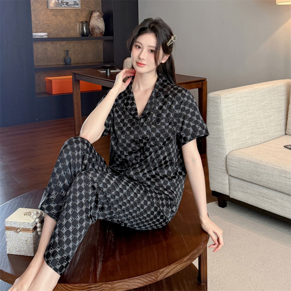 커플 잠옷 2025 봄과 여름 남자의 새로운 아이스 실크 짧은 소매 바지 세트 얇은 여성 홈 웨어 도매스토어 가기