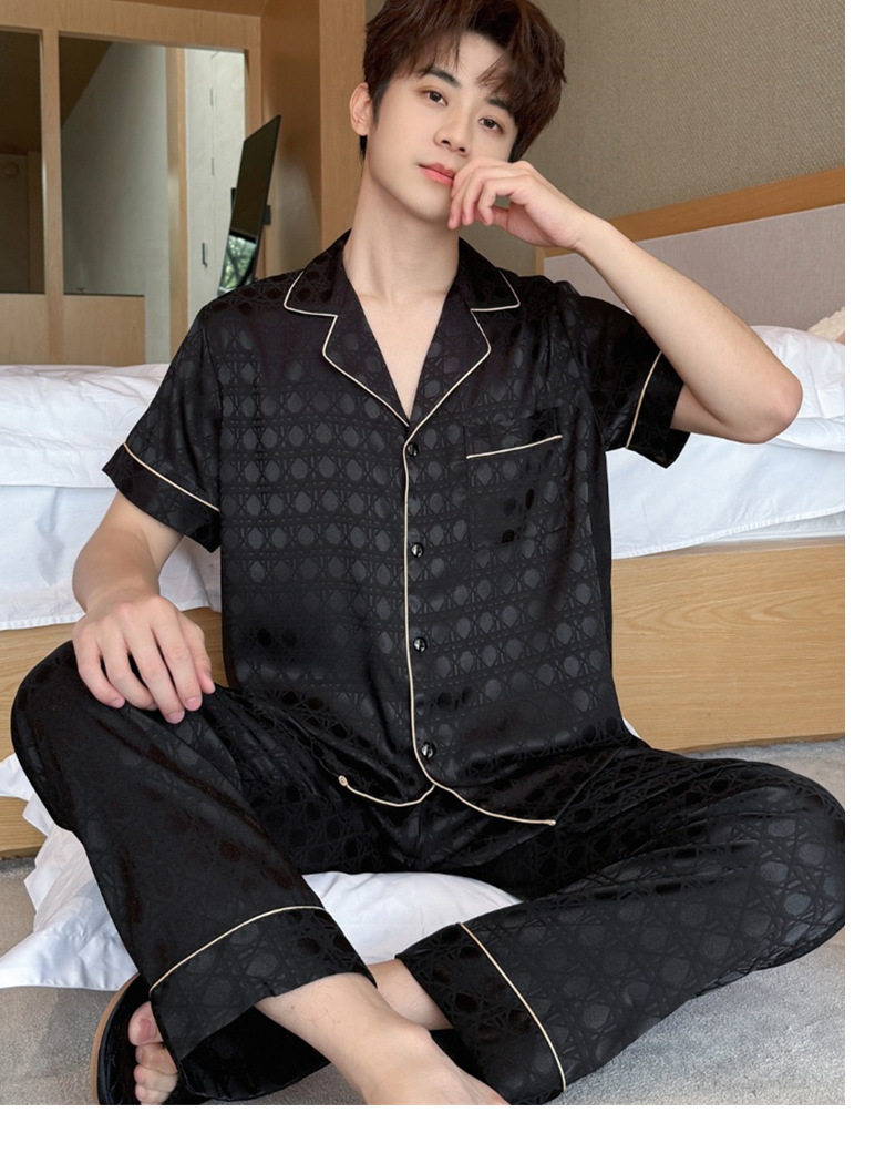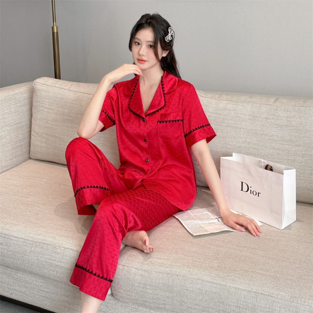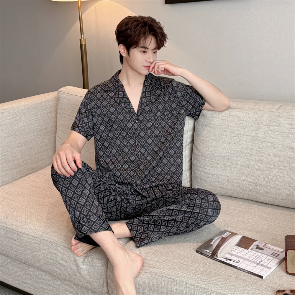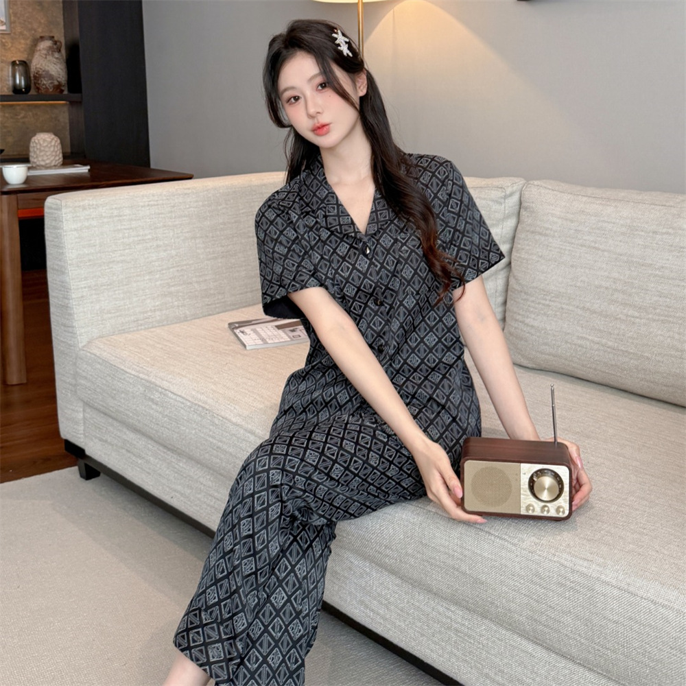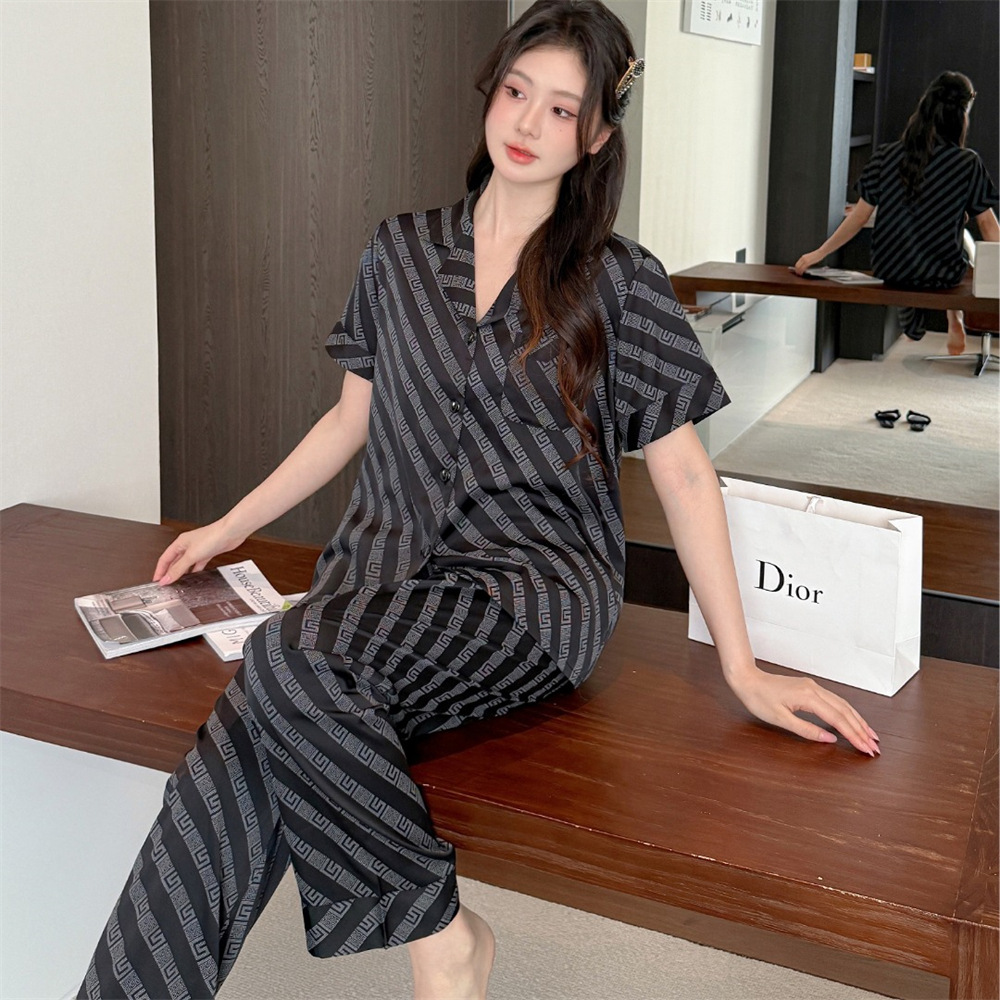 커플 잠옷 2025 봄과 여름 남자의 새로운 아이스 실크 짧은 소매 바지 세트 얇은 여성 홈 웨어 도매스토어 가기