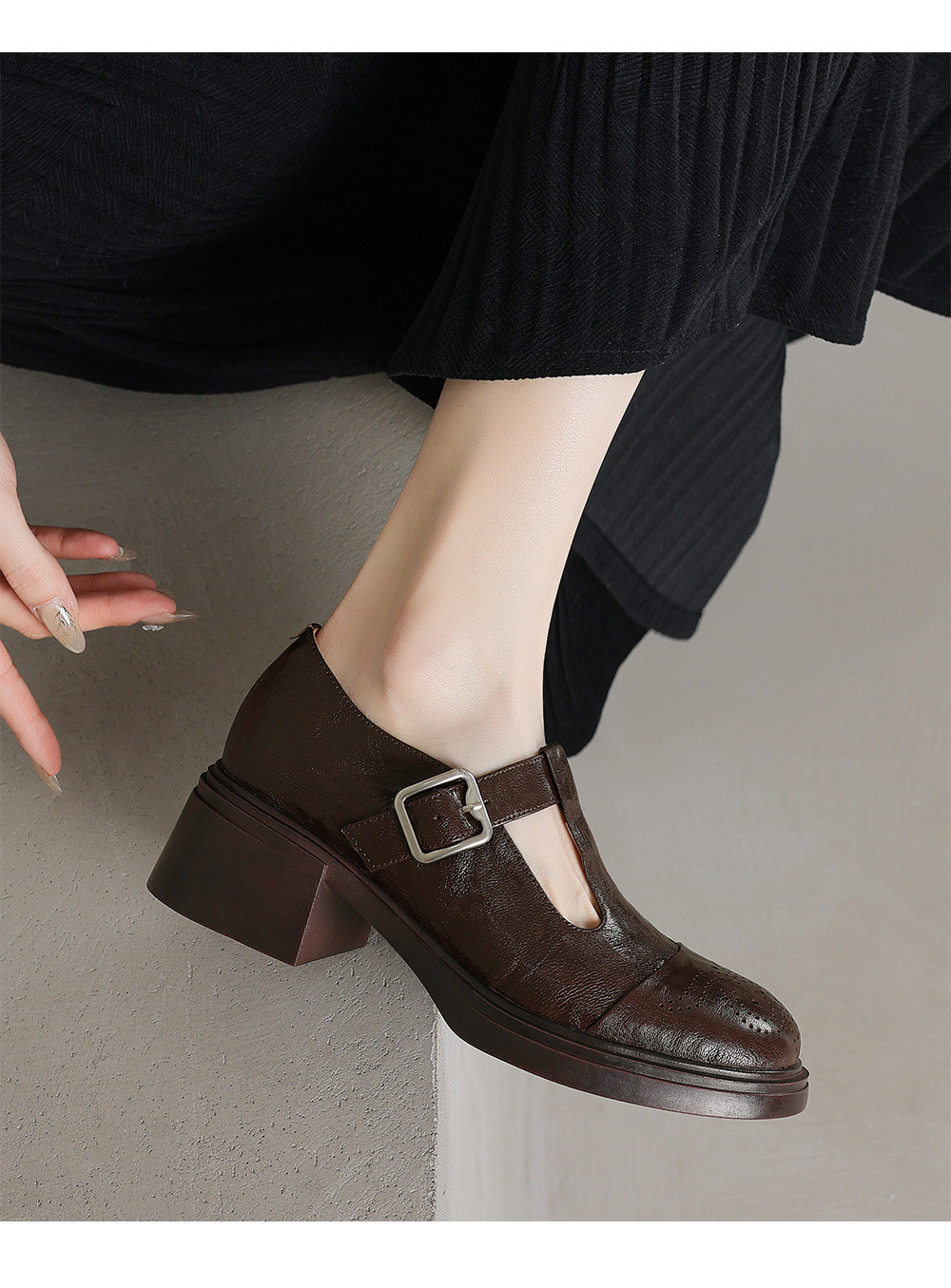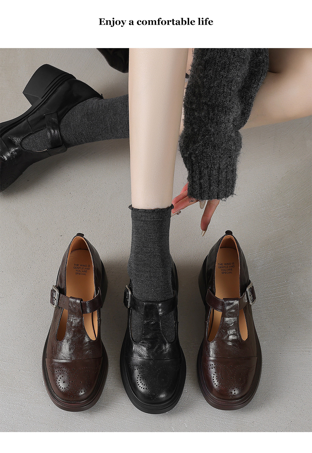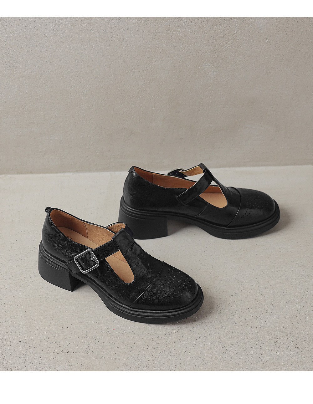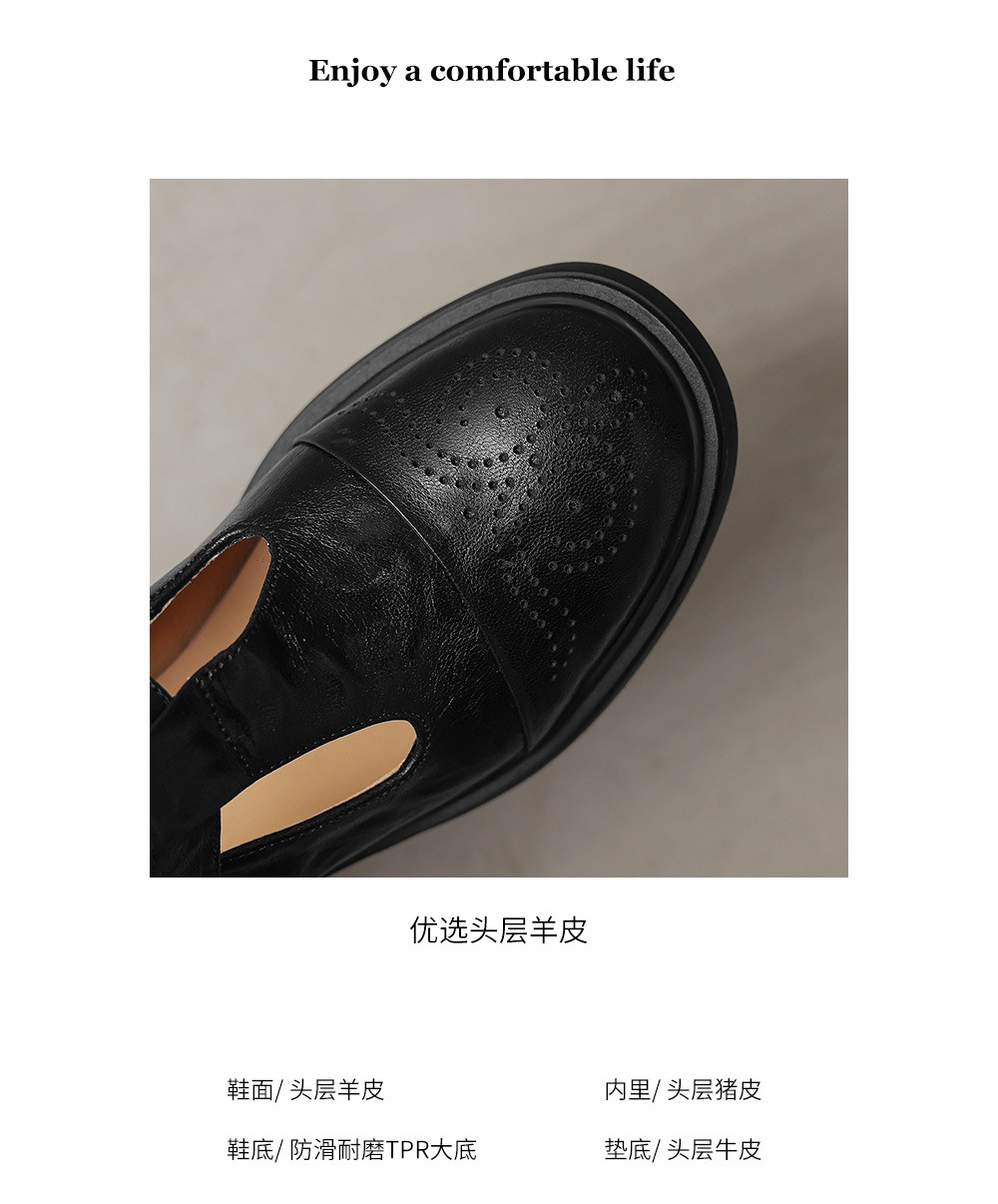 최고 양가죽 5cm 두꺼운 밑창 로퍼 2025 봄 여름 가을 정품 가죽 학생 T-스트랩 싱글 레이어 신발 미드 힐 풀 가죽 여성