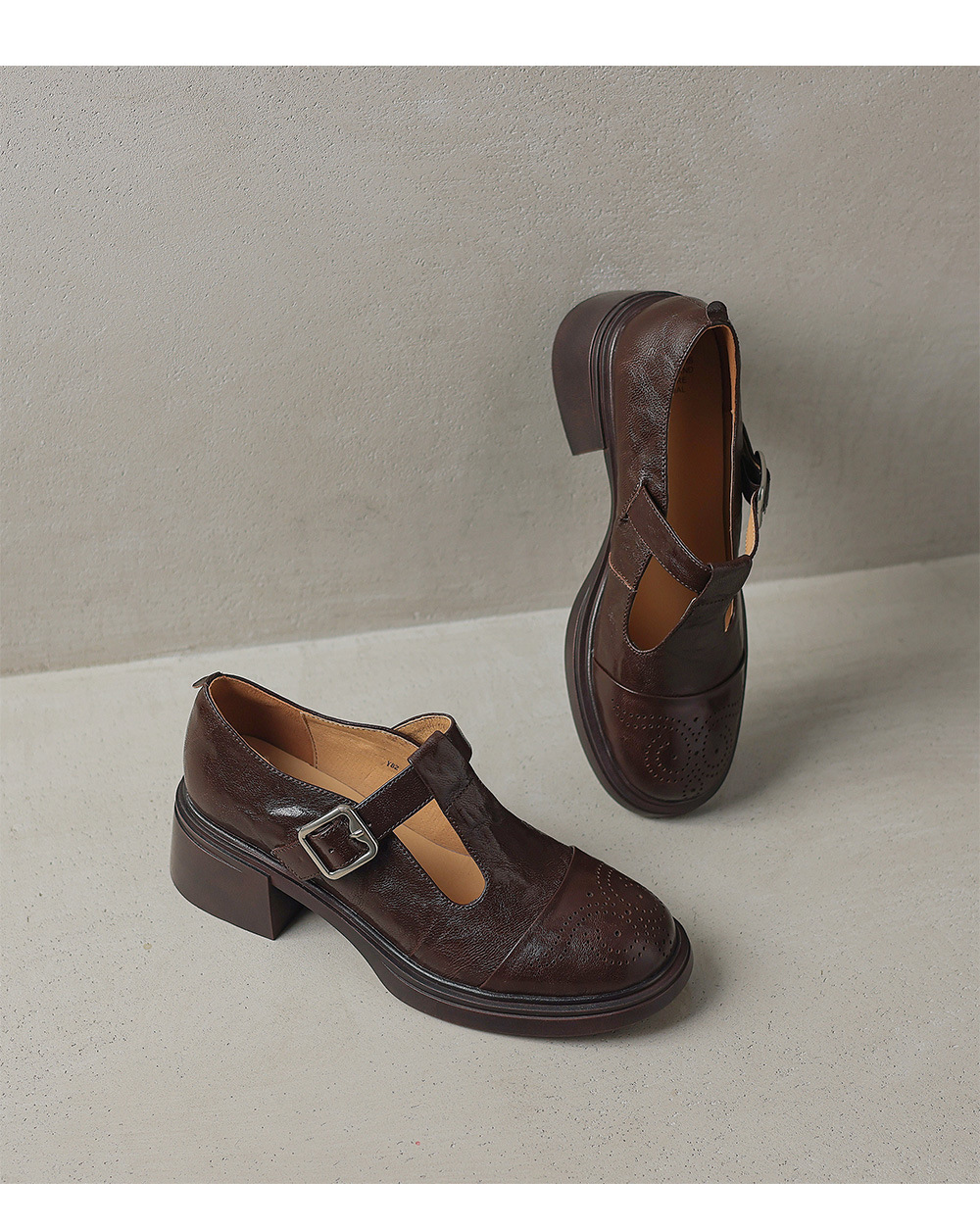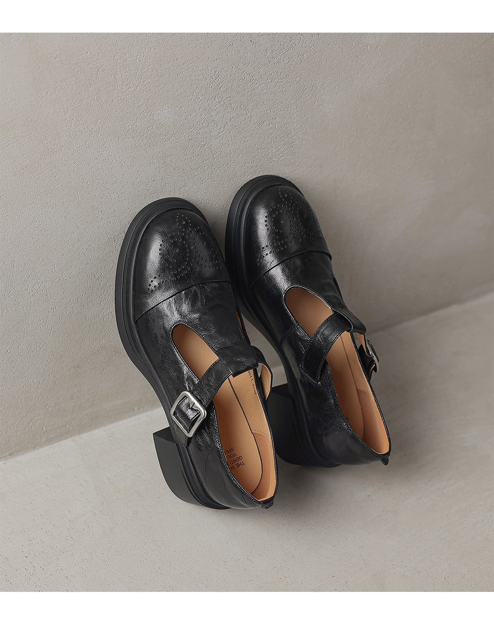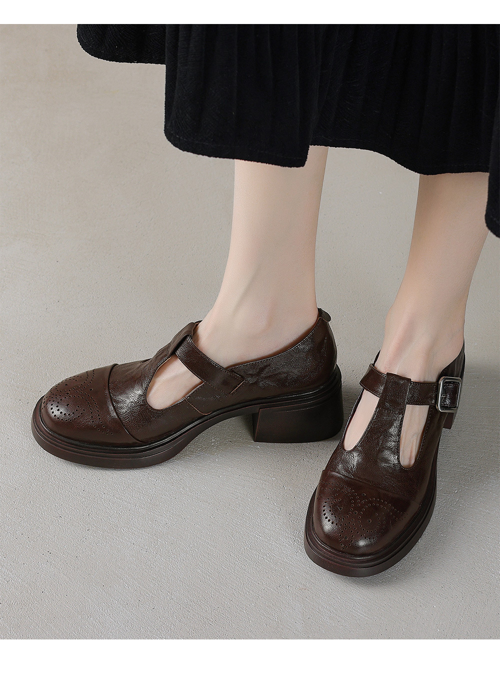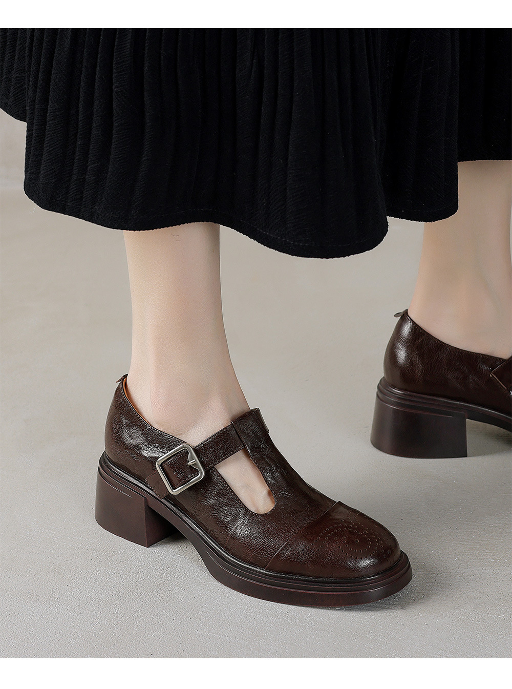 최고 양가죽 5cm 두꺼운 밑창 로퍼 2025 봄 여름 가을 정품 가죽 학생 T-스트랩 싱글 레이어 신발 미드 힐 풀 가죽 여성