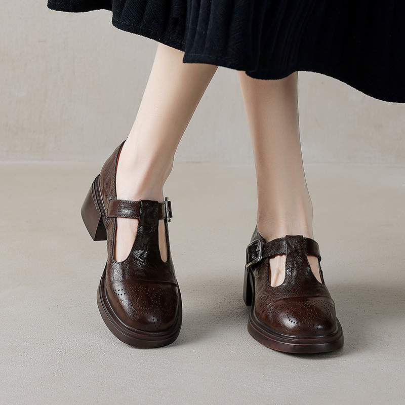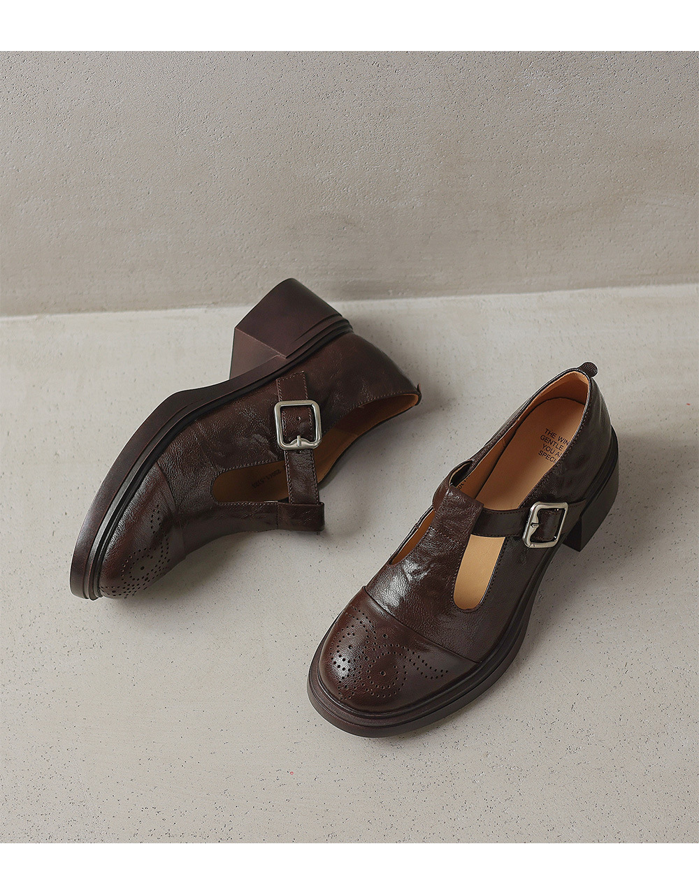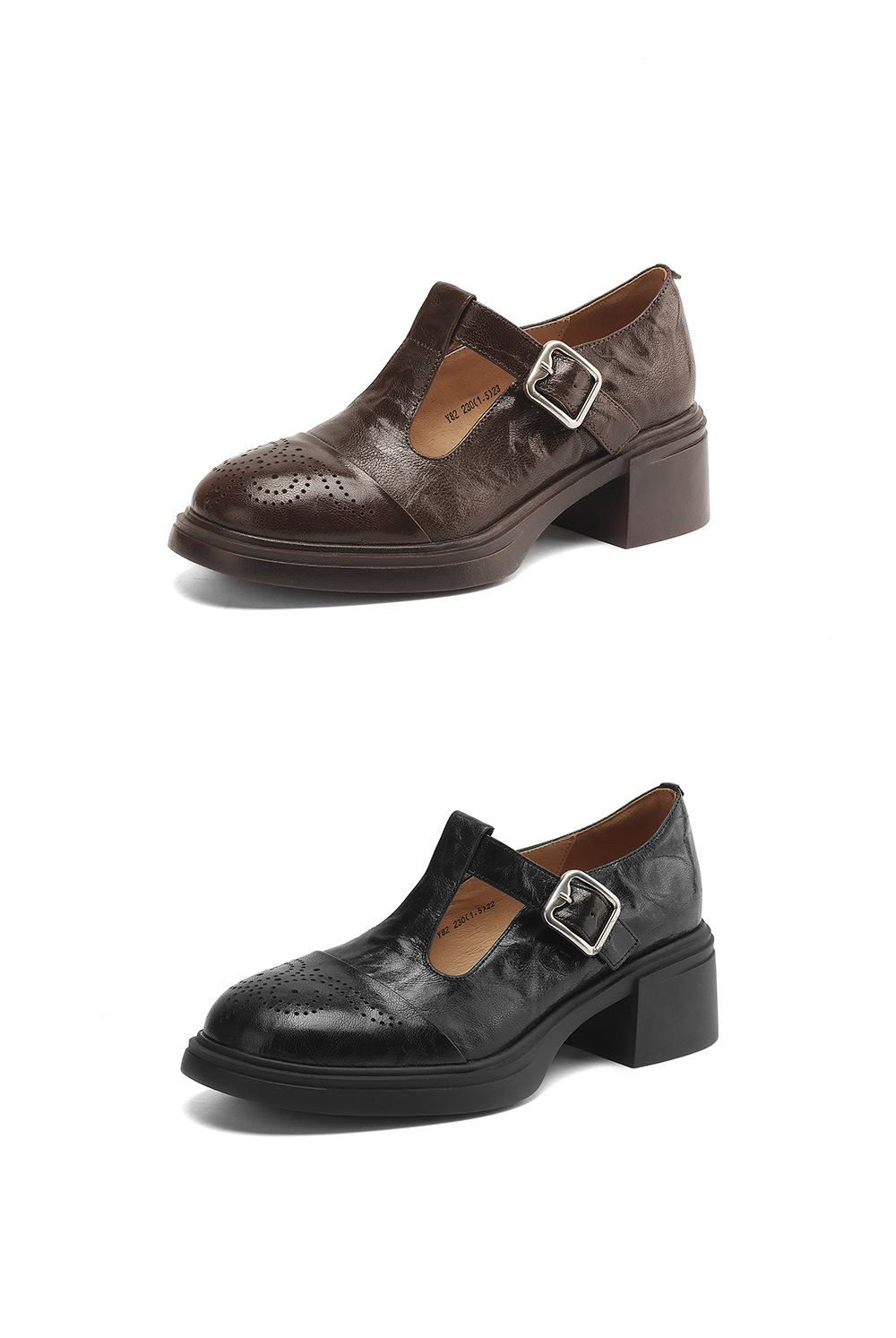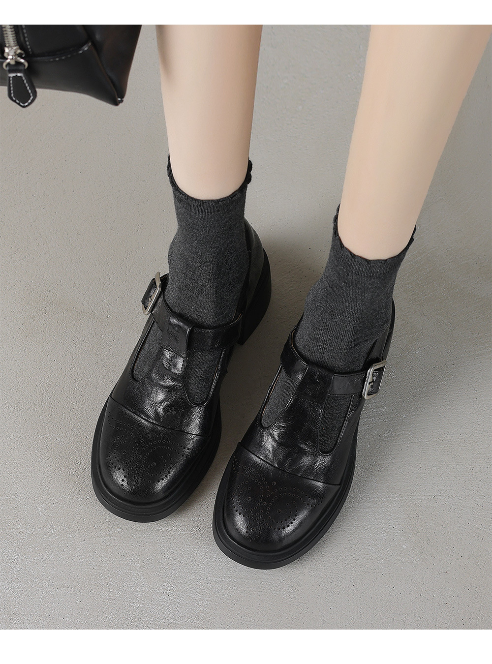 최고 양가죽 5cm 두꺼운 밑창 로퍼 2025 봄 여름 가을 정품 가죽 학생 T-스트랩 싱글 레이어 신발 미드 힐 풀 가죽 여성