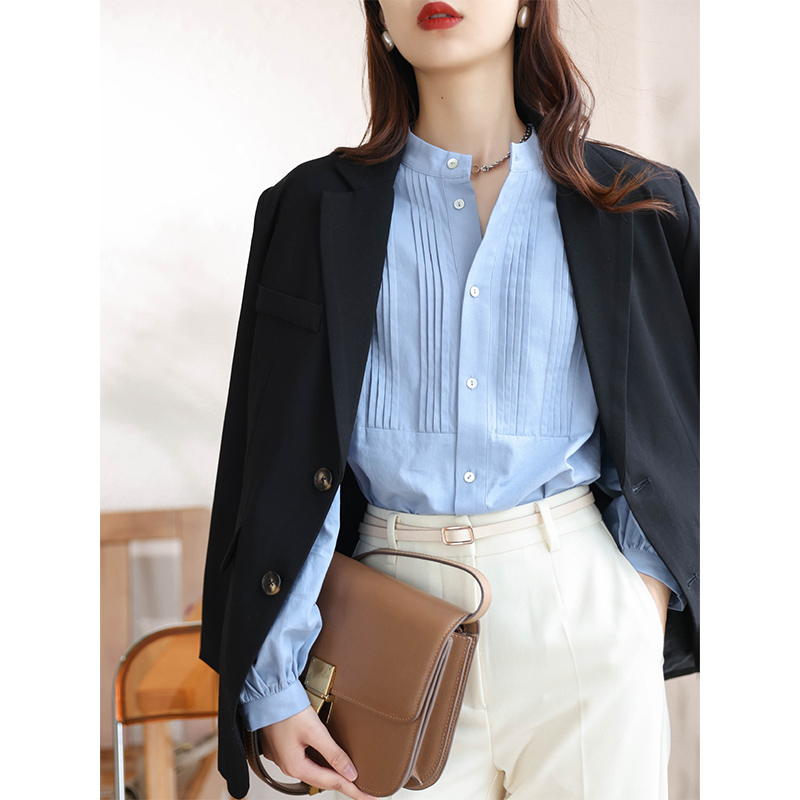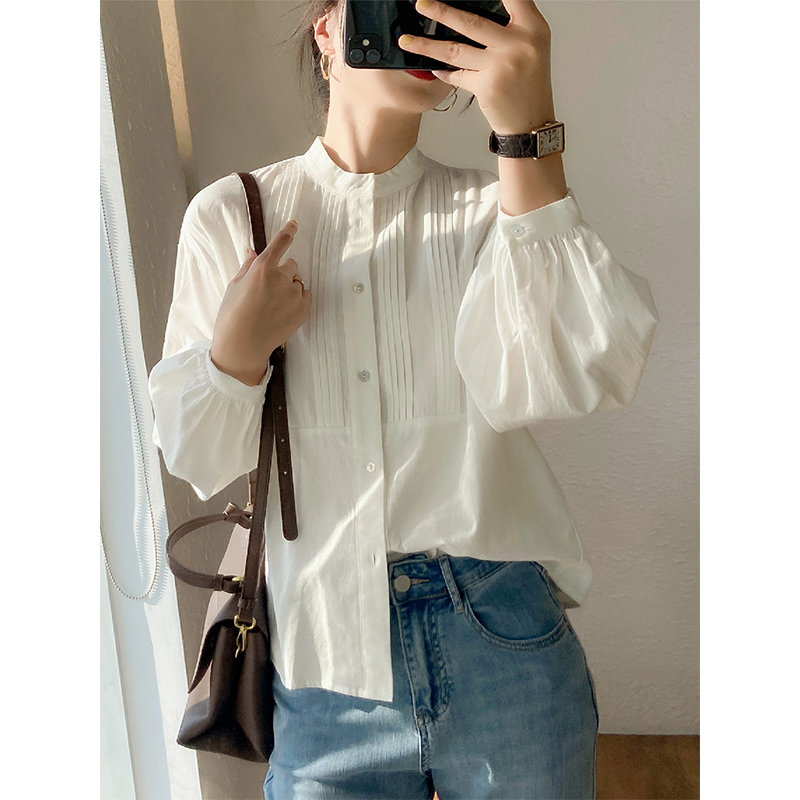 2025 봄 새로운 프랑스 스타일 우아한 화이트 랜턴 소매 주름 셔츠 여성용 긴 소매 셔츠 디자인 틈새스토어 가기