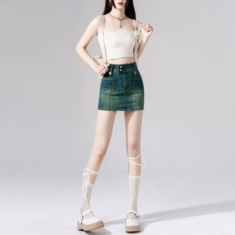 눈부심 방지 복고풍 고민 데님 스커트 복고풍 블루 여성 의류 2025 봄 엉덩이 스커트 외부 슬림스토어 가기