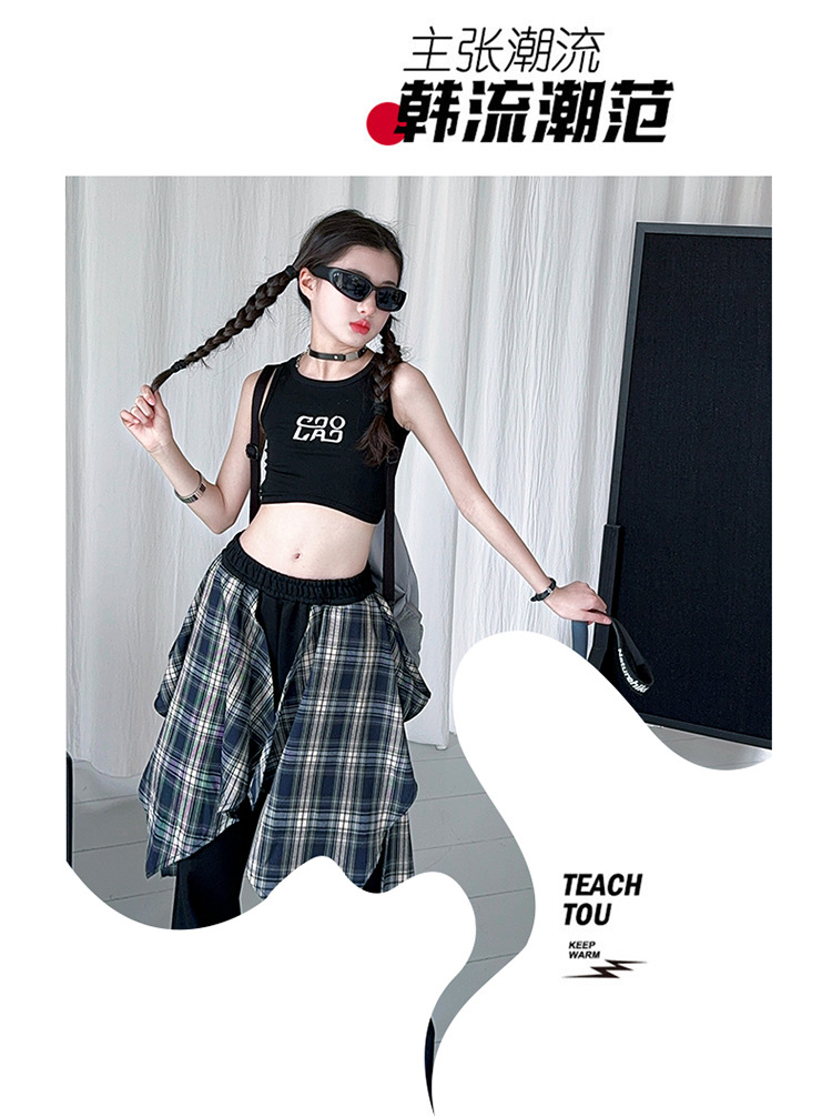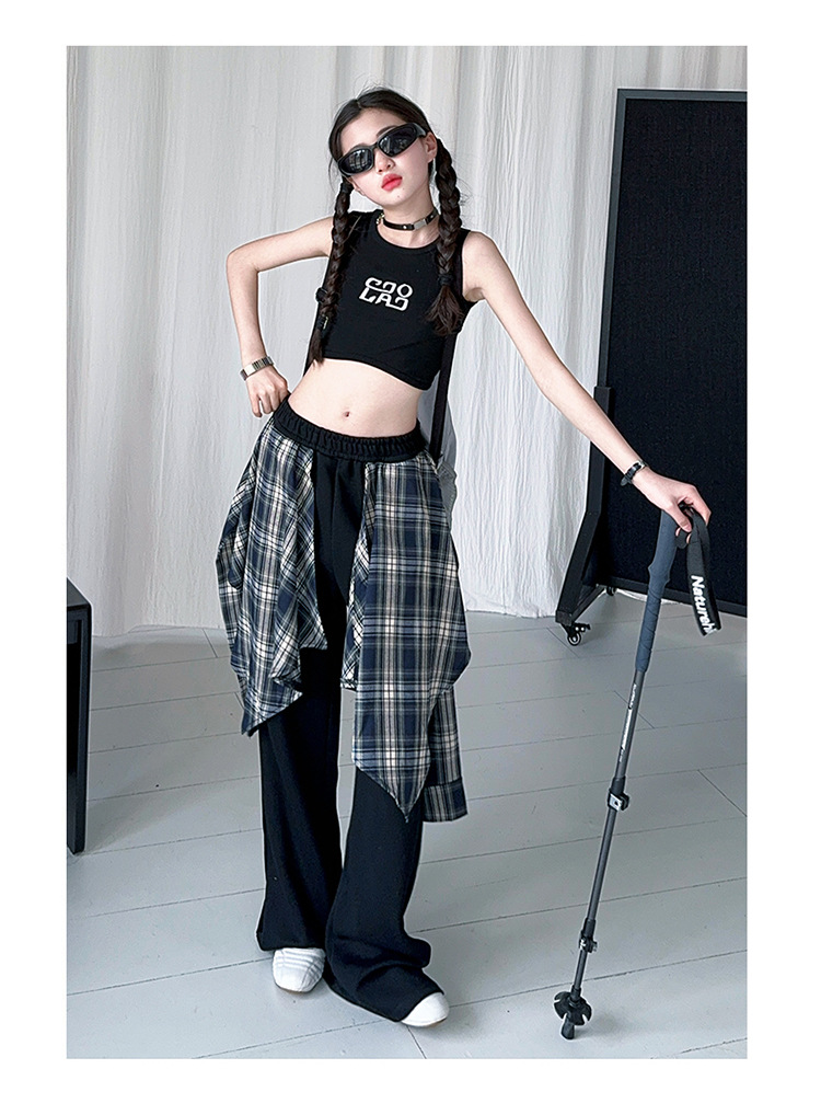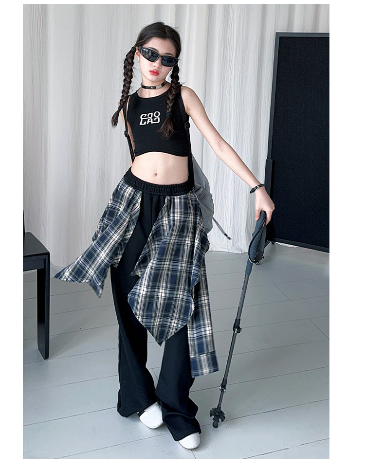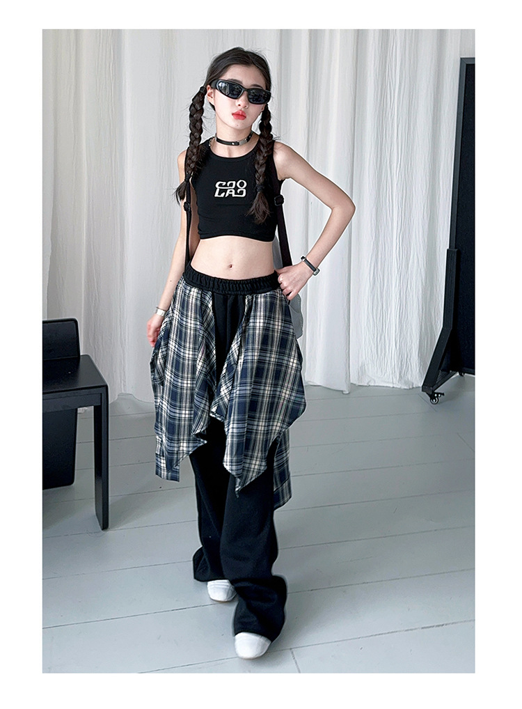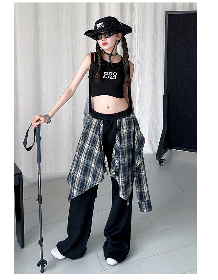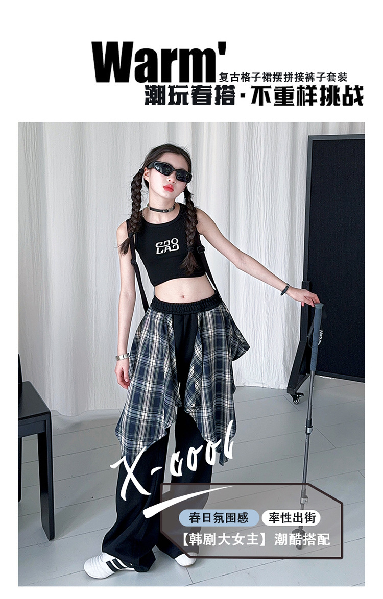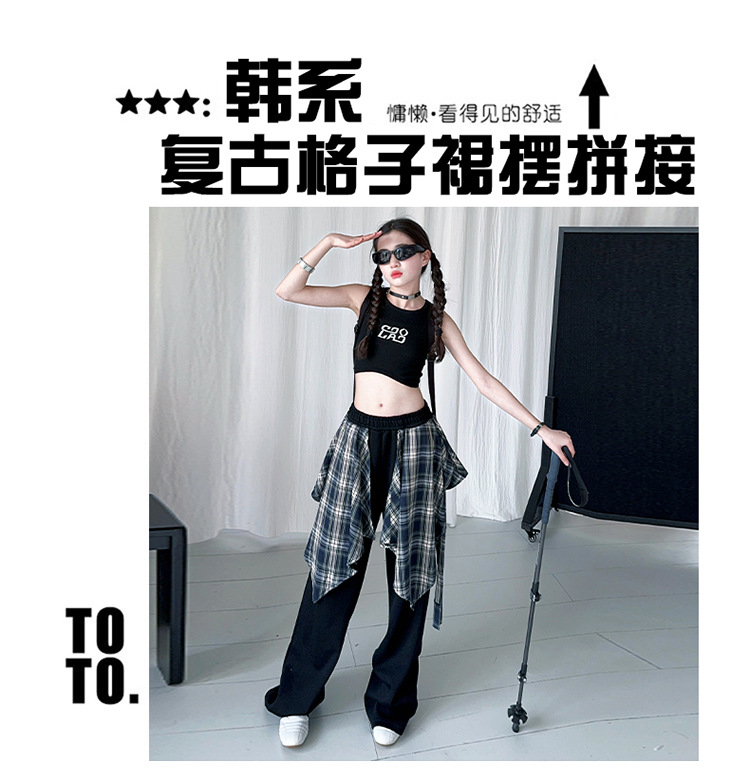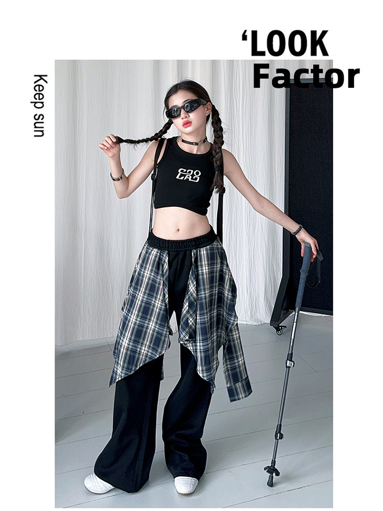 여자 아메리칸 스트리트 조끼 세트 어린이 가짜 투피스 스티칭 스커트 와이드 레그 캐주얼 바지 재즈 댄스 투피스 세트스토어 가기