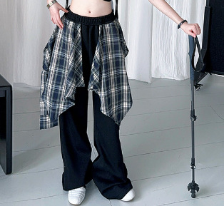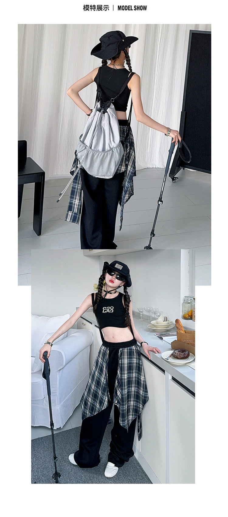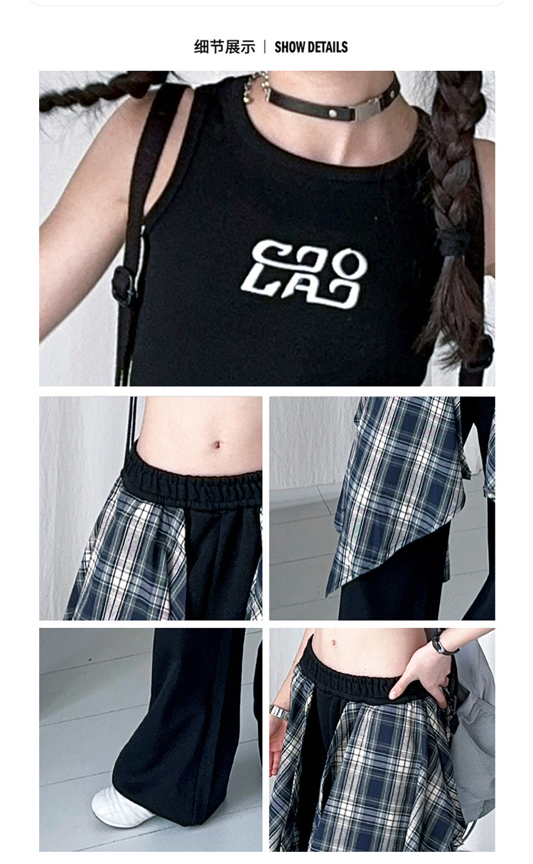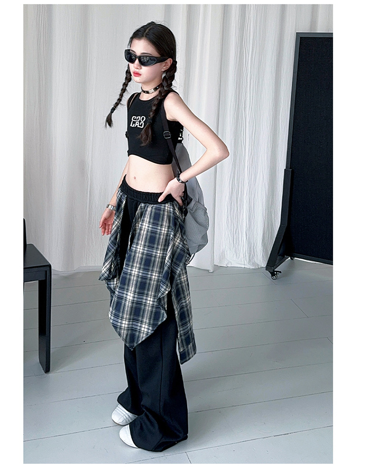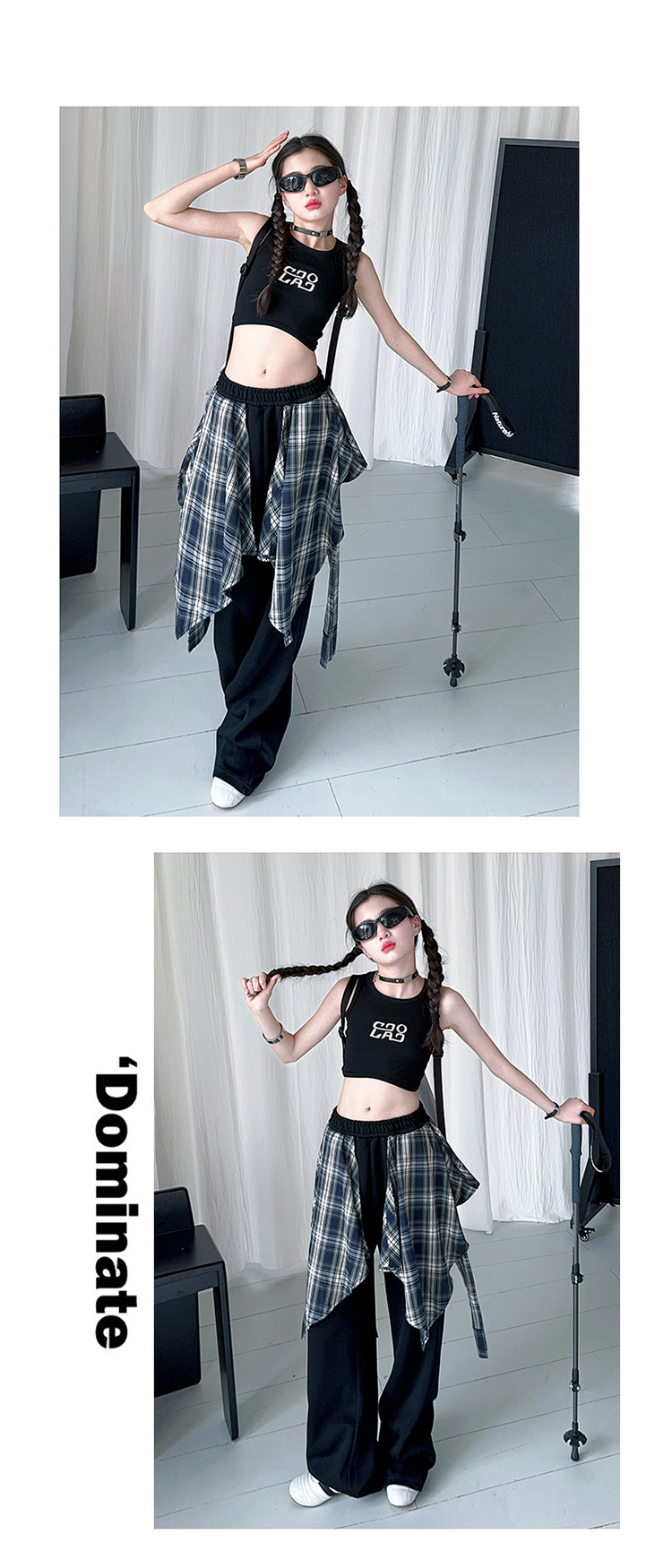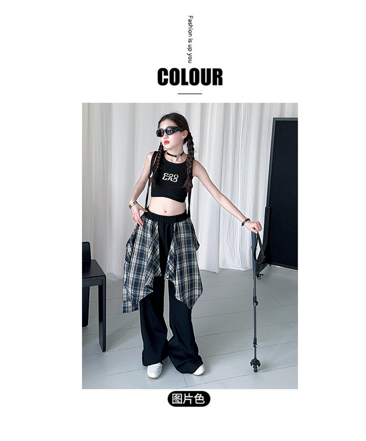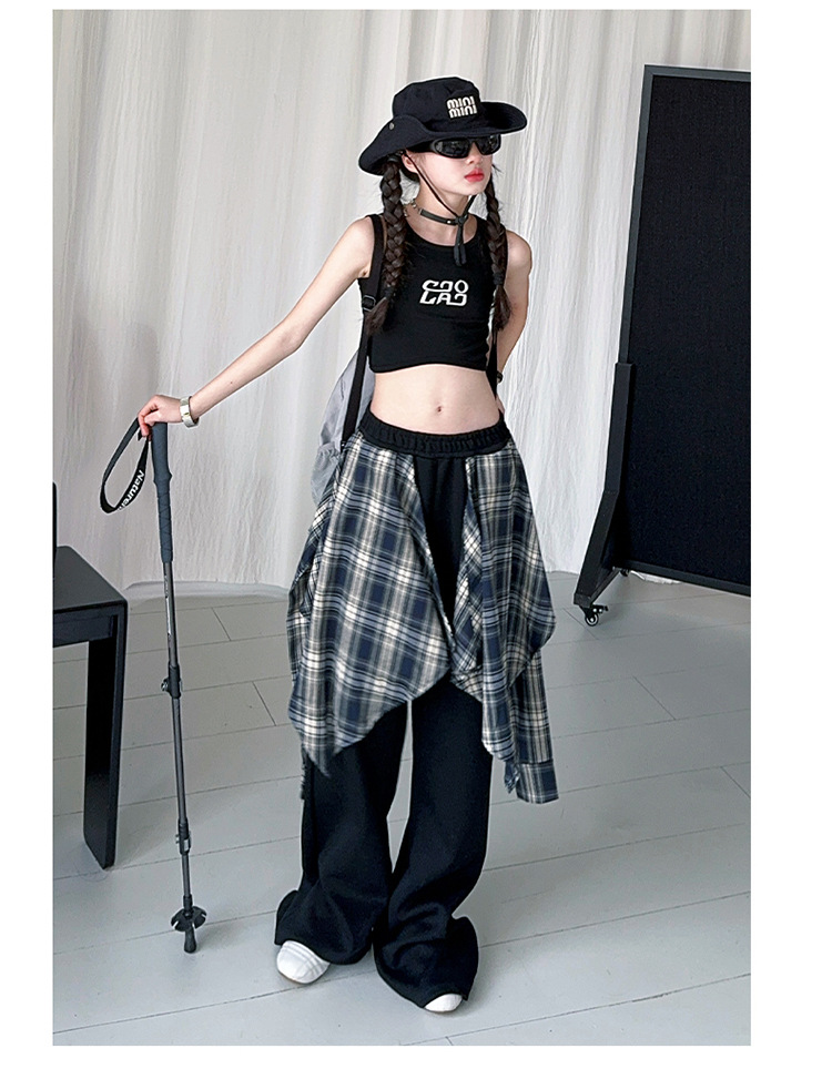 여자 아메리칸 스트리트 조끼 세트 어린이 가짜 투피스 스티칭 스커트 와이드 레그 캐주얼 바지 재즈 댄스 투피스 세트스토어 가기
