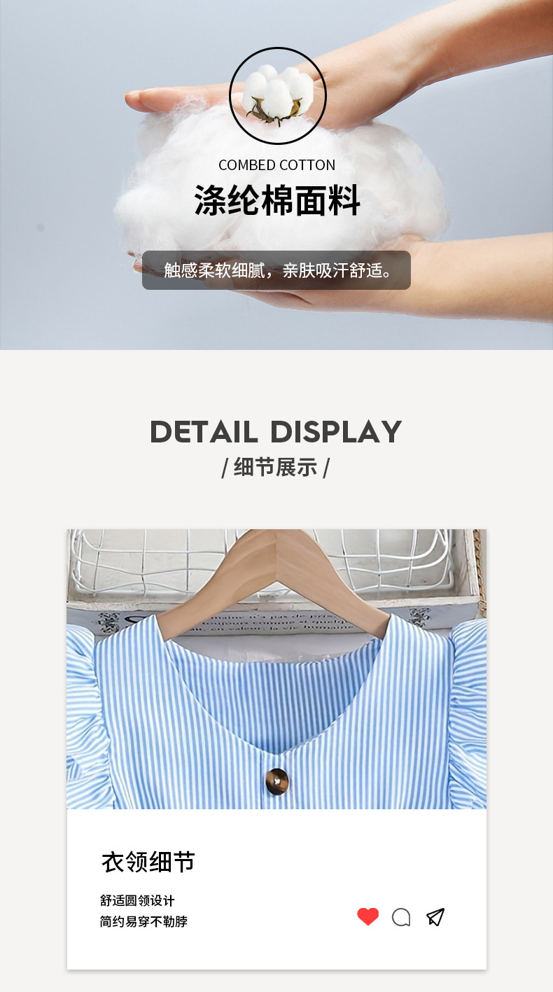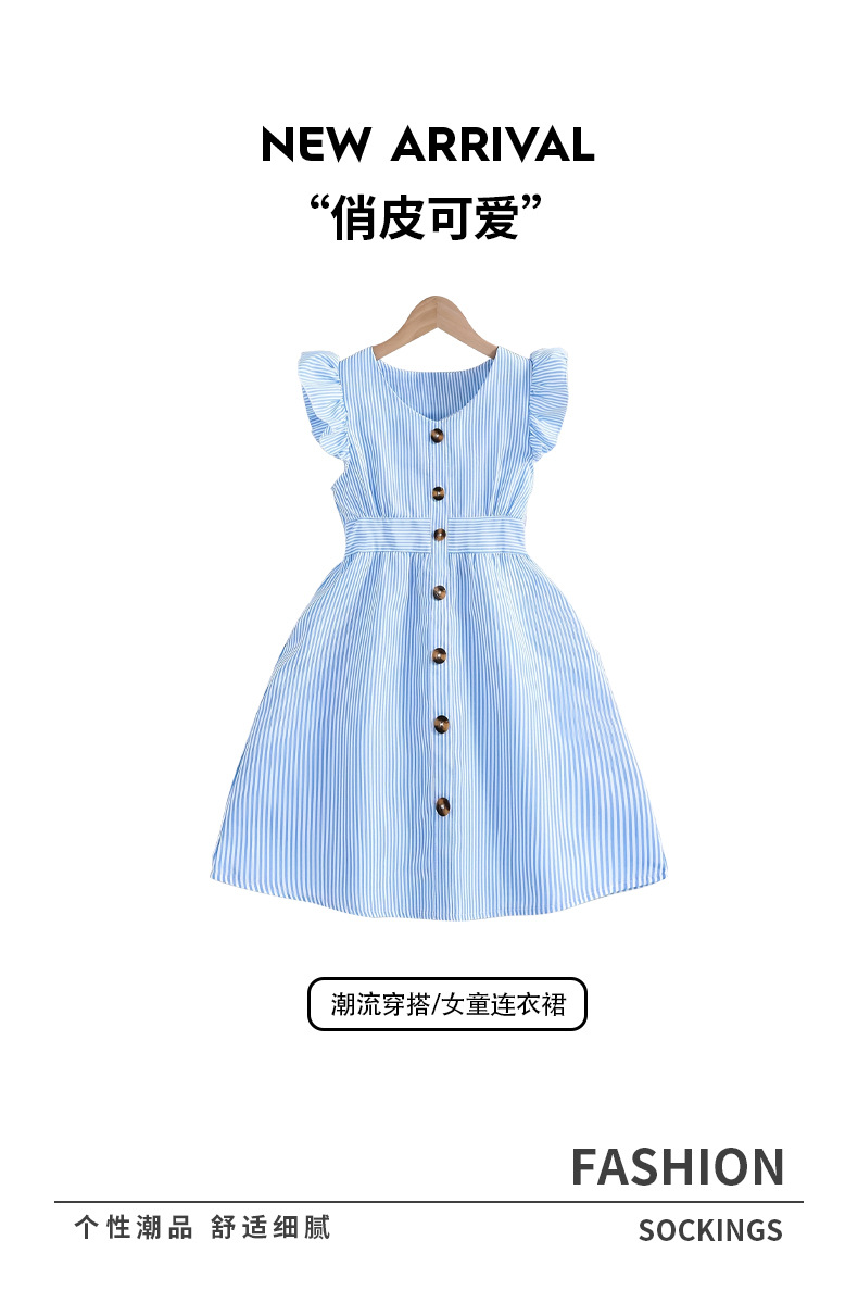 여름 소녀의 플라잉 슬리브 핀스트라이프 원피스 블루 화이트 싱글 로우 버튼 프랑스 패션 어린이 조끼 A-라인 스커트스토어 가기