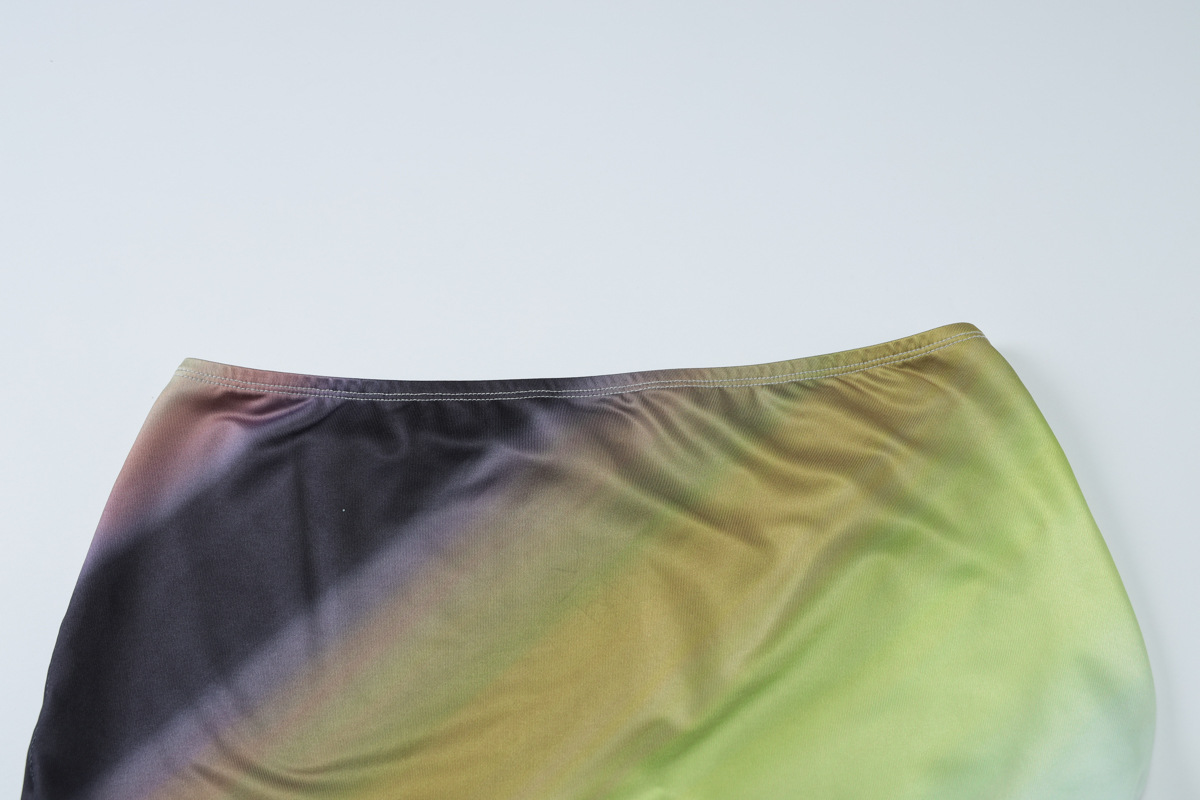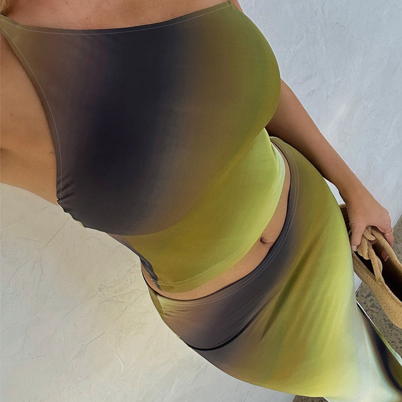 유럽풍 크로스보더 여성복 2025 여름 신상 그라데이션 컬러 원숄더 백리스 휴가 투피스 패션 세트