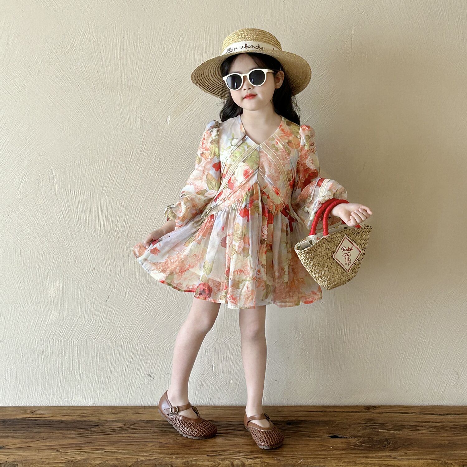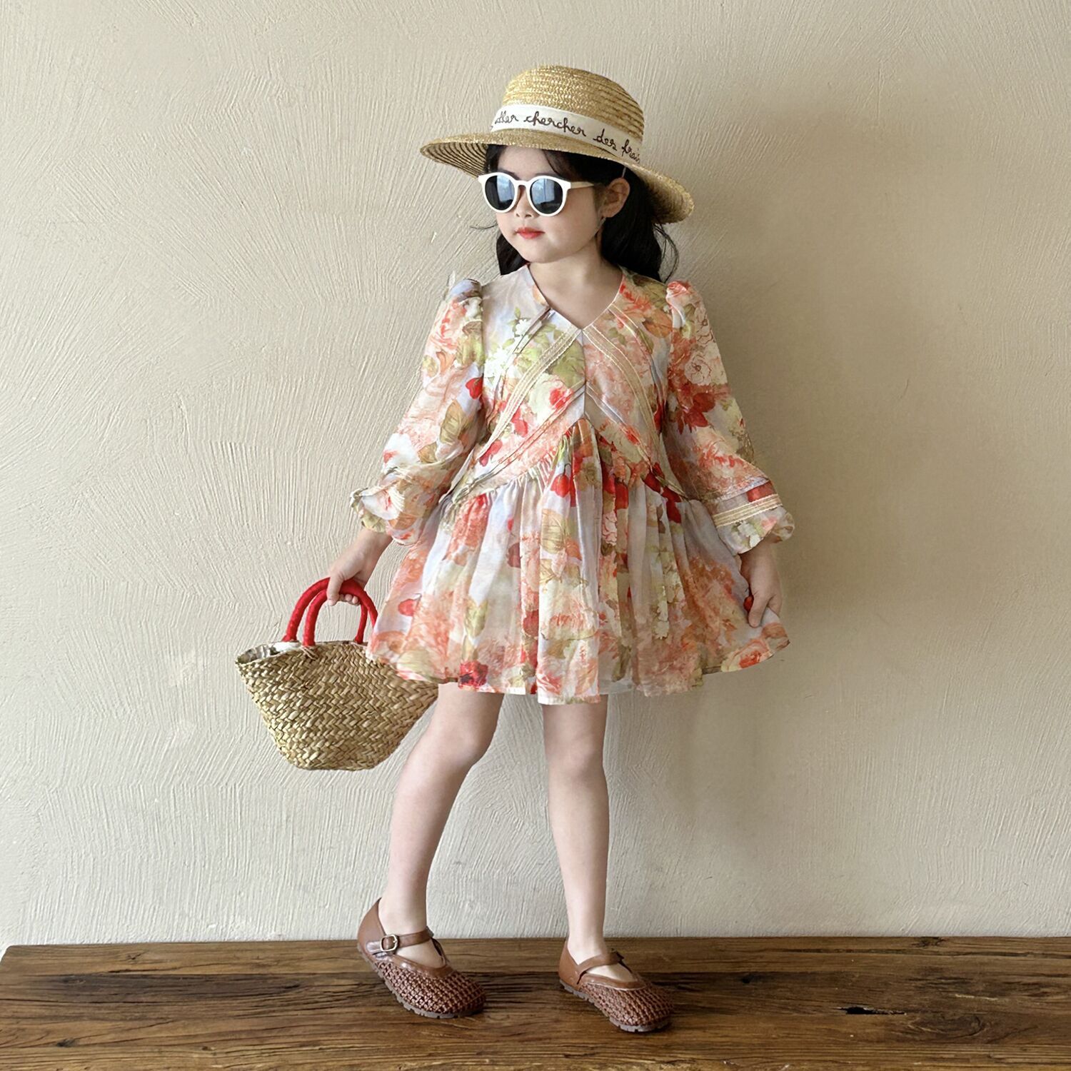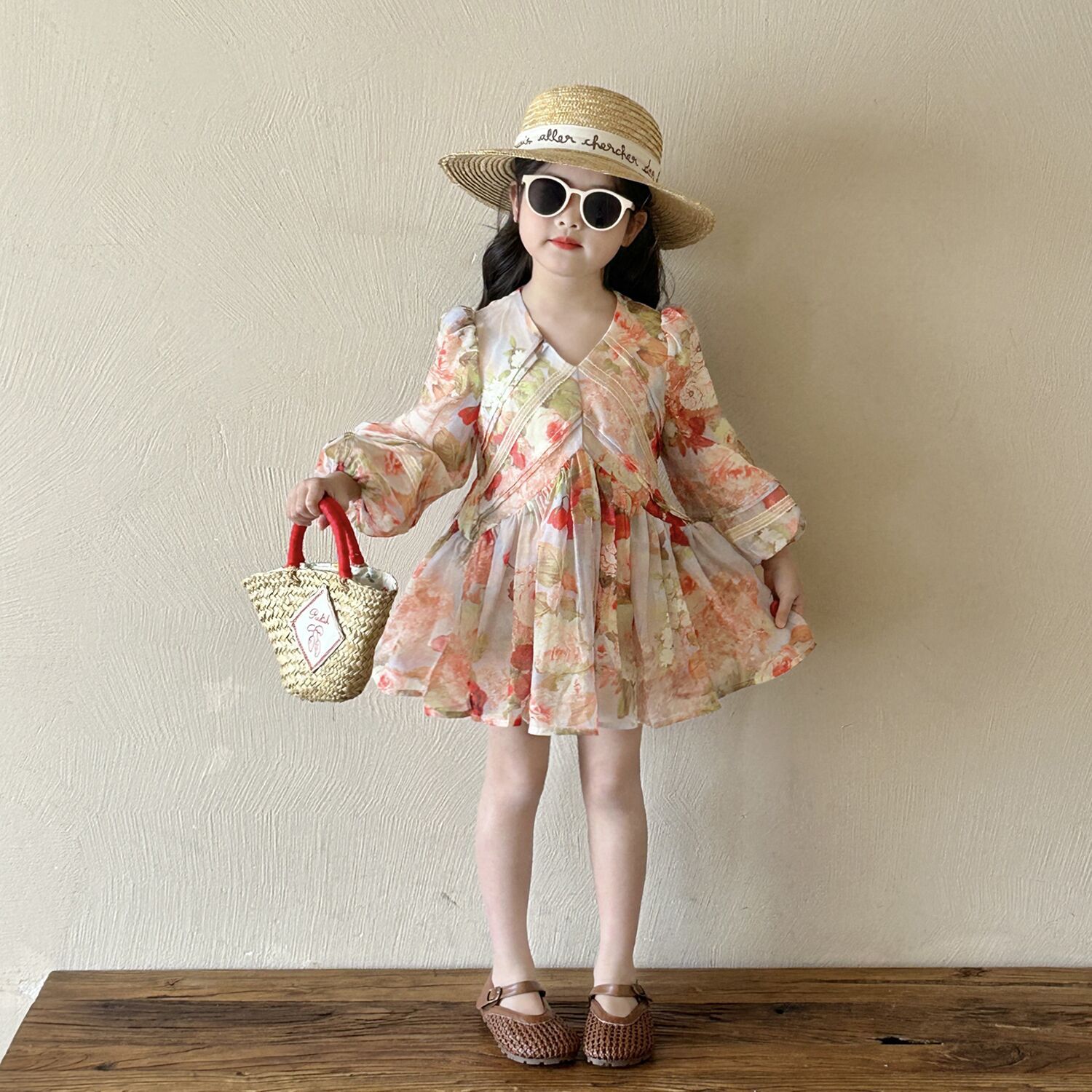 여아 브이넥 꽃무늬 긴팔 원피스 2025 가을 신상 여아 프렌치 시골풍 퍼프 소매 공주 드레스스토어 가기