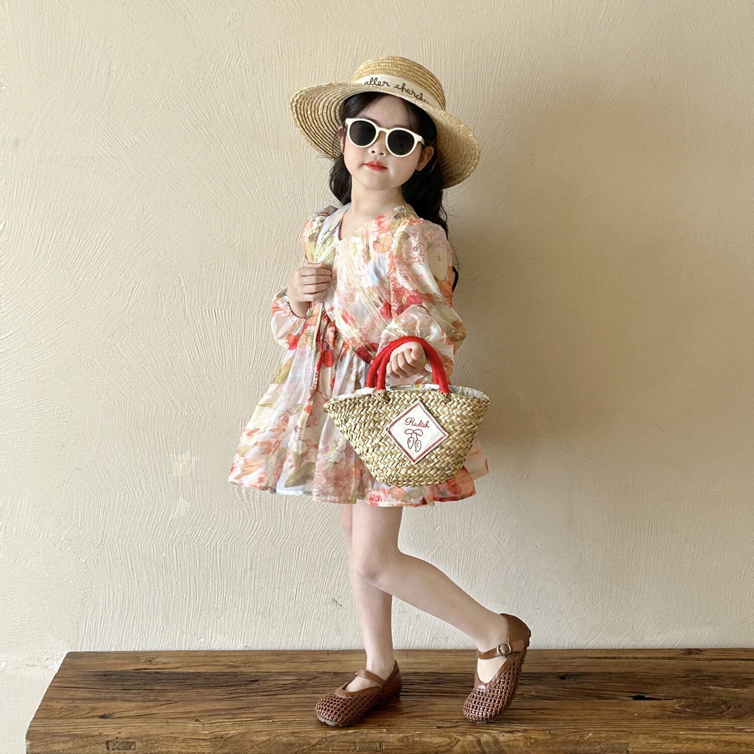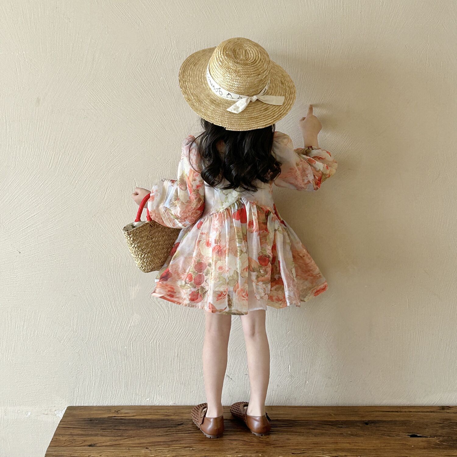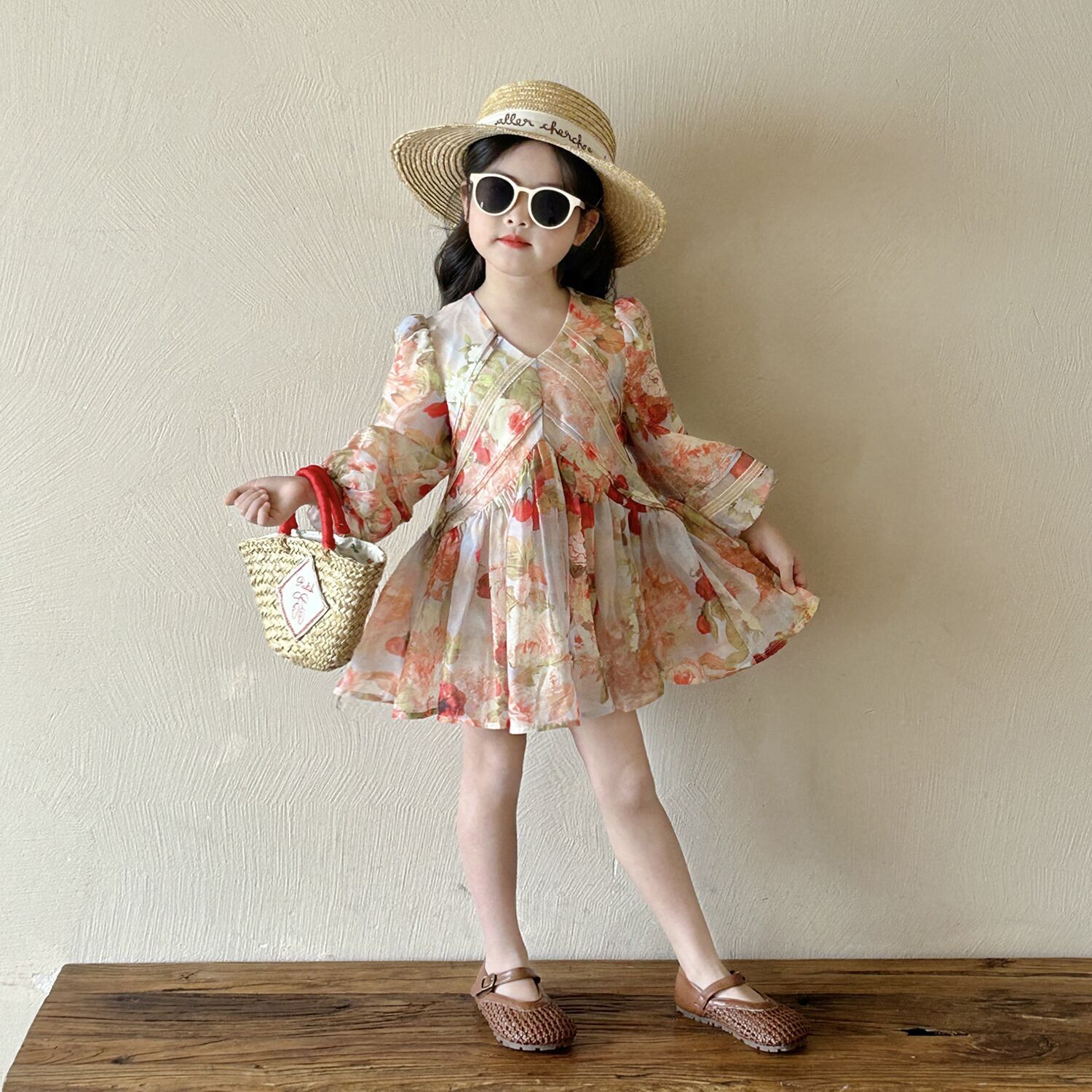 여아 브이넥 꽃무늬 긴팔 원피스 2025 가을 신상 여아 프렌치 시골풍 퍼프 소매 공주 드레스스토어 가기