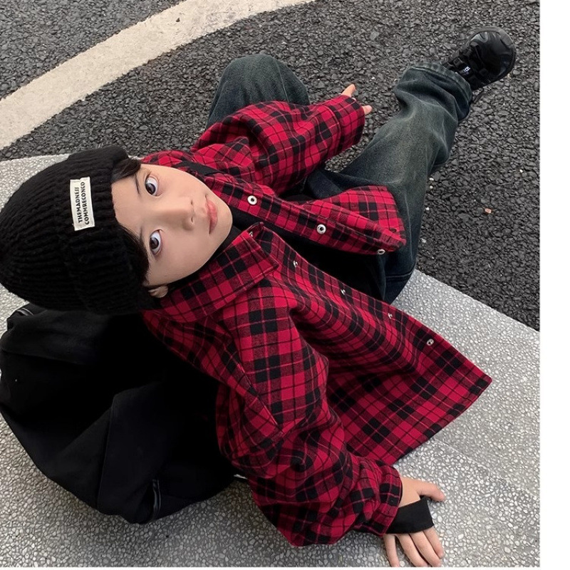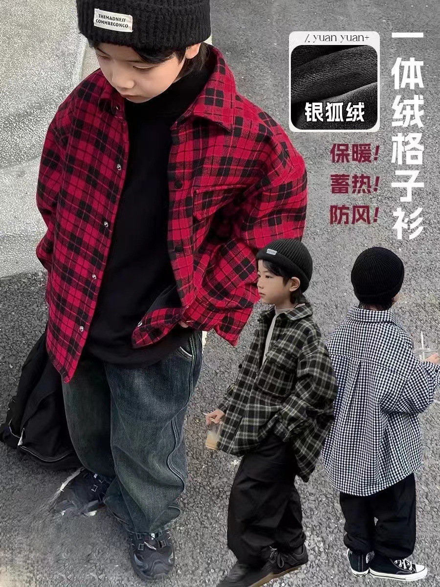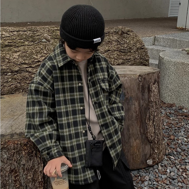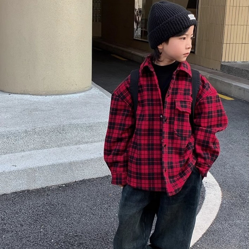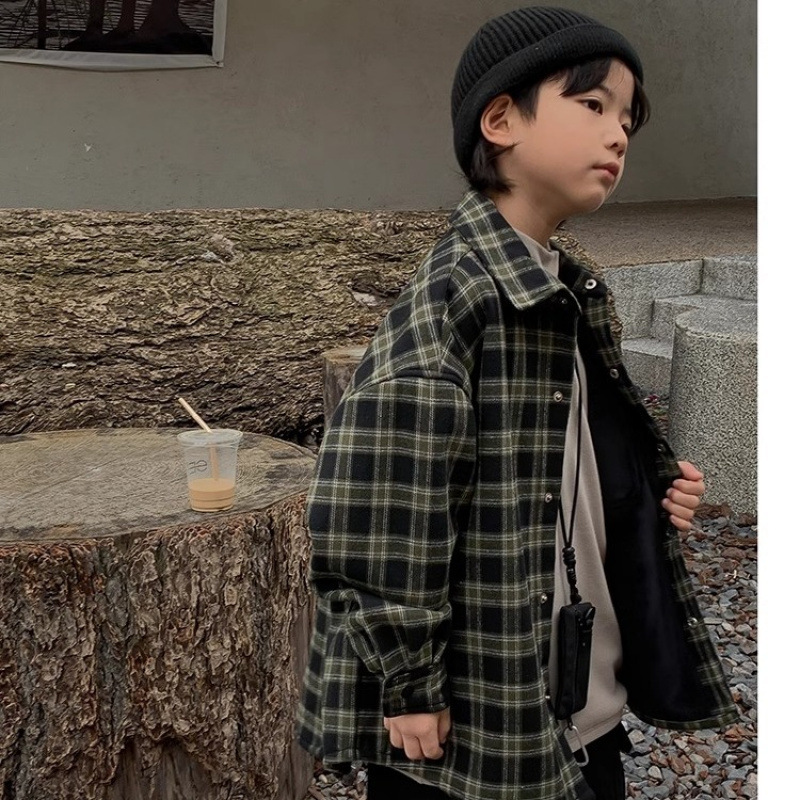 소년의 기모 격자 무늬 셔츠 재킷 봄과 가을 2024 새로운 가을과 겨울 어린이 옷깃 상단 긴 소매 셔츠스토어 가기
