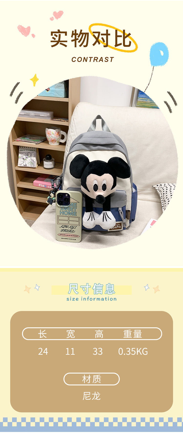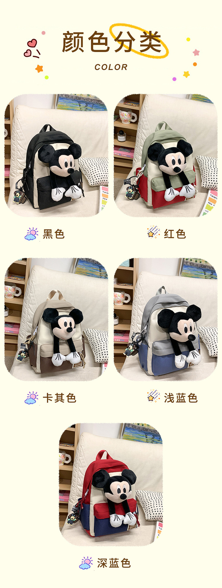 새로운 2024 만화 인형 어린이 배낭 귀여운 배낭 캐주얼 스쿨백 유치원 미키 배낭